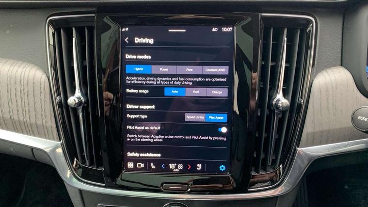 12.3" Progressive Driver Display, 9" centre console touch screen, Adjustable steering wheel force, Bluetooth Handsfree Phone Connection, Drive mode settings, E-call, Google automotive services - Enabled entertainment apps, navigation with google maps, voice recognition with google assistant, Handsfree bootlid opening/closing, Lane keep assist with driver alert control, Oncoming Lane Mitigation, Power operated tailgate, Speed limiter, Speed sensitive steering, Volvo on call, 7m 10amp charge cable with 3 pin plug and 7m 1 phase 16amp type 2/mode 3 charge cable, 8 speed automatic transmission with start/stop + manual change functions, Electric rear axle drive, Lithium-ion battery, Recharging port located in nearside front wing, DAB Radio (Digital Audio Broadcasting), Steering wheel remote infotainment controls, Adaptive brake lights with high level LED brake lights, Auto dimming interior + exterior mirrors, Automatic headlamp levelling, Automatic LED Headlights + Active high beam incorporating daytime running lights, Chrome front lower bumper, Chrome lower door mouldings, Chrome window surround, Colour coordinated auto folding and heated power door mirrors, Front and rear power windows, High gloss black front grille with chrome inserts, Home safe and approach lighting, Integrated roof rails in silver, Laminated rear and side windows, Puddle lights in exterior door handles, Rain sensor with automatic windscreen wiper activation, Rear LED lights with sequential indicators, Rear side wing doors, Rear wiper, Roof antenna, Roof spoiler, Visible VIN plate, 2 zone electronic climate control with Clean zone air quality system + pollen filter, 3 seat bench in 2nd row, 3 Spoke tailored steering wheel with chrome trim, A-pillar parking ticket holder, Ambient door and instrument panel lighting, B Pillar ventilation, Bright metal luggage threshold, Cargo divider with grocery bag holder, Center Console Cupholders and Storage, Driver's side lower dashboard storage compartment, Extended front seat cushions, Front 12V socket tunnel console and cargo area, Front centre armrest storage illumination, Front footwell and side step illumination, Front head restraints, Front/rear door pockets and front cupholder illumination, Front/rear reading lights, Heated front seats, Height/reach adjustable steering column, Illuminated glovebox, Illuminated luggage compartment, Illuminated tailgate, Illuminated vanity mirrors + ticket holder, Integrated sun curtains in rear doors, Isofix system on outer rear seats, Load cover, Load protection net, Luxury floor mats, Off-black finish in steering wheel, Orrefors Crystal gear lever knob, Power driver seat with memory for seat and exterior mirrors, Power Folding Rear Seat Backrests and Headrests, Rear armrest with storage + cupholders, Rear footwell and side step illumination, Recharge aluminium tread plates, Single passenger seat, Ski hatch, Underfloor cargo storage, Versatile split folding rear seat - 60/40, Driver assist pack - V90, Seat pack - V90, 3x3 point rear seatbelts, Active bonnet, City safety with steering support with Pedestrian + cyclist + front collision warning with full auto brake and rear auto brake, Drivers knee airbag, Dual stage driver/passenger airbags, Front seats SIPS airbags, Hill start assist, IC (Inflatable Curtains) - Full Length, Passenger airbag cut-off device, Power parking brake with auto hold function, Road sign information display, Run off Road Mitigation, Run off Road Protection, Seatbelt reminder and pretensioners for all seats, SIPS (Side Impact Protection System), Slippery road and hazard light alert, Stability and Traction Control with Spin control, Engine Drag Control and Corner Traction Control, Tyre pressure monitoring system, Vehicle deceleration control with Anti-lock Brake System, Electronic Brake Distribution and Emergency Brake Assist, Warning triangle and first aid kit, WHIPS whiplash protection system - front, Anti-theft alarm including immobiliser/volume sensor + level sensor, Care key with user defined top speed, Key integrated remote control central locking + fuel flap with deadlocking system and auto open/close power windows, Keyless drive with Keyless entry and start, Locking wheel nuts, Private locking for tailgate, Tailored Instrument Panel and Door Tops with Contrast Stitching, Tyre sealant kit and compressor,