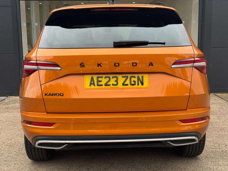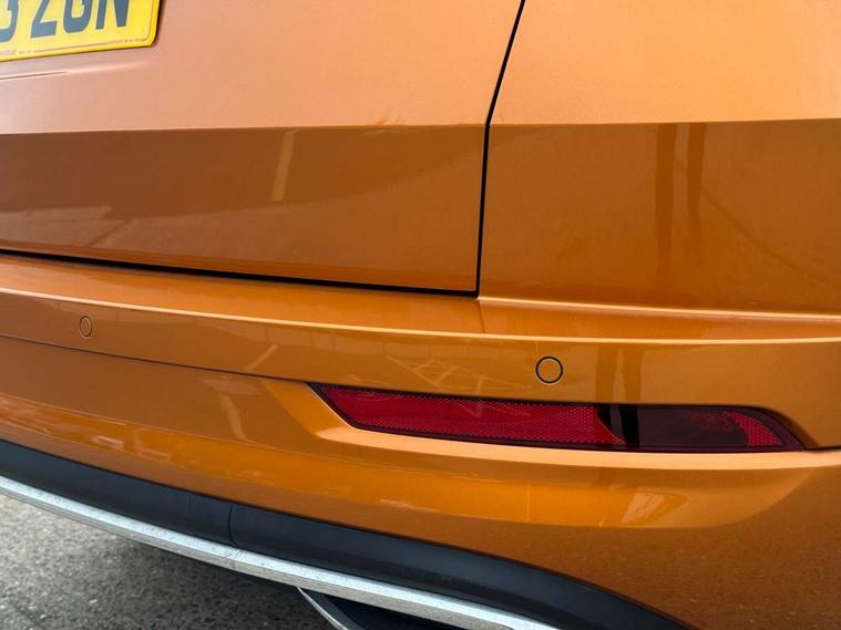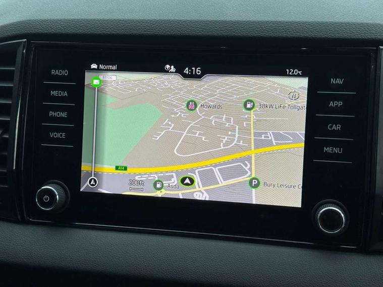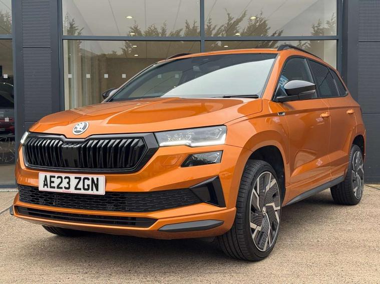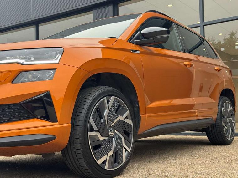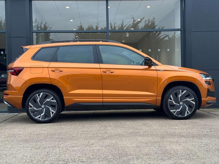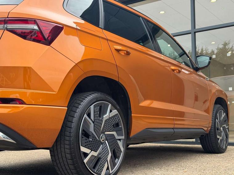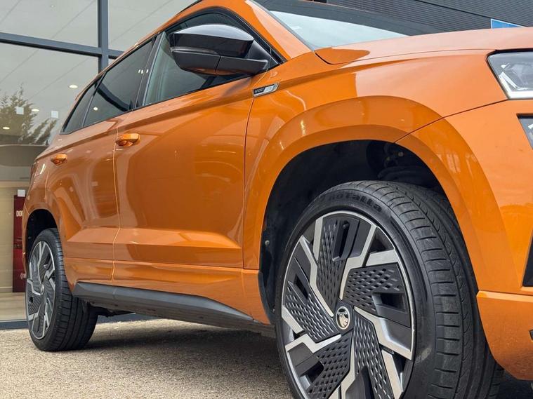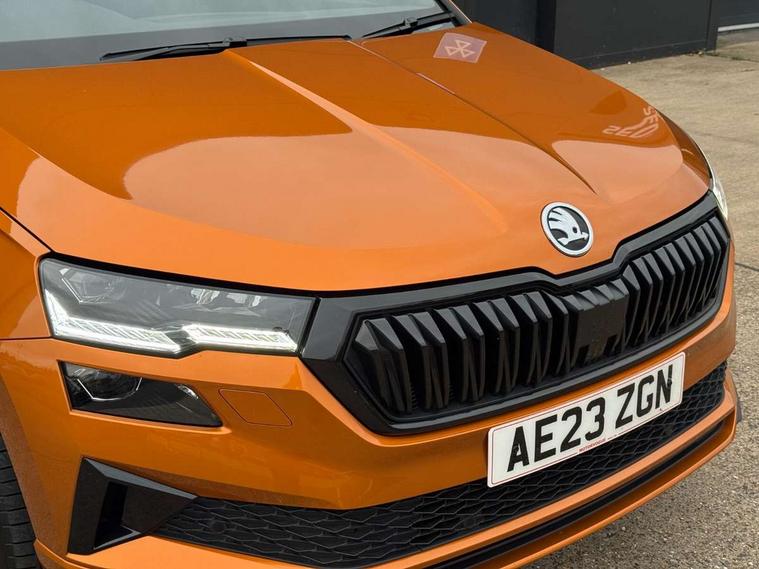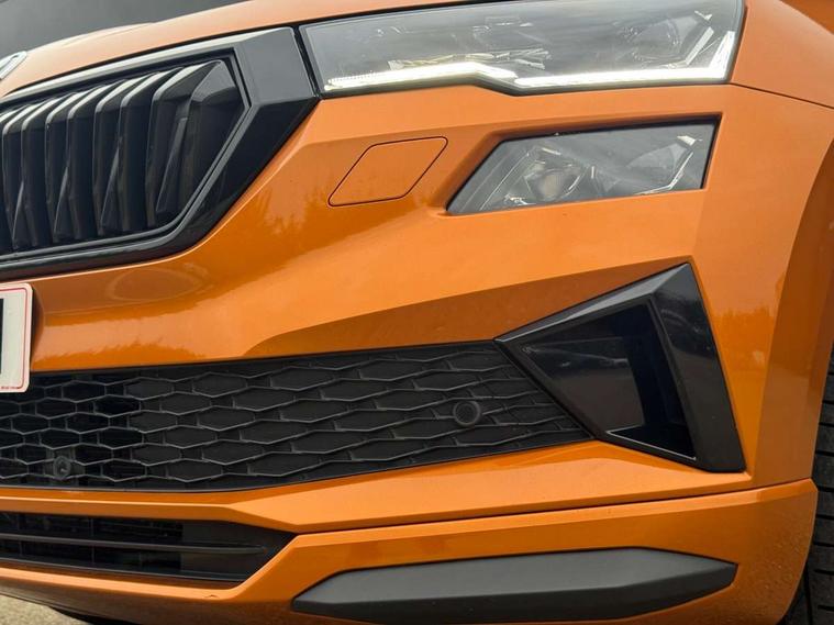 8" Digital display, Care connect, Driver fatigue sensor, Emergency services call system, Outside temperature gauge, Service interval indicator, SmartLink wireless for Apple and wired for Android, Start/stop system with regenerative braking, USB C Port x 2 in front centre console, Virtual cockpit, Virtual pedal with electrically operated boot door, 8 Speakers, DAB radio with Bluetooth, USB connection, Acoustic glass, Aero front windscreen wipers with intermittent function, Auto dimming rear view mirror with light and rain sensors, Black door mirrors, Black electric window control buttons, Black radiator grille, Black roof rails, Body colour door handles, Dynamic headlight range control with cornering light function, Electric front and rear windows with child proof lock, Front door steps with SportLine logo, Heated rear windscreen, LED daytime running lights, LED rear lights with high functionality welcome effect and dynamic indicators, Light assistant (coming/leaving home/tunnel light), Panoramic sliding sunroof, Plastic scuff plates, Privacy glass, Protective door side sills in body colour, Rear diffuser, Rear side wing doors, Rear spoiler, Rear window wiper with washer system and intermittent control, Safety reflectors on front doors, Skoda lettering on tailgate in black, Sportline badge on front fender, Sportline decorative inserts with badging, Sports front and rear bumpers, 1.5 litre bottle holders in driver and front passenger door panels, 12V socket in boot, 12v socket in front centre armrest with storage compartment and rear air vents, 2 Folding hooks and nets in boot, 3 rear height adjustable headrests, 3 seat bench in 2nd row, 3 spoke leather sports multifunction steering wheel and silver stitching with gear shift paddles, 4 foldable roof handles with rear coat hooks, Black floor carpet, Black roof headlining, Chrome inner door handles, Double sided boot floor, Foldable hooks in the boot, Front head restraints, Height adjustable front three point seats belts with tensioners, Height/reach adjust steering wheel, Ice scraper, Illuminated glovebox, Illuminated luggage compartment, Isofix child seat preparation outer rear, Manual lumbar support for front seats, Pen holder, Pollen filter, Rear boot cover, Rear reading lights, Rear seats fixed folding and divided 60:40, Rubbish bin door, Safety vest holder, Single front passenger seat, Storage box in upper central dashboard closed, Sunvisors with illuminated vanity mirrors, Textile floor mats, Ticket holder, Titan black interior ceiling, Welcome animation with sportline logo, Light Pack - Karoq, Parking pack - Karoq, Automatic door unlocking in case of crash, Automatic fuel cut off in case of crash, Child locks on rear doors, Driver airbag, Electronic parking brake with auto hold function, Emergency rear braking signal, ESC including ABS, MSR, ASR, EDS, HBA, DSR, RBS, MKB and traction control, Front side airbags, Hill hold control, Knee airbags, Passenger airbag with switch-off function, Pedestrian monitor, Seatbelt reminder signalisation and pretensioner for all seats, Three point seatbelts rear, Two tone horn, Tyre pressure display, Tyre pressure monitor, Alarm with interior monitoring, back up horn and tilt sensor with safe function, Electronic engine immobiliser, Keyless entry and start/stop, Remote central locking with 2 remote folding keys, Black air vent surround, Black centre console, Satin black dashboard, Satin black door trim, 19" Vega black polished alloy wheels, Anti-theft wheel bolts protection, Matt black aero hub caps, Storage on wheel cover, Tool kit,