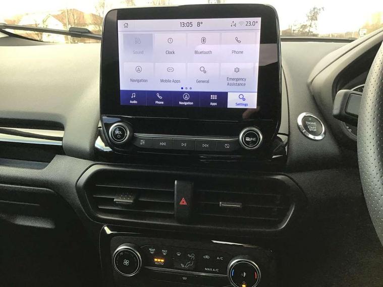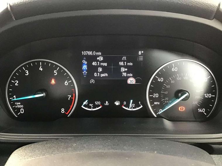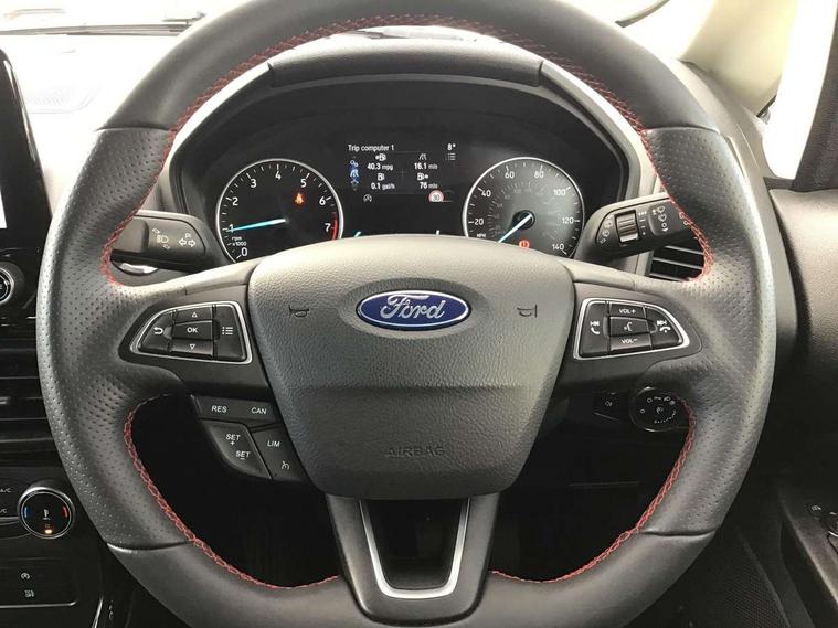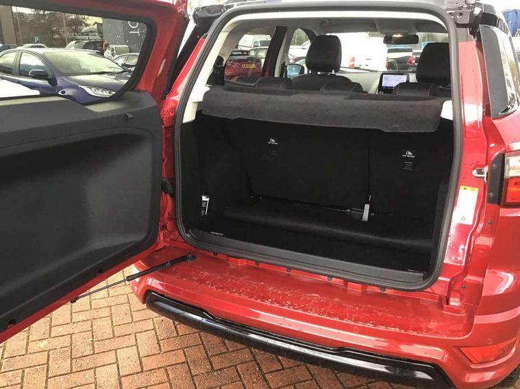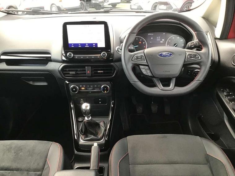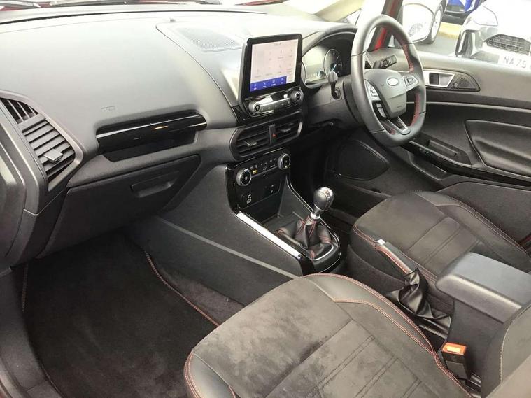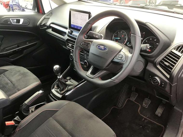 Cruise control, e-Call (emergency call), Easy fuel capless refuelling system, Ford SYNC 3 nav system with DAB radio, 8" screen, emergency assistance, Apple car play/Android auto, 2x USB, 6 speakers, Ford pass connect, Intelligent speed limiter, PAS, Rear parking sensors, Rear view camera, Traffic sign recognition, Trip computer, Sports suspension, Steering wheel mounted audio controls, Auto dimming rear view mirror, Automatic front wipers, Automatic headlights, Black roof rails, Body colour door handles, Body coloured bumpers, Chrome lower window surround, Electrically adjustable and heated door mirrors, Front fog lights, Front grille bars and surround in black, Headlight levelling control, Large rear roof spoiler, LED day running lights, LED third brake light, Power front and rear windows, Puddle lights, Quick-clear heated windscreen, Rear side wing doors, Rear wiper, ST Line body styling kit - Black headlamp bezel, front and rear sport bumpers, body colour lower door claddings, 12V socket in front and rear, 3 seat bench in 2nd row, 60/40 split rear seats, Ambient lighting, Centre console with sliding front armrest, Cooled glovebox, Courtesy lights with map reading light, Driver seat height/lumbar adjust, Driver's side glovebox, Driver/passenger sunvisors and lidded vanity mirrors, EATC - Electronic Auto Temperature control, Folding grab handles, Front head restraints, Front seat back map pockets, Illuminated glovebox, Illuminated luggage compartment, Isofix system on outer rear seats, Luggage compartment carpet, Neosuede/Partial sensico leather upholstery, Overhead console with sunglasses holder, Rake adjustable rear seats, Reach + rake adjustable steering column, Rear headrests, Sensico trimmed steering wheel, handbrake and gearshift gaiter with red stitching, Single front passenger seat, ST-Line Front floor mats with red stitching, Stainless steel sports pedals, Storage drawers under front seats, Tie down hooks, Variable boot floor, 3x3 point rear seatbelts, ABS, Autonomous emergency braking, Child locks on rear doors, Curtain airbags, Driver airbag, Drivers knee airbag, Electronic Stability Programme with hill launch assist, Front passenger airbag deactivation, Front side airbags, Passenger airbag, Pre collision assist system with AEB, Seatbelt reminder for driver and front passenger, Traction control, Tyre pressure monitoring system, Immobiliser, MyKey system, Remote central locking, Thatcham 1 volume sensing alarm, Low rolling resistance tyres, Tyre inflation kit,