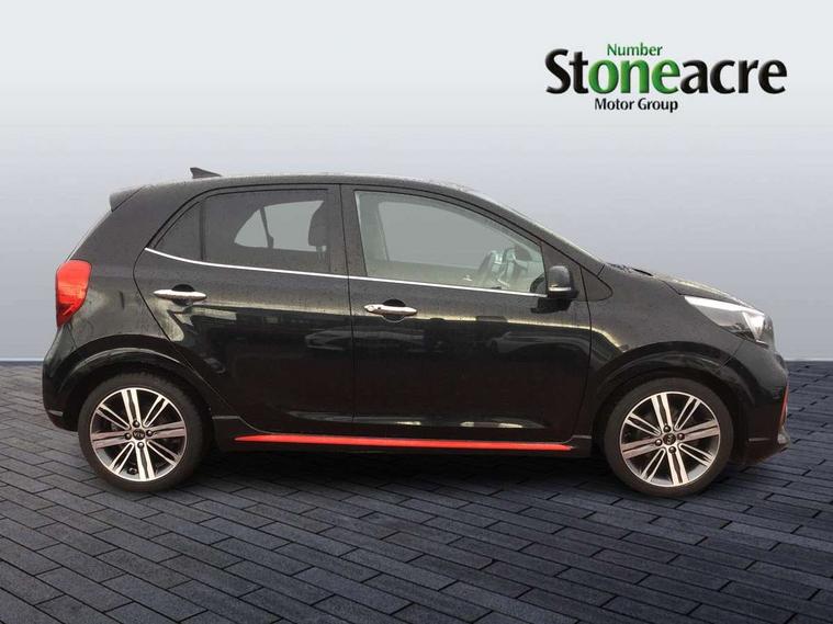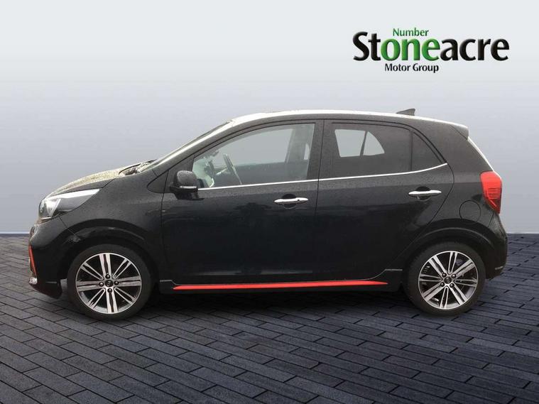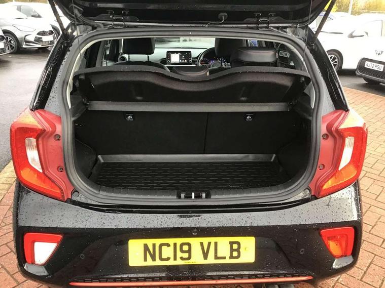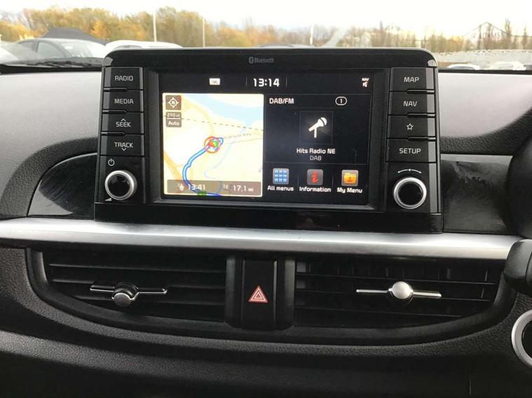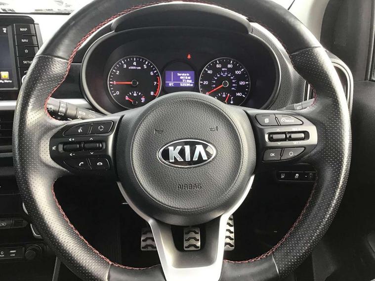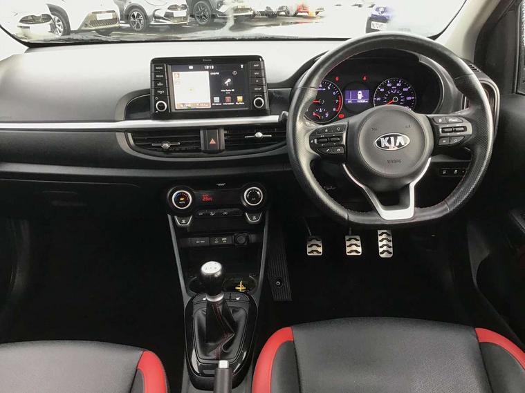 7" Touch screen satellite naviagtion with RDS and DAB, Apple car play/Android Auto with voice control, Cruise control + speed limiter, Digital clock, Emergency stop signalling system, External temperature gauge, Kia connected services, Motor driven power steering, Rear parking sensors, Reversing camera system with dynamic guidelines (Integrated into centre fascia screen), Tachometer, Trip computer, Wireless Smartphone charger, 6 speaker audio system, Bluetooth with music streaming, Steering wheel mounted controls, USB and auxiliary socket, Automatic headlights, Bi-function projection headlights, Black radiator grille with chrome surround, Body colour bumpers, Body colour side sill mouldings, Body coloured mirrors and chrome exterior handles, Chrome side window trim, Day/night rear view mirror, Electric adjustable/heated/folding door mirrors with LED indicators lights, Electric sunroof, Front and rear electric windows with drivers's auto up/down function, Front fog lights, Headlamp levelling, Heated rear window, High mount brake light, LED daytime running lights, LED rear lights, Privacy glass - Rear windows and tailgate, Rear fog lights, Rear wash/wipe, Sports bumpers, Tinted glass, Twin exhaust pipes, Variable front intermittent wipers, Visible VIN plate, Welcome and follow-me home light functionality, 12V power point front, 3 x passenger assist grips, 60/40 split/folding 2nd row of seats, All round height adjustable headrests, Aluminium pedals, Automatic air conditioning, Black and red accents front door armrest, Centre Console with Storage Box and Sliding Armrest, Coat hooks, Cupholders in centre console, Driver and front passenger sunvisors with driver's side illuminated vanity mirrors, Driver seat height adjust, Dual Height Luggage Area Floor, Faux leather upholstery, Front cabin lights, Glovebox, Heated front seats, Heated steering wheel, High gloss lower centre fascia trim, door armrest and air vents, ISOFIX Child seat top tethers and anchor fixings, Leather trimmed gearshift, Leather trimmed steering wheel, Luggage area light, Luggage area parcel shelf, Luggage net with hooks, Passenger front seatback pockets, Satin chrome interior door handles, Slide/reclining front seats, Tilt adjustable steering wheel, Advanced Driver Assistance Pack - Picanto, 3x3 point rear seatbelts, ABS/EBD, Automatic unlocking of doors in case of impact, Dual front airbags, ESC + BAS + VSM + HAC, Front seatbelt height adjusters, Front seatbelt pretensioners + load limiters, Height adjustable front seatbelt anchors, Passenger airbag deactivate switch, Rear child proof door locks, Seatbelt warning, Side impact protection, Traction control, Twin curtain airbags, Twin front side airbags, Tyre pressure monitoring system, Anti theft alarm, Engine immobiliser, Locking wheel nuts, Smart key with engine start/stop button, High gloss black centre fascia, 16" alloy wheels, Tyre mobility kit,