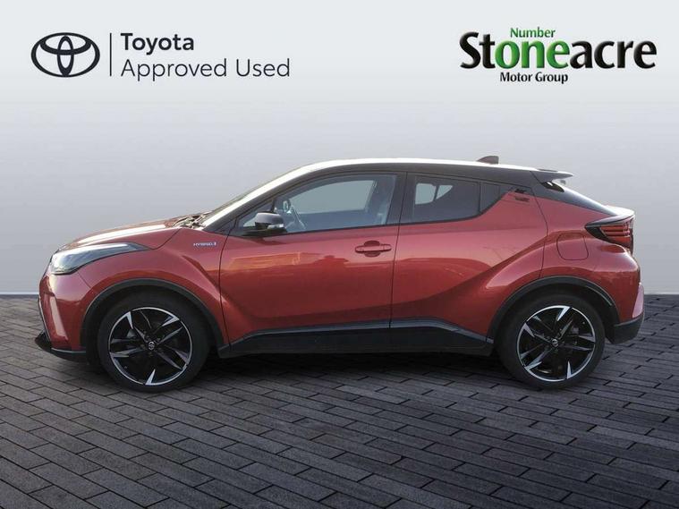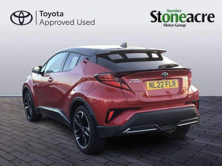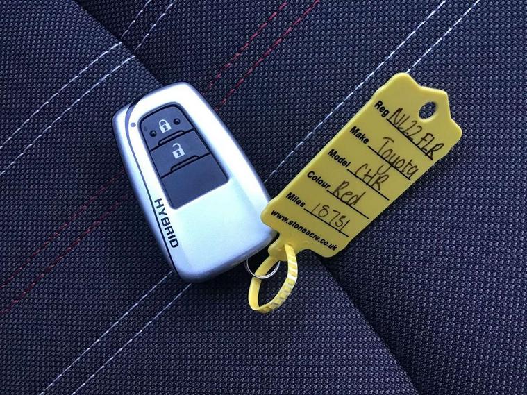 Black lower dashboard, Black upper dashboard, Piano black console, Silver deco line on upper dashboard, Tech with parking sensor pack - C-HR, 19" Black machined alloy wheels, Tyre repair kit, Acoustic vehicle alert system (AVAS), Glass-breaking alarm sensors, Immobiliser, Intrusion alarm, Intrusion sensor, Motion sensor alarm, Power passenger window lock, Remote central locking, 6 speakers, AM/FM radio, DAB Radio (Digital Audio Broadcasting), Toyota touch 2 multimedia system with 8" display, USB connector, Wi-fi connectivity, 16 Disk front wheel brake, 3x3 point rear seatbelts, ABS+EBD+Brake assist, Electronic parking brake, Front and rear seatbelt reminder, Front passenger airbag on/off switch, Hill start assist control (HAC), Pre collision system with pedestrian detection, Pre-tensioners and force limiters, Rear door child safety locks, SRS Airbags - Driver + Front passenger, front side, front and rear curtain and driver's knee airbags, Toyota safety sense, Tyre pressure monitoring system, Adaptive front light system, Adaptive LED Headlights, Anti-jam protection on power windows, Auto high beam, Auto up and down function on all power windows, Automatic headlight levelling, Automatic headlights, Automatic headlights cut-off, Black and body coloured rear bumper, Black upper front grille, Body colour door handles, Body colour door mirrors, Body coloured front bumper, Boot door release with push button, Chrome front lower bumper, Electric heated door mirrors, Follow me home headlights, Front and rear power windows, Front spoiler lip in black, Hard tonneau cover, Honeycomb lower front grille, LED daytime running lights, LED fog lights, LED front light guide, LED High mounted stop light, LED rear brake lights, LED rear combination lights, Noise reduction layer on front windows and windscreen, Power adjustable door mirrors, Privacy glass, Rain sensor, Rear sequential indicators, Rear side wing doors, Rear spoiler, Rear tailgate, Rear window defogger, Rear window wiper, Shark fin antenna, UV-filter on driver and passenger windows, UV-filter on rear windows, 12v power outlet - front, 3 rear headrests, 3 seat bench in 2nd row, 3 spoke perforated leather steering wheel, 60/40 split folding rear seat, Adjustable rear headrests, Adjustable speed limiter switch on steering wheel, Assist grips front and centre pillar, Audio and telephone switches on steering wheel, Black front door assist grips, Blue ambient lighting on front cup holders, Blue ambient lighting on front doors, Boot light, Chrome interior door handles, Driver and front passenger personal light, Driver and front passenger Whiplash Injury Lessening seats, Driver and passenger seatback pockets, Dual zone automatic air conditioning, Fabric upholstery, Floor mats, Front cupholders, Front head restraints, Front sports seats, Glovebox with internal light, Heated driver and front passenger seats, Hooks for luggage holding net, Humidifying Nanoe air purifier, Illuminated entry system, Isofix attachments on rear seats, Leather gearshift, Light on driver sun visor, Light on passenger sun visor, Manual telescopic steering wheel, Manual tilt steering wheel, Manually height adjustable driver seat, Manually height adjustable front passenger seat, Manually reclining driver seat, Manually reclining front passenger seat, Manually sliding driver seat, Manually sliding front passenger seat, Microphone on front personal light, Mirror on driver sun visor, Mirror on passenger sun visor, Multimedia switches on steering wheel, Pollen filter, Power adjustable lumbar support on driver seat, Shopping bag hooks, Single front passenger seat, Slow opening on lower glovebox, Voice recognition switch on steering wheel, 4.2" coloured TFT screen for multi-information display, Adaptive cruise control, Bluetooth connectivity, E-call, Electric power steering, Hybrid system indicator, Lane departure alert with steering control, Remote boot door release in cabin, Remote boot door release in key, Reversing camera, Road sign assist - RSA, Simple Intelligent parking assist, Touch 2 Go navigation system, Trip computer, Voice recognition, Vehicle Stability Control (VSC),