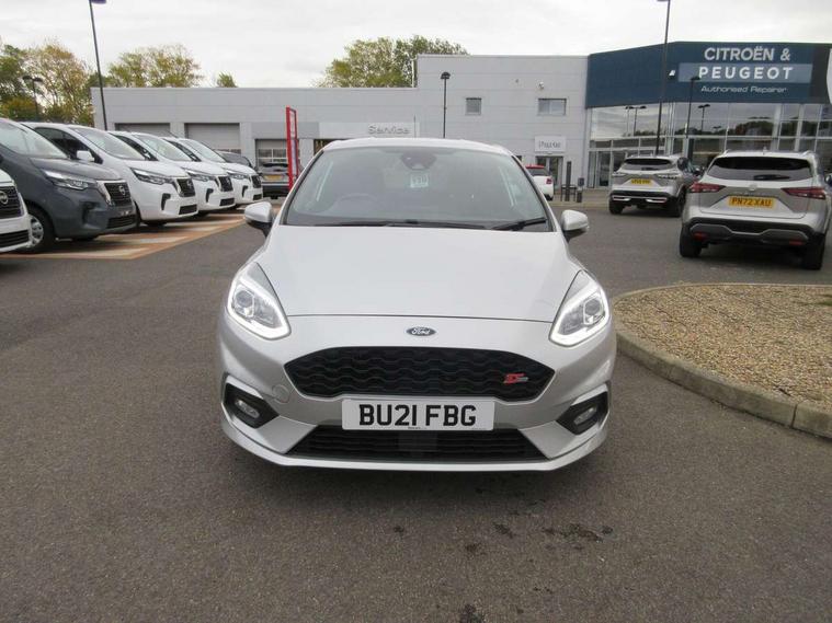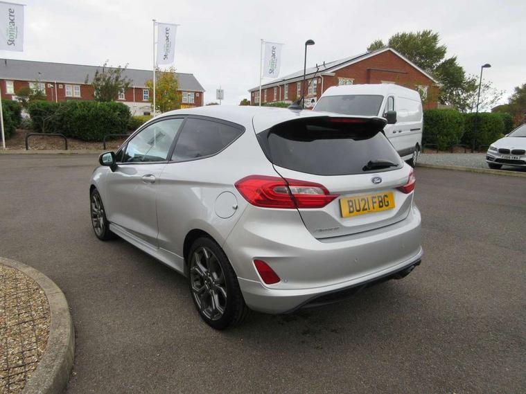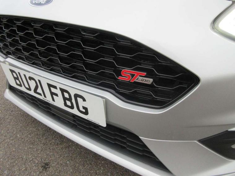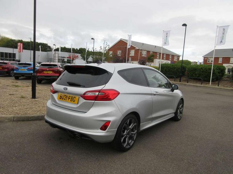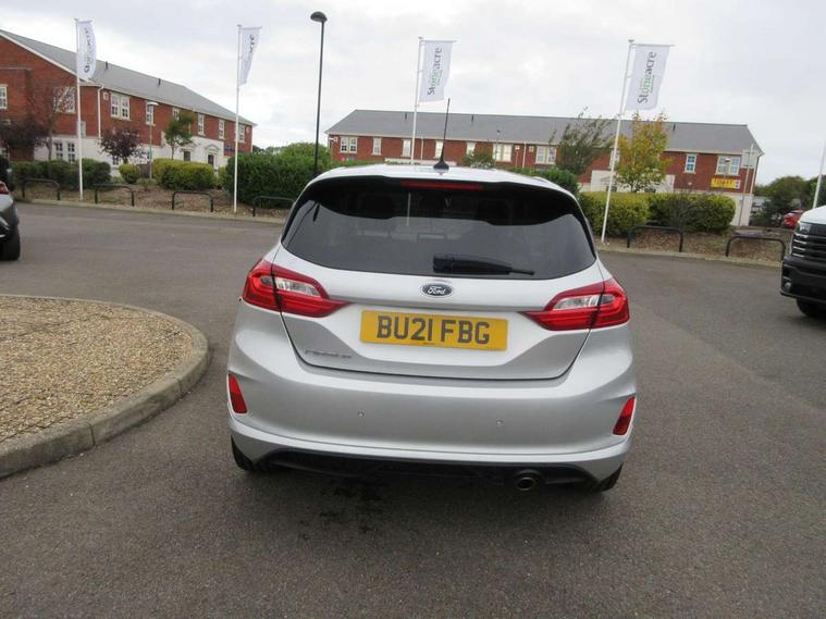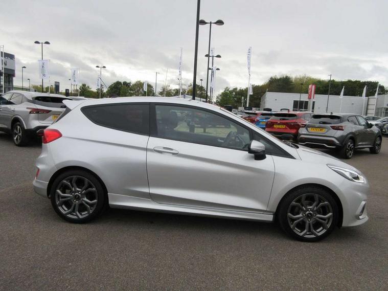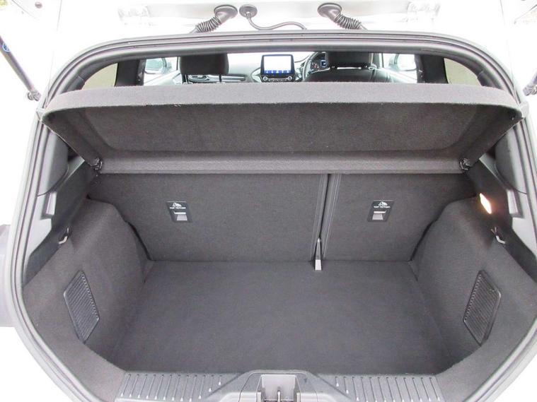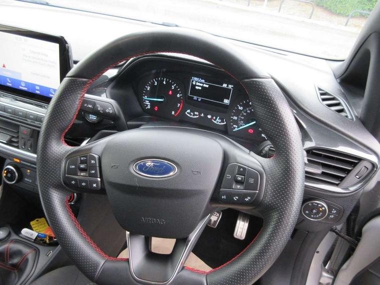 Bluetooth system, Electric power steering, Ford easy fuel, Ford SYNC 3 Navigation system incl 8" touchscreen, 7 speakers, FordPass connect, Apple carplay, android auto, voice control and emergency assistance, Rear parking distance sensors, Trip computer, Sports suspension, 2 USB ports, Auxiliary input socket, DAB Digital radio, Steering wheel mounted controls, Body colour bumpers, Body colour door handles, Body colour large rear spoiler, Body coloured electrically operated and heated door mirrors with side indicators, Cornering front fog lights, Electric front windows/one touch facility, LED Night signature to rear lights, Power foldable door mirrors with puddle lights, Quickclear heated windscreen, Rain sensing wipers and auto dimming rear view mirror, Rear privacy glass, Rear wiper, Unique ST-Line upper grille & full bodystyling kit with ST-Line wing badges, 12V Accessory socket in centre console, 3 spoke flat bottomed leather steering wheel, 60/40 split folding rear seat, Adjustable head restraints, Black headlining, Boot carpet, Centre console with armrest and illuminated cupholders, Chrome inner door handles, Cloth upholstery, Footwell illumination, Front floor mats, Front map reading lights, Front seat and rear pockets, Height adjustable driver's seat, Illuminated glovebox, LED ambient lighting, Load area light, Manual air conditioning, Overhead console with sunglasses holder, Pollen filter, Rake/reach adjustable steering wheel, Sensico leather steering wheel/gear knob/handbrake, Sports front seats, Sports pedals, NCAP Pack - Fiesta, 3 point seatbelts on all rear seats, ABS+EBA, Curtain airbags, Driver and passenger airbags, Drivers knee airbag, Electronic stability control with hill start assist, Front passenger airbag deactivation, Front side airbags, Seatbelt warning, Two tone horn, Tyre pressure monitoring system, Keyless start with 'Ford Power' starter button, MyKey system, Remote central locking & engine immobiliser, Thatcham Cat.1 alarm, 17" 5 spoke alloy wheels with rock metallic finish,