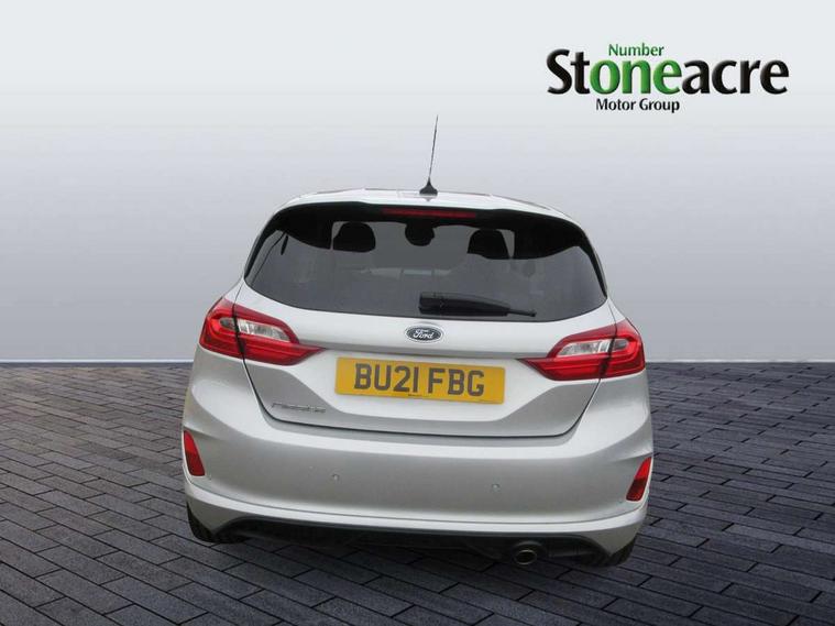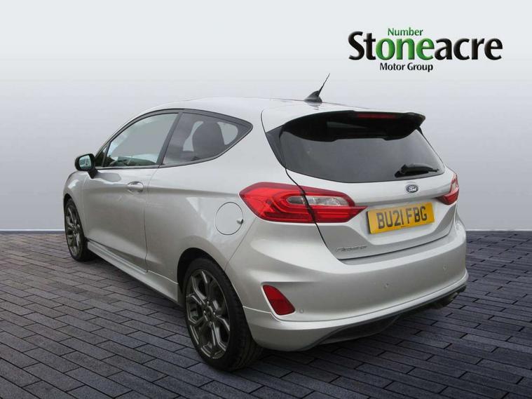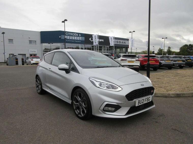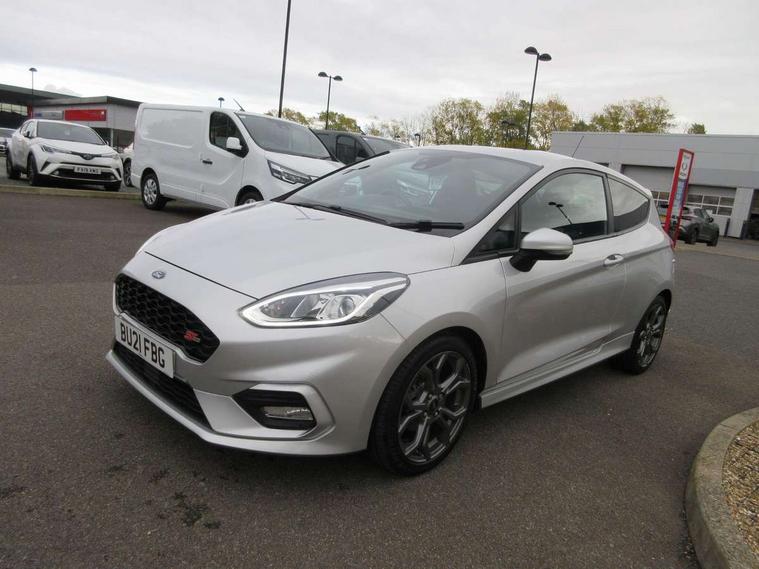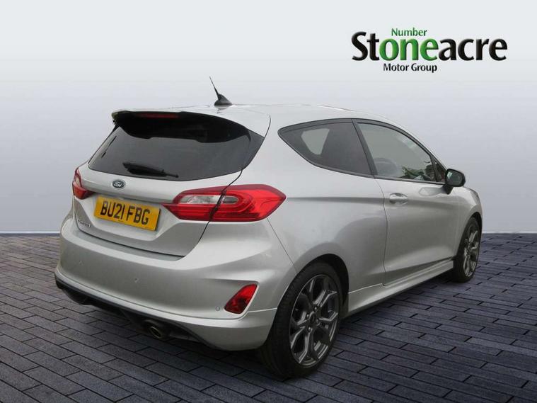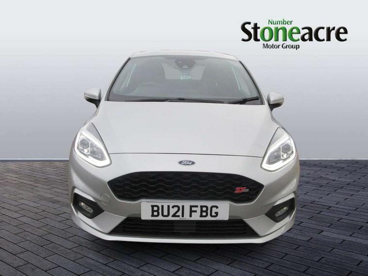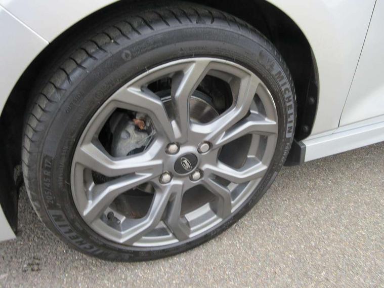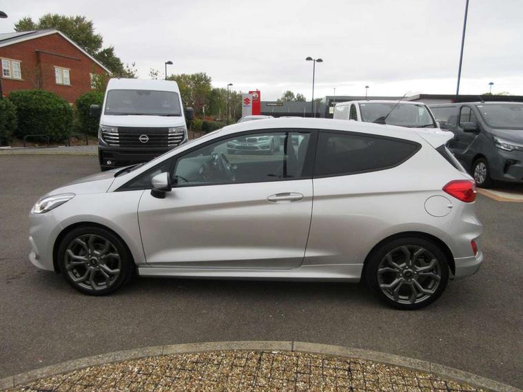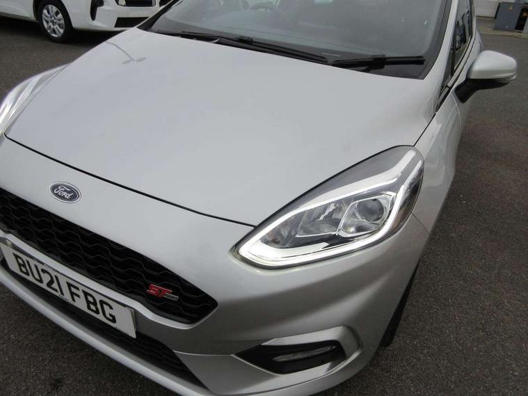 Bluetooth system, Electric power steering, Ford easy fuel, Ford SYNC 3 Navigation system incl 8" touchscreen, 7 speakers, FordPass connect, Apple carplay, android auto, voice control and emergency assistance, Rear parking distance sensors, Trip computer, Sports suspension, 2 USB ports, Auxiliary input socket, DAB Digital radio, Steering wheel mounted controls, Body colour bumpers, Body colour door handles, Body colour large rear spoiler, Body coloured electrically operated and heated door mirrors with side indicators, Cornering front fog lights, Electric front windows/one touch facility, LED Night signature to rear lights, Power foldable door mirrors with puddle lights, Quickclear heated windscreen, Rain sensing wipers and auto dimming rear view mirror, Rear privacy glass, Rear wiper, Unique ST-Line upper grille & full bodystyling kit with ST-Line wing badges, 12V Accessory socket in centre console, 3 spoke flat bottomed leather steering wheel, 60/40 split folding rear seat, Adjustable head restraints, Black headlining, Boot carpet, Centre console with armrest and illuminated cupholders, Chrome inner door handles, Cloth upholstery, Footwell illumination, Front floor mats, Front map reading lights, Front seat and rear pockets, Height adjustable driver's seat, Illuminated glovebox, LED ambient lighting, Load area light, Manual air conditioning, Overhead console with sunglasses holder, Pollen filter, Rake/reach adjustable steering wheel, Sensico leather steering wheel/gear knob/handbrake, Sports front seats, Sports pedals, NCAP Pack - Fiesta, 3 point seatbelts on all rear seats, ABS+EBA, Curtain airbags, Driver and passenger airbags, Drivers knee airbag, Electronic stability control with hill start assist, Front passenger airbag deactivation, Front side airbags, Seatbelt warning, Two tone horn, Tyre pressure monitoring system, Keyless start with 'Ford Power' starter button, MyKey system, Remote central locking & engine immobiliser, Thatcham Cat.1 alarm, 17" 5 spoke alloy wheels with rock metallic finish,