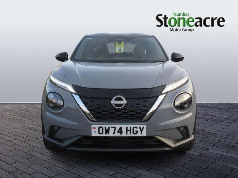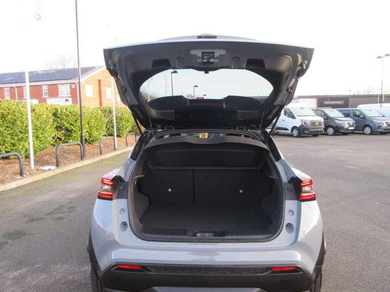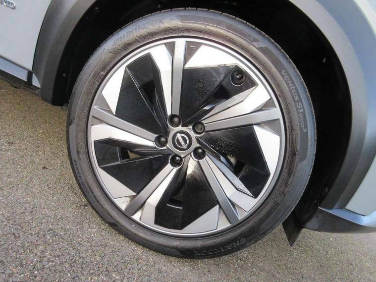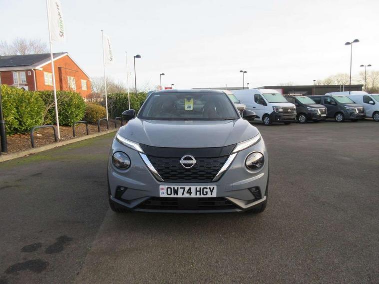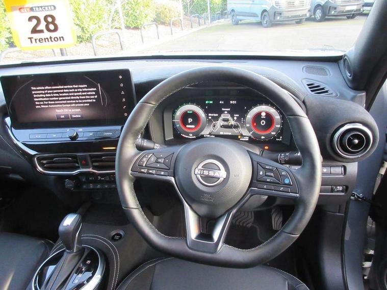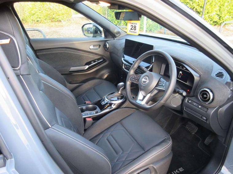 12.3" full colour TFT screen combimeter, Drive modes select (Eco, normal and sport), e-Pedal step, Emergency and breakdown call, EV mode switch, Front parking sensor, Intelligent driver alert system, Intelligent lane intervention, Lane departure warning system, Nissan connect 12.3" touch screen entertainment system, Nissan connect nav with TomTom traffic, Nissan connect services, Outside temperature sensor, Power Steering, Rear parking sensor, Stop/start button, Traffic sign recognition, Trip computer, Voice recognition, WiFi connectivity, Wireless Apple CarPlay and Google Android auto, Wireless Smartphone charger, 10 Bose speakers 6 speakers and 2 headrest speakers for driver/passenger seats, 2 X Rear console USB port, Bluetooth system, USB, Aux-in and 12V socket, Bose personal sound stage control, DAB Digital radio, Auto dimming frameless rear view mirror, Automatic hazard signal with emergency stop signal, Body colour door handles, Electrically adjustable door mirrors with integrated indicators, Follow me home headlights, Front and rear electric window with one touch driver window, Heated and auto folding door mirrors, High beam assist, LED 3rd brake light, LED daytime running lights, LED front fog lights, LED headlamps, LED rear fog lamp, LED rear lamps, One touch passenger window, Rain sensor windscreen wipers, Rear privacy glass, Rear side wing doors, Rear wiper, Roof spoiler, Shark fin roof antenna in solid Black, Three blink turn signal, 3 height adjustable rear headrests, 3 seat bench in 2nd row, 60/40 split folding rear seat, Automatic climate control, Card holder on driver sunvisor, Door ambient lighting, Driver seat back pocket, Driver side rear coat hanger, Driver/passenger sunvisors and vanity mirrors, Front and rear cabin lights, Front armrest, Front door pockets with bottle holders, Front head restraints, Front/rear passenger grab handles, Gear console ambient circle lighting, Height adjustable driver's seat, Internal chrome door handles, Leather gearshift knob, Luggage board, Luggage space lighting, Monoform sporty seats, Multifunction steering wheel, Passenger seat back pocket, Rear door bottle holders, Single front passenger seat, Smooth synthetic leather steering wheel, Synthetic leather kneepad, Telescopic steering wheel adjustment, Two cupholders in front centre console, Two rear isofix child seat anchorage points with top tether, Welcome light and console tray ambient lighting, Heat pack with height adjustable passenger seats - Juke, Interior personalisation pack - Juke, ProPilot pack - Juke Auto, Satin grey exterior personalisation pack - Juke, ABS with EBD and brake assist, Active ride control, Active Trace Control, Driver and passenger airbags, Driver and passenger side airbags, Electric handbrake with auto hold function, Electronic Stability Programme (ESP), Front and rear curtain airbags, Height adjustable seatbelts, Hill start assist, Intelligent emergency braking with pedestrian and cyclist recognition, Rear door child safety locks, Seatbelt reminder for driver/front passenger and rear seats, Three 3 point rear seatbelts, Traction control, Tyre pressure monitoring system, VDC Dynamic Vehicle Control, Alarm, Immobiliser, Intelligent key and start push button with walk away lock and approach unlock functions, Remote central locking, 19" Aero alloy wheels, Tyre puncture repair kit,