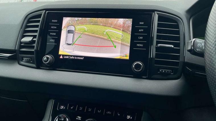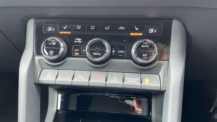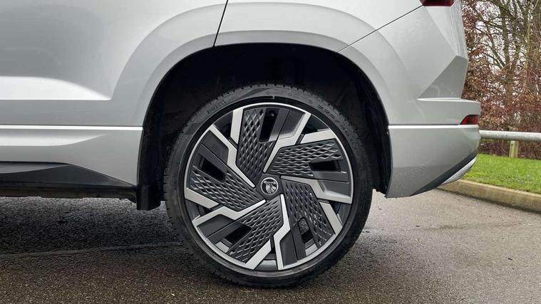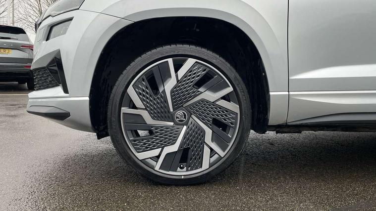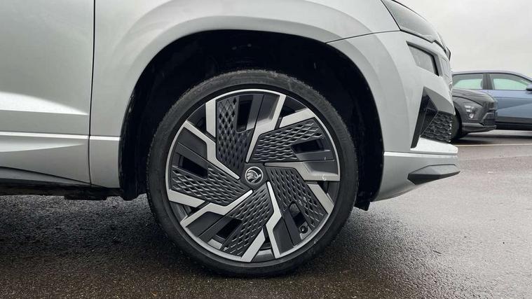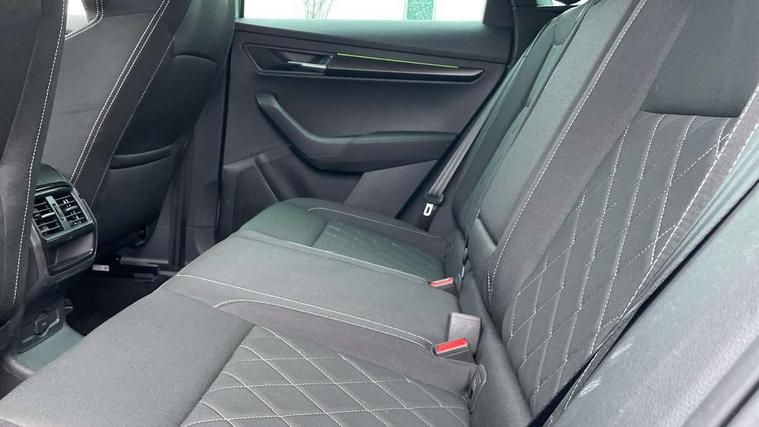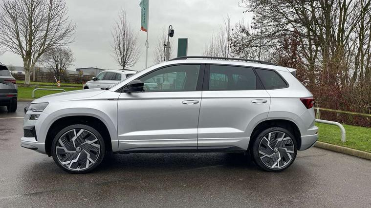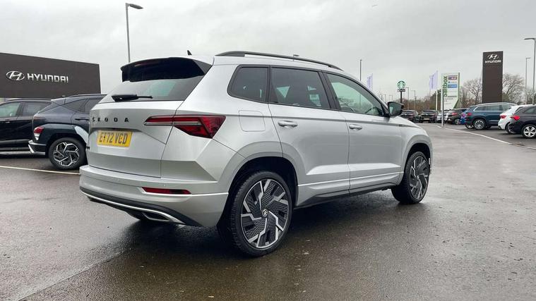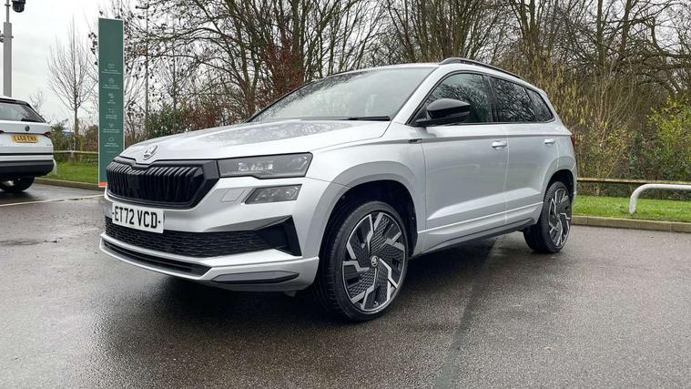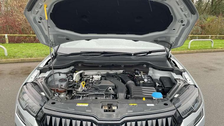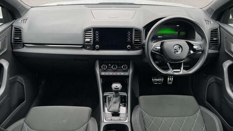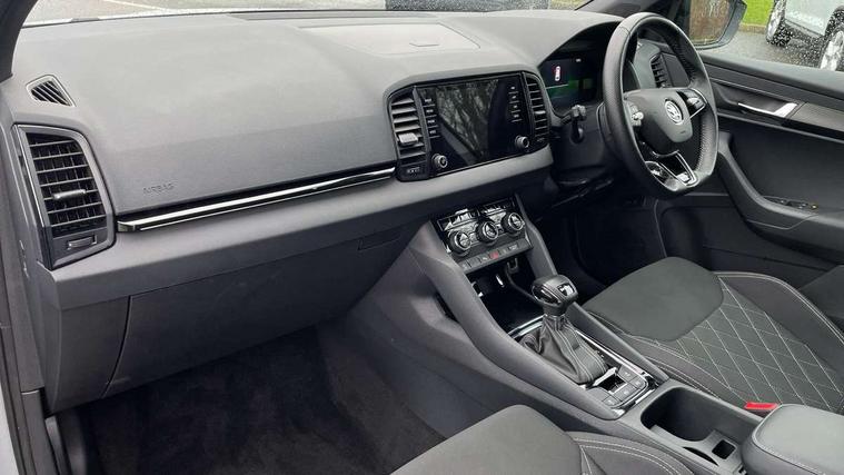 8" Digital display, Care connect, Driver fatigue sensor, Emergency services call system, Outside temperature gauge, Service interval indicator, SmartLink wireless for Apple and wired for Android, Start/stop system with regenerative braking, USB C Port x 2 in front centre console, Virtual pedal with electrically operated boot door, 8 Speakers, DAB radio with Bluetooth, USB connection, Acoustic glass, Aero front windscreen wipers with intermittent function, Auto dimming rear view mirror with light and rain sensors, Black door mirrors, Black electric window control buttons, Black radiator grille, Black roof rails, Body colour door handles, Dynamic headlight range control with cornering light function, Electric front and rear windows with child proof lock, Front door steps with SportLine logo, Heated rear windscreen, LED daytime running lights, LED rear lights with high functionality welcome effect and dynamic indicators, Light assistant (coming/leaving home/tunnel light), Panoramic sliding sunroof, Plastic scuff plates, Privacy glass, Protective door side sills in body colour, Rear diffuser, Rear side wing doors, Rear spoiler, Rear window wiper with washer system and intermittent control, Safety reflectors on front doors, Skoda lettering on tailgate in black, Sportline badge on front fender, Sportline decorative inserts with badging, Sports front and rear bumpers, 1.5 litre bottle holders in driver and front passenger door panels, 12V socket in boot, 12v socket in front centre armrest with storage compartment and rear air vents, 2 Folding hooks and nets in boot, 3 rear height adjustable headrests, 3 seat bench in 2nd row, 3 spoke leather sports multifunction steering wheel and silver stitching with gear shift paddles, 4 foldable roof handles with rear coat hooks, Black floor carpet, Black roof headlining, Chrome inner door handles, Double sided boot floor, Foldable hooks in the boot, Front head restraints, Height adjustable front three point seats belts with tensioners, Height/reach adjust steering wheel, Ice scraper, Illuminated glovebox, Illuminated luggage compartment, Isofix child seat preparation outer rear, Manual lumbar support for front seats, Pen holder, Pollen filter, Rear boot cover, Rear reading lights, Rear seats fixed folding and divided 60:40, Rubbish bin door, Safety vest holder, Single front passenger seat, Storage box in upper central dashboard closed, Sunvisors with illuminated vanity mirrors, Textile floor mats, Ticket holder, Titan black interior ceiling, Welcome animation with sportline logo, Light Pack - Karoq, Parking pack - Karoq, Automatic door unlocking in case of crash, Automatic fuel cut off in case of crash, Child locks on rear doors, Driver airbag, Electronic parking brake with auto hold function, Emergency rear braking signal, ESC including ABS, MSR, ASR, EDS, HBA, DSR, RBS, MKB and traction control, Front side airbags, Hill hold control, Knee airbags, Passenger airbag with switch-off function, Pedestrian monitor, Seatbelt reminder signalisation and pretensioner for all seats, Three point seatbelts rear, Two tone horn, Tyre pressure display, Tyre pressure monitor, Alarm with interior monitoring, back up horn and tilt sensor with safe function, Electronic engine immobiliser, Keyless entry and start/stop, Remote central locking with 2 remote folding keys, Black air vent surround, Black centre console, Satin black dashboard, Satin black door trim, 19" Sagitarius anthracite alloy wheels with matt black aero inserts, Anti-theft wheel bolts protection, Matt black aero hub caps, Storage on wheel cover, Tool kit,