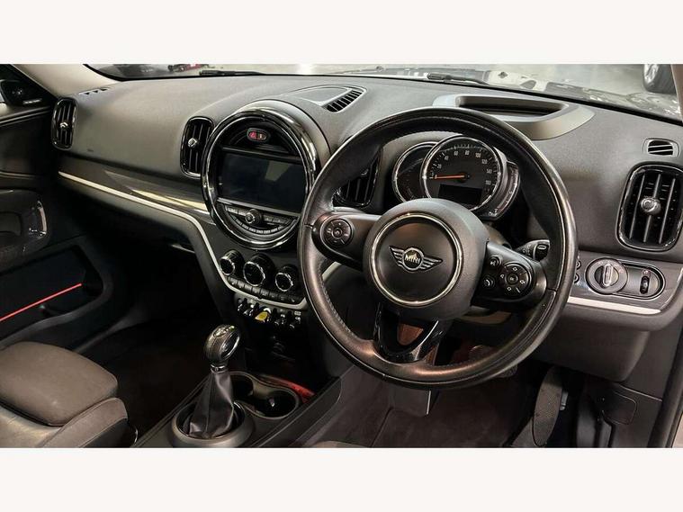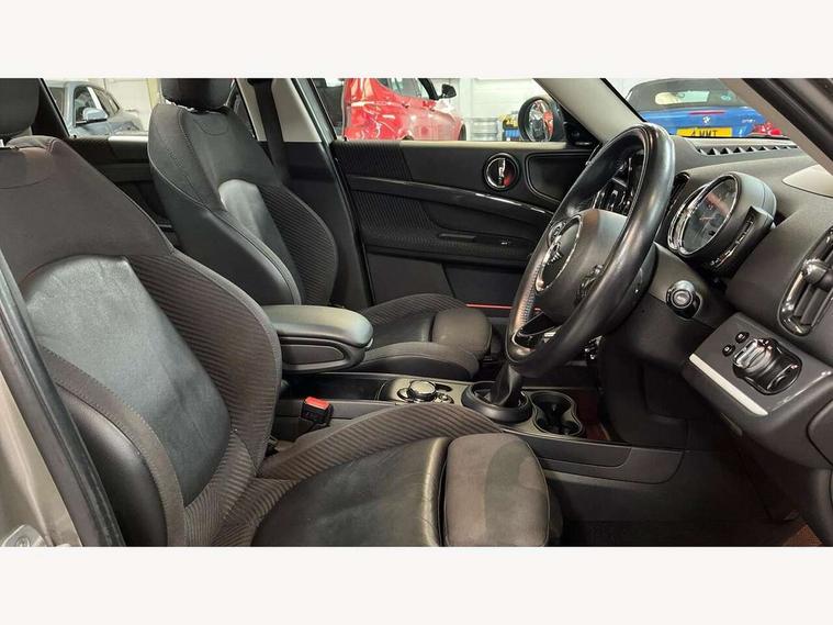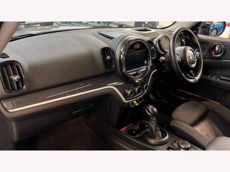 Apple CarPlay preparation, Brake pad wear indicator warning light, Central display with LED ring and 6.5" colour touch screen, Connected driver, DTC - Dynamic traction control, eDrive Services, Exterior temperature gauge, Intelligent emergency call, MINI Driving Modes - centre toggle switch to control driving setting (sport, mid and green), MINI remote services, MINI TeleServices, Navigation system, On board computer, Personal Profile, Real time traffic information, Service interval indicator, Servotronic speed sensitive power steering, Electronic differential lock, Performance Control, Auxiliary input socket, DAB digital radio module, MP3 compatible radio/single CD player, Radio visual boost, Anti dazzle rear view mirror, Body colour scoop integrated into engine- compartment lid, Chrome door handles, Chrome exhaust tailpipe, Chrome headlight surround, Chrome plated radiator grille, Chrome side scuttle, Chrome window surround, Electric front windows + one touch + anti-pinch, Electrically adjustable door mirrors, Follow me home headlights, Green tinted glass, Heated door mirrors/heated windscreen washers, Heated rear window with automatic switch off, Metal look door sill finishers, Rain sensor including auto headlights activation, Rear wiper, Roof spoiler, White indicator lights, 12V power point front, 2 cupholders in front centre console, 4 lashing points to secure luggage, 40:20:40 split folding rear seats, Centre console storage box, Charging cable, Chrome interior door handles, Driver/passenger sunvisors, Front and rear headrests, Front interior light, Front passenger grab handle, Front seat backrest storage nets, Heater with recirculation function, Height/reach adjust steering wheel, Isofix rear child seat preparation, Luggage compartment lighting, Multifunction steering wheel, Rear grab handles, Sensatec gearshift and handbrake, Storage compartments in doors, Toolkit in luggage compartment, Under floor storage in luggage area, Interior lights pack - Countryman, MINI Excitement Pack - Countryman, 3 point automatic seatbelts, 3 point seatbelts on all rear seats, ABS, Cornering brake control (CBC), Crash Sensor - activates hazard/interior lighting + unlocks doors, Driver and passenger airbags, Driver and passenger side airbags, DSC - Dynamic Stability Control, Electronic brake force distribution, Electronic parking brake, Front curtain airbags, Front passenger airbag deactivation, Fuel cut off safety device, Hill start assist, Pyrotechnically pre-tensioned front seatbelts, Tyre pressure warning, Automatic door locking, Keyless start, Locking wheel bolts, RF remote control central locking, Second remote key, Thatcham category 1 alarm + immobiliser,