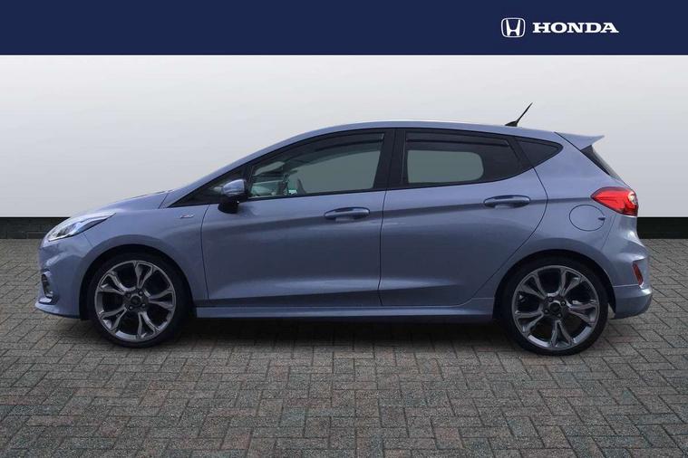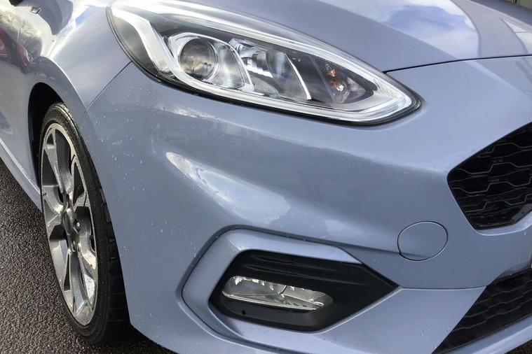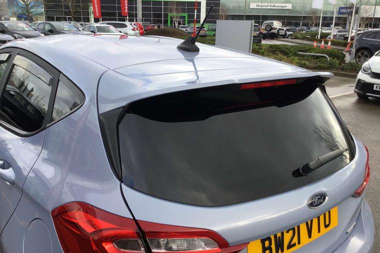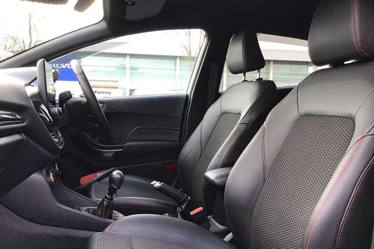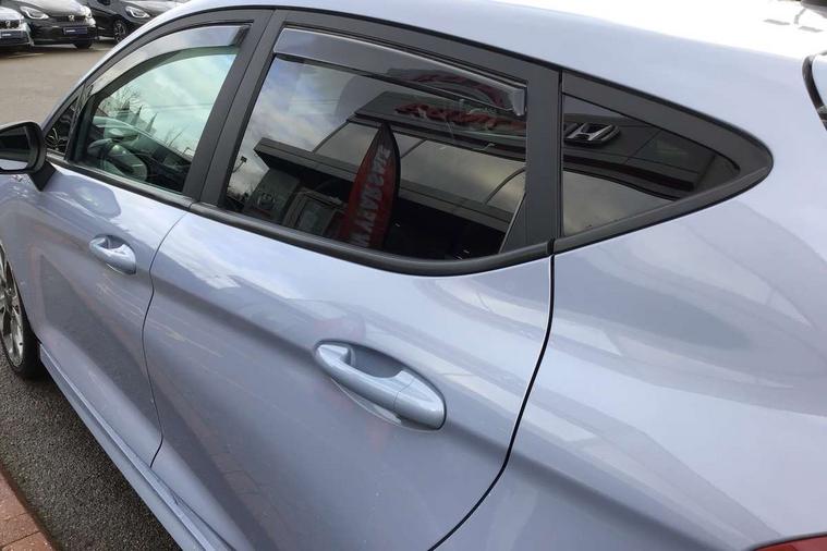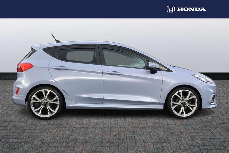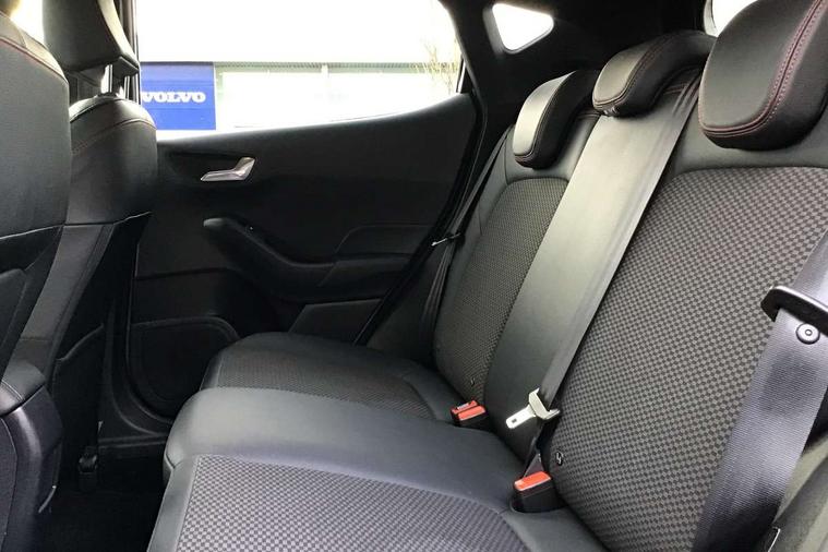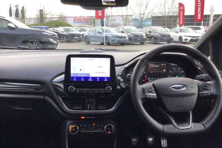 4.2" TFT instrument cluster screen, Bluetooth system, Electric power steering, Ford easy fuel, Rear parking distance sensors, Selectable drive modes (Normal, Sport, Track), Traffic sign recognition, Trip computer, Sports suspension, 2 USB ports, Auxiliary input socket, B&O Premium audio system with 8" touchscreen, 10 speakers, 360 degree sound system, Ford SYNC 3 navigation system and Ford pass connect, DAB Digital radio, Steering wheel mounted controls, Auto high beam, Body colour bumpers, Body colour door handles, Body colour large rear spoiler, Body coloured electrically operated and heated door mirrors with side indicators, Cornering front fog lights, Electric front windows/one touch facility, Electric rear windows, LED Night signature to rear lights, Power foldable door mirrors with puddle lights, Quickclear heated windscreen, Rain sensing wipers and auto dimming rear view mirror, Rear privacy glass, Rear wiper, Unique ST-Line upper grille & full bodystyling kit with ST-Line wing badges, 3 spoke flat bottomed leather steering wheel, 60/40 split folding rear seat, Adjustable head restraints, Black headlining, Boot carpet, Centre console with opening armrest, 2x cupholders, 12v and USB, Chrome inner door handles, Drivers and Passenger lumbar support, EATC - Electronic Auto Temperature control, Footwell illumination, Front floor mats in velour, Front map reading lights, Front seat and rear pockets, Height adjustable passenger seat, Illuminated glovebox, Leather gaiter, LED ambient lighting, Load area light, Manual 4-way driver seat adjust, Overhead console with sunglasses holder, Pollen filter, Rake/reach adjustable steering wheel, Sensico wrapped steering wheel, Sports front seats, NCAP Pack - Fiesta, ST-Line X Trim Pack - Fiesta, 3 point seatbelts on all rear seats, ABS+EBA, Curtain airbags, Driver and passenger airbags, Drivers knee airbag, Electronic stability control with hill start assist, Front passenger airbag deactivation, Front side airbags, Seatbelt warning, Two tone horn, Tyre pressure monitoring system, Ford keyfree system with Keyless entry and keyless start, MyKey system, Remote central locking & engine immobiliser, Thatcham Cat.1 alarm, 18" 5 spoke alloy wheels with rock metallic machined finish,