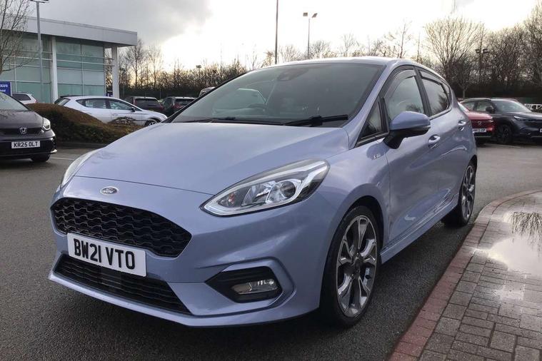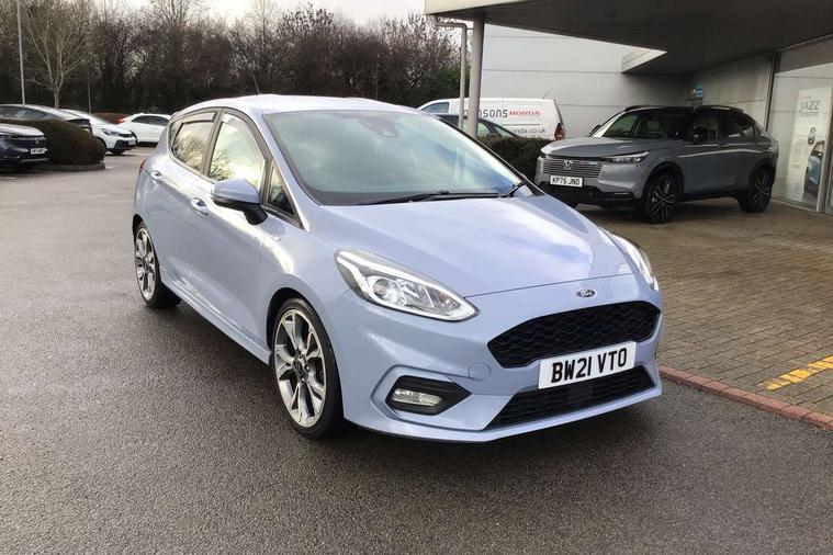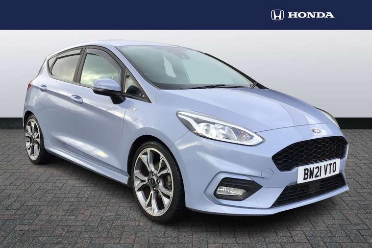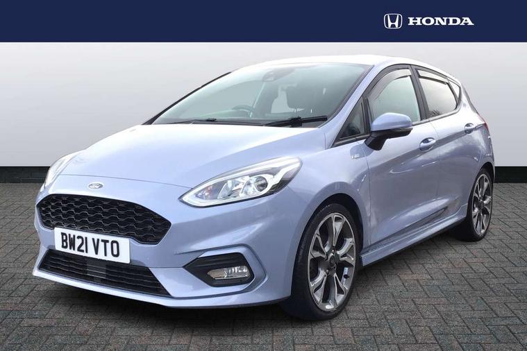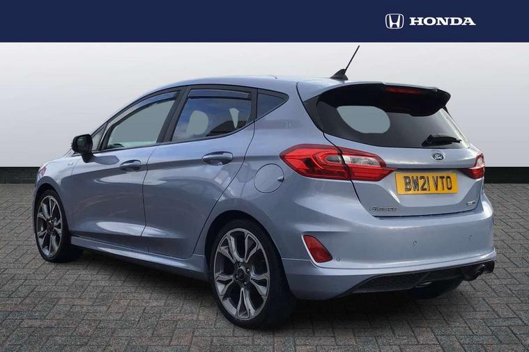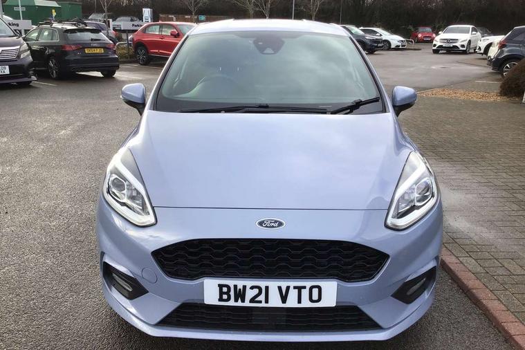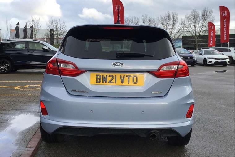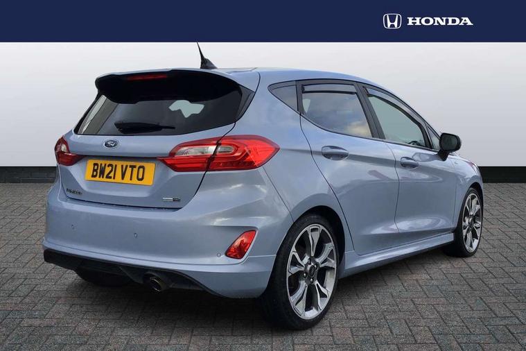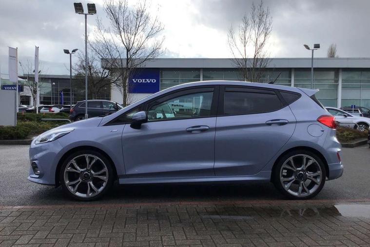 4.2" TFT instrument cluster screen, Bluetooth system, Electric power steering, Ford easy fuel, Rear parking distance sensors, Selectable drive modes (Normal, Sport, Track), Traffic sign recognition, Trip computer, Sports suspension, 2 USB ports, Auxiliary input socket, B&O Premium audio system with 8" touchscreen, 10 speakers, 360 degree sound system, Ford SYNC 3 navigation system and Ford pass connect, DAB Digital radio, Steering wheel mounted controls, Auto high beam, Body colour bumpers, Body colour door handles, Body colour large rear spoiler, Body coloured electrically operated and heated door mirrors with side indicators, Cornering front fog lights, Electric front windows/one touch facility, Electric rear windows, LED Night signature to rear lights, Power foldable door mirrors with puddle lights, Quickclear heated windscreen, Rain sensing wipers and auto dimming rear view mirror, Rear privacy glass, Rear wiper, Unique ST-Line upper grille & full bodystyling kit with ST-Line wing badges, 3 spoke flat bottomed leather steering wheel, 60/40 split folding rear seat, Adjustable head restraints, Black headlining, Boot carpet, Centre console with opening armrest, 2x cupholders, 12v and USB, Chrome inner door handles, Drivers and Passenger lumbar support, EATC - Electronic Auto Temperature control, Footwell illumination, Front floor mats in velour, Front map reading lights, Front seat and rear pockets, Height adjustable passenger seat, Illuminated glovebox, Leather gaiter, LED ambient lighting, Load area light, Manual 4-way driver seat adjust, Overhead console with sunglasses holder, Pollen filter, Rake/reach adjustable steering wheel, Sensico wrapped steering wheel, Sports front seats, NCAP Pack - Fiesta, ST-Line X Trim Pack - Fiesta, 3 point seatbelts on all rear seats, ABS+EBA, Curtain airbags, Driver and passenger airbags, Drivers knee airbag, Electronic stability control with hill start assist, Front passenger airbag deactivation, Front side airbags, Seatbelt warning, Two tone horn, Tyre pressure monitoring system, Ford keyfree system with Keyless entry and keyless start, MyKey system, Remote central locking & engine immobiliser, Thatcham Cat.1 alarm, 18" 5 spoke alloy wheels with rock metallic machined finish,