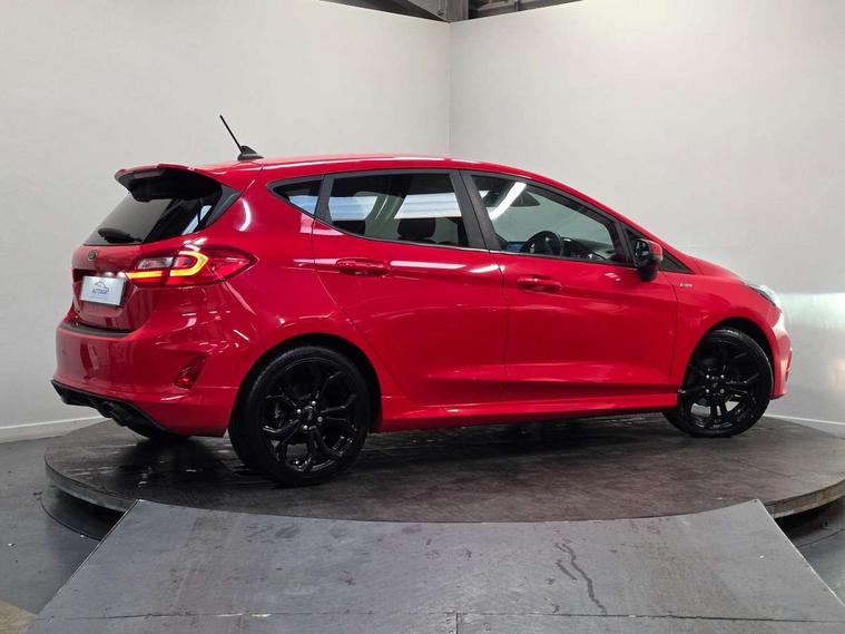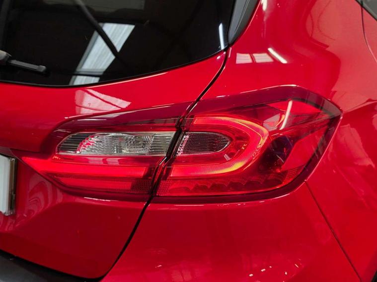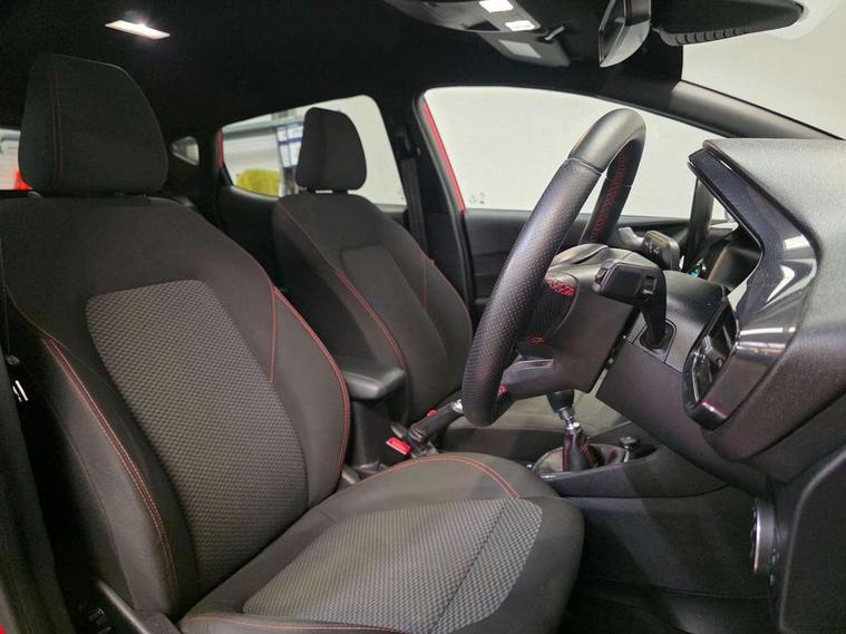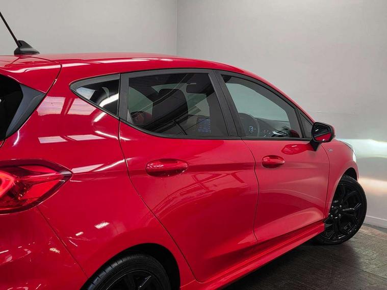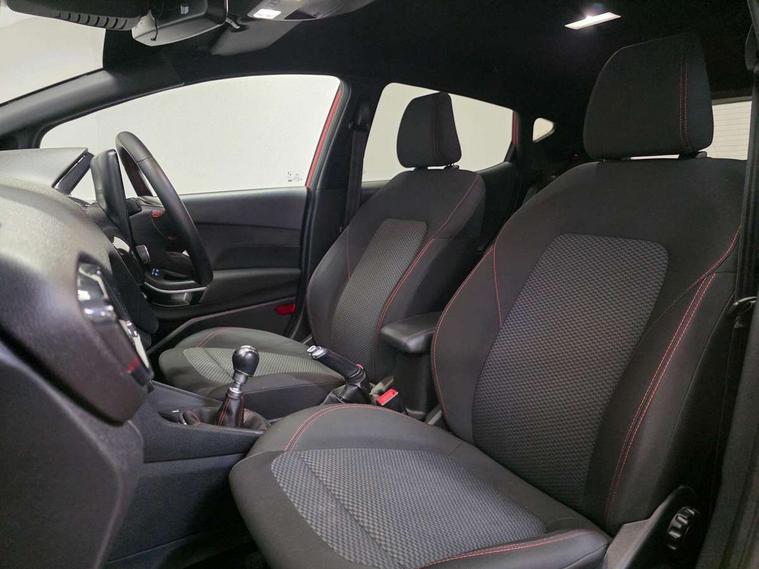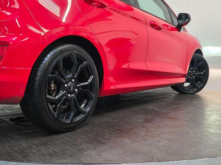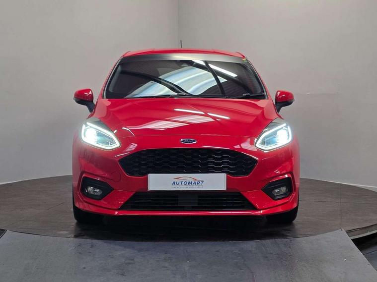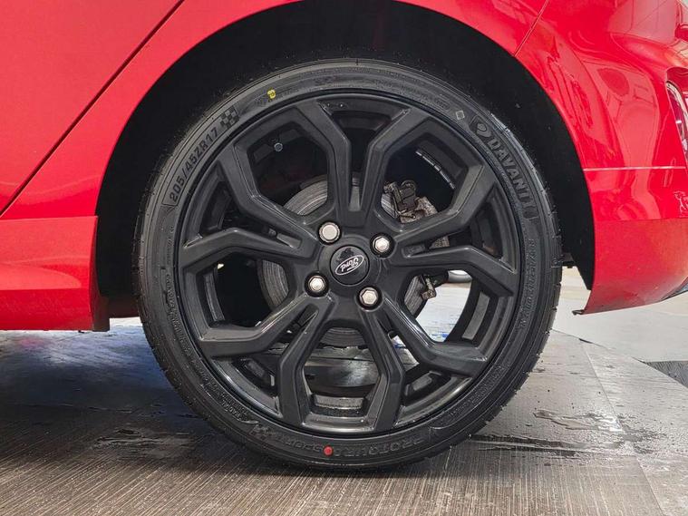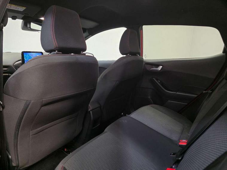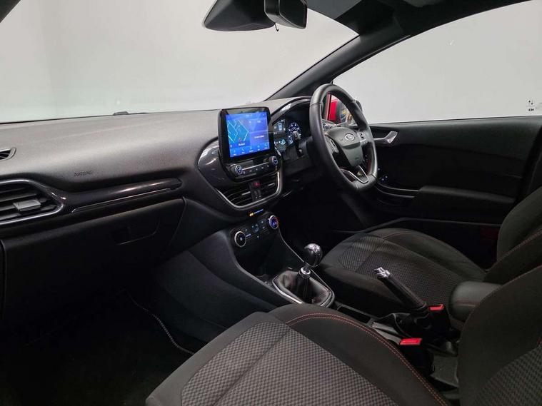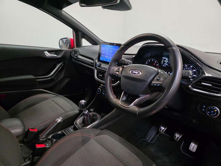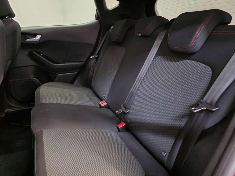 Bluetooth system, Electric power steering, Ford easy fuel, Ford SYNC 3 Navigation system incl 8" touchscreen, 7 speakers, FordPass connect, Apple carplay, android auto, voice control and emergency assistance, Rear parking distance sensors, Trip computer, Sports suspension, 2 USB ports, Auxiliary input socket, DAB Digital radio, Steering wheel mounted controls, Body colour bumpers, Body colour door handles, Body colour large rear spoiler, Body coloured electrically operated and heated door mirrors with side indicators, Cornering front fog lights, Electric front windows/one touch facility, Electric rear windows, LED Night signature to rear lights, Power foldable door mirrors with puddle lights, Quickclear heated windscreen, Rain sensing wipers and auto dimming rear view mirror, Rear privacy glass, Rear wiper, Unique ST-Line upper grille & full bodystyling kit with ST-Line wing badges, 12V Accessory socket in centre console, 3 spoke flat bottomed leather steering wheel, 60/40 split folding rear seat, Adjustable head restraints, Black headlining, Boot carpet, Centre console with armrest and illuminated cupholders, Chrome inner door handles, Cloth upholstery, Footwell illumination, Front map reading lights, Front seat and rear pockets, Front/rear floor mats, Height adjustable driver's seat, Illuminated glovebox, LED ambient lighting, Load area light, Manual air conditioning, Overhead console with sunglasses holder, Pollen filter, Rake/reach adjustable steering wheel, Sensico wrapped handbrake and gearknob, Sports front seats, Sports pedals, NCAP Pack - Fiesta, 3 point seatbelts on all rear seats, ABS+EBA, Curtain airbags, Driver and passenger airbags, Drivers knee airbag, Electronic stability control with hill start assist, Front passenger airbag deactivation, Front side airbags, Seatbelt warning, Two tone horn, Tyre pressure monitoring system, Keyless start with 'Ford Power' starter button, MyKey system, Remote central locking & engine immobiliser, Thatcham Cat.1 alarm, 17" 5 spoke alloy wheels with rock metallic finish,