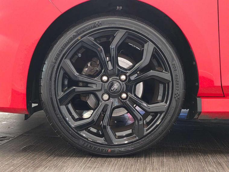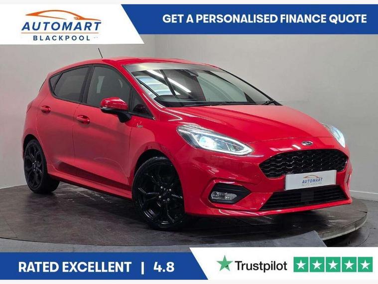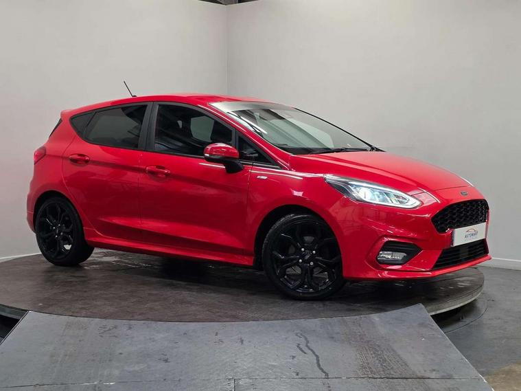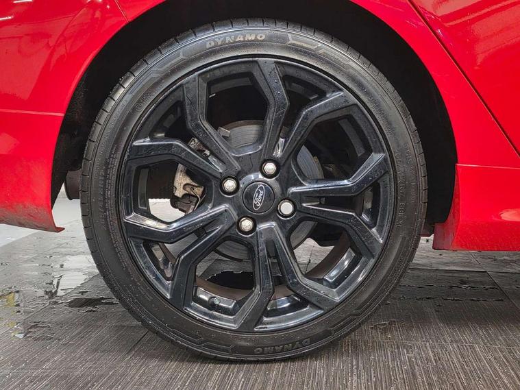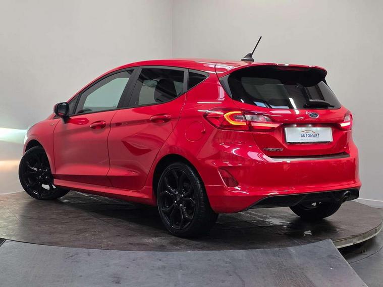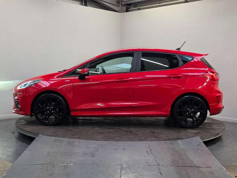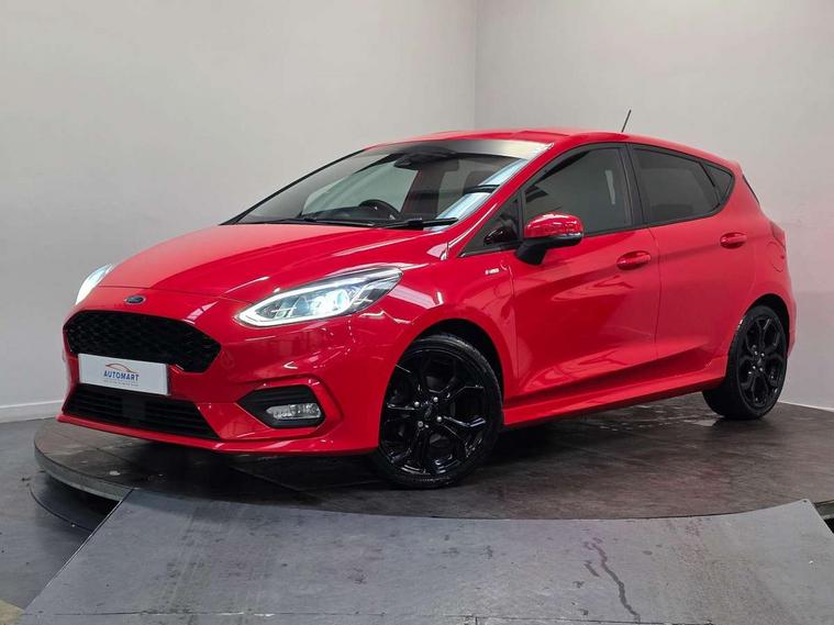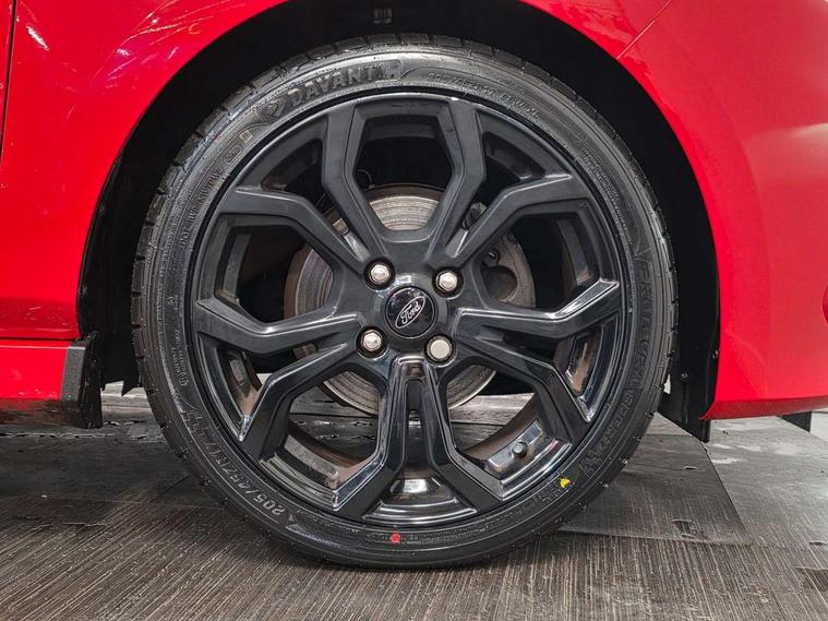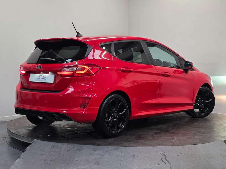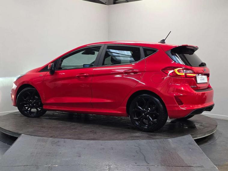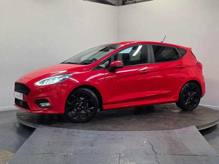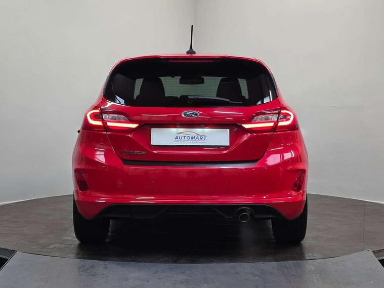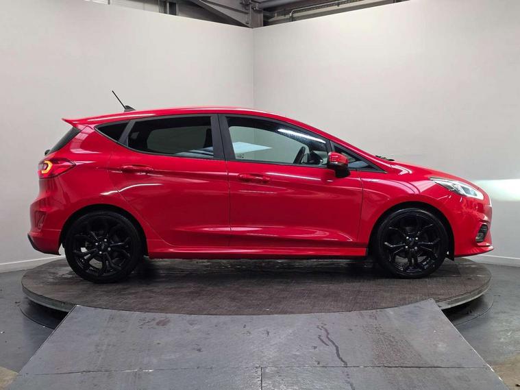 Bluetooth system, Electric power steering, Ford easy fuel, Ford SYNC 3 Navigation system incl 8" touchscreen, 7 speakers, FordPass connect, Apple carplay, android auto, voice control and emergency assistance, Rear parking distance sensors, Trip computer, Sports suspension, 2 USB ports, Auxiliary input socket, DAB Digital radio, Steering wheel mounted controls, Body colour bumpers, Body colour door handles, Body colour large rear spoiler, Body coloured electrically operated and heated door mirrors with side indicators, Cornering front fog lights, Electric front windows/one touch facility, Electric rear windows, LED Night signature to rear lights, Power foldable door mirrors with puddle lights, Quickclear heated windscreen, Rain sensing wipers and auto dimming rear view mirror, Rear privacy glass, Rear wiper, Unique ST-Line upper grille & full bodystyling kit with ST-Line wing badges, 12V Accessory socket in centre console, 3 spoke flat bottomed leather steering wheel, 60/40 split folding rear seat, Adjustable head restraints, Black headlining, Boot carpet, Centre console with armrest and illuminated cupholders, Chrome inner door handles, Cloth upholstery, Footwell illumination, Front map reading lights, Front seat and rear pockets, Front/rear floor mats, Height adjustable driver's seat, Illuminated glovebox, LED ambient lighting, Load area light, Manual air conditioning, Overhead console with sunglasses holder, Pollen filter, Rake/reach adjustable steering wheel, Sensico wrapped handbrake and gearknob, Sports front seats, Sports pedals, NCAP Pack - Fiesta, 3 point seatbelts on all rear seats, ABS+EBA, Curtain airbags, Driver and passenger airbags, Drivers knee airbag, Electronic stability control with hill start assist, Front passenger airbag deactivation, Front side airbags, Seatbelt warning, Two tone horn, Tyre pressure monitoring system, Keyless start with 'Ford Power' starter button, MyKey system, Remote central locking & engine immobiliser, Thatcham Cat.1 alarm, 17" 5 spoke alloy wheels with rock metallic finish,