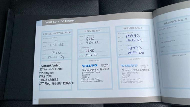 12.3" Progressive Driver Display, 360 degree surround view parking camera with side proximity sensors, 9" centre console touch screen, Adjustable steering wheel force, Bluetooth handsfree system, Driver alert control with lane keeping aid, Driver assistance (pilot assist and adaptive cruise control), Driver awareness - Blind spot information system with steer assist, cross traffic alert with autobrake and rear collision warning and mitigation, Emergency services call system, Front and rear park assist, Google Automotive Services, Oncoming Lane Mitigation, Service interval indicator, Speed limiter, Speed sensitive steering, Trip computer, Volvo on call with App, Wireless/Inductive Mobile Phone Charging, 8 speed automatic transmission with start/stop + manual change functions, Dynamic chassis, DAB Digital radio, Premium Sound by Harman Kardon, dirac unison, dolby pro logic II surround sound, 13 speakers/600W output and fresh air subwoofer, Steering wheel remote infotainment controls, Adaptive brake lights with high level LED brake lights, Auto dimming interior + exterior mirrors, Automatic headlight levelling system, Automatic LED Headlights + Active high beam incorporating daytime running lights, Electric adjustable/heated/auto power folding door mirrors, Electric front+rear windows, Front aluminium tread plates, Heated front windscreen, High gloss black door mirrors and window surround, High gloss black front and rear bumper decoratives, High gloss black mesh front grille with high gloss black surround, Home safe and approach lighting, Integrated roof rails in high gloss black, LED front fog lights, Puddle lights, Rain sensor with automatic windscreen wiper activation, Rear side wing doors, Rear wiper, Roof antenna, Roof spoiler, Tinted windscreen, Visible VIN plate, 12V socket in front tunnel console and luggage compartment, 3 seat bench in 2nd row, 4 Zone electronic climate control, A-pillar parking ticket holder, Air purifier particulate matter (PM) 2.5 filter, B Pillar ventilation, Bright metal luggage threshold, Centre console cupholders and storage, Charcoal floor mats, Front and rear courtesy lights, Front and rear door pocket illumination, Front cupholder illumination, Front footwell illumination, Front reading lights, Front seat cushion extensions, Glovebox compartment with illumination, Head restraints for all seats, Heated front seats, Heated steering wheel, Height/reach adjustable steering column, Illuminated luggage compartment, Illuminated vanity mirrors + ticket holder, ISOFIX attachment on outer rear seats, Load cover, Load protection net, Multi directional lumbar support, Power driver seat with memory + exterior mirrors memory, Power height adjustable passenger seat, Rear armrest with cupholder, Rear footwell and front and rear side step illumination, Rear seat concealed storage, Single front passenger seat, Tailgate illumination and ambient door lighting, Underfloor stowage compartment, Versatile split folding rear seat - 60/40, 5 three point seatbelts, City safety with steering support with Pedestrian + cyclist + large animal detection + front collision warning with full auto brake, Drivers knee airbag, Dual stage driver/passenger airbags, Electronic parking brake with auto hold, First aid kit, Front seats SIPS airbags, Hill descent control - Off-road drive mode, Hill start assist, IC (Inflatable Curtains) - Full Length, Passenger airbag cut-off device, Power child locks on rear doors, Road sign information display, Run off Road Mitigation, Run off Road Protection, Seatbelt reminder and pretensioners, SIPS (Side Impact Protection System), Slippery road and hazard light alert, Stability and Traction Control with Spin control, Engine Drag Control and Corner Traction Control, Tyre pressure monitoring system, Vehicle deceleration control with Anti-lock Brake System, Electronic Brake Distribution and Emergency Brake Assist, Warning triangle, WHIPS whiplash protection system - front, Anti-theft alarm including immobiliser/volume sensor + level sensor, Care key with user defined top speed, Key integrated remote control central locking + fuel flap with deadlocking system and auto open/close power windows, Keyless Drive (includes Keyless Entry and Keyless Start) with Handsfree Tailgate Opening/Closing, Locking wheel nuts, Private locking for tailgate,