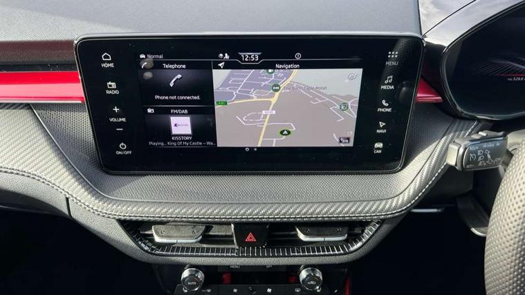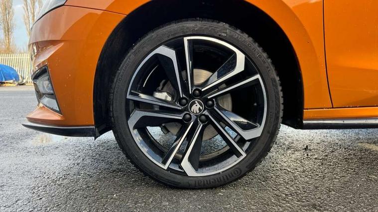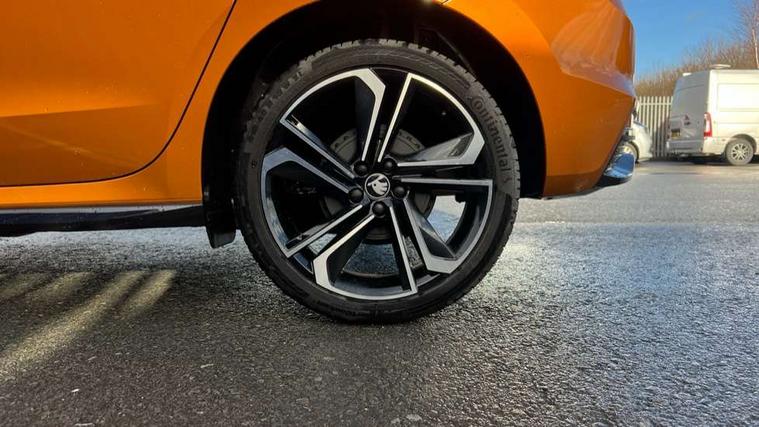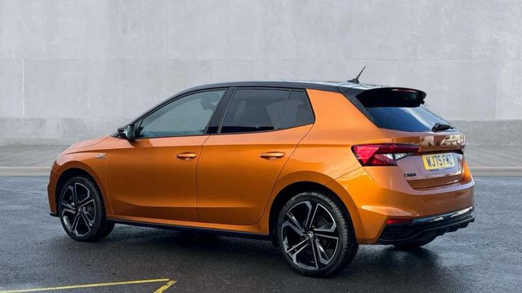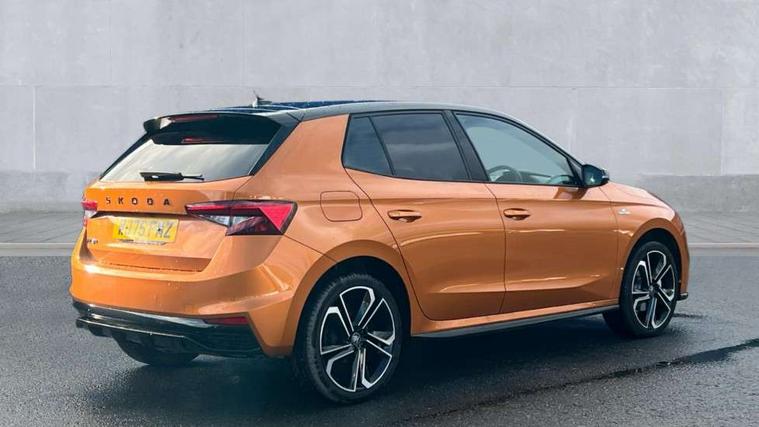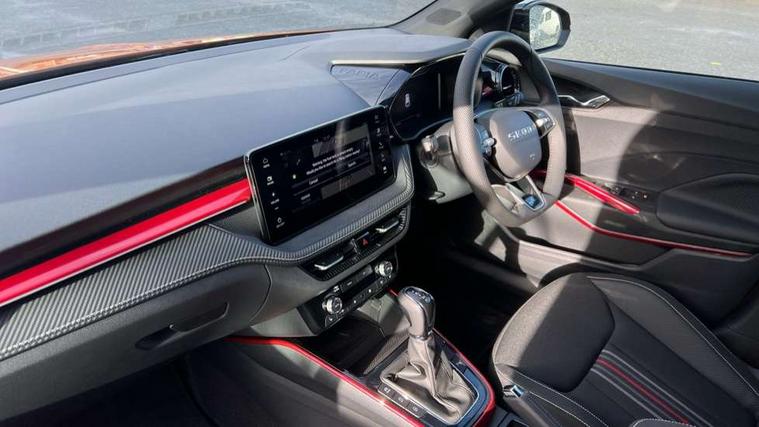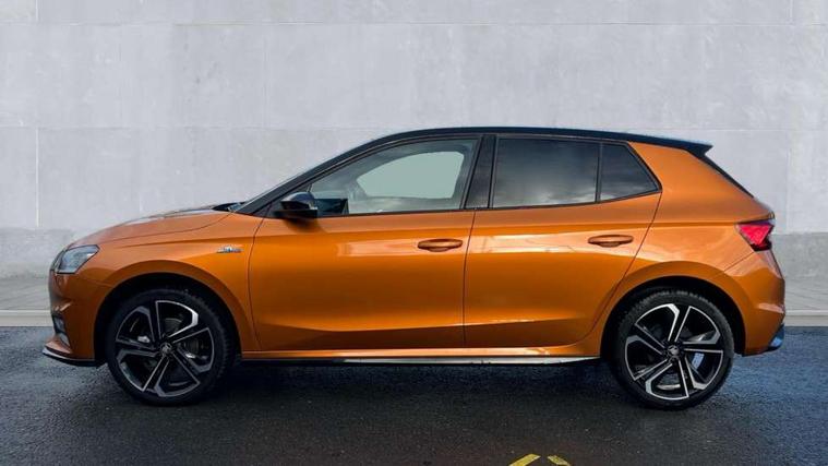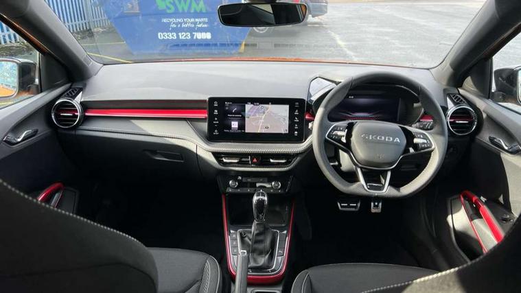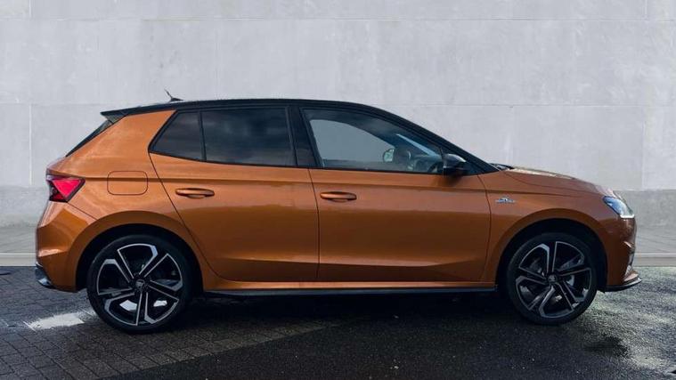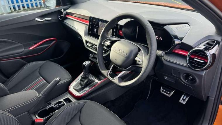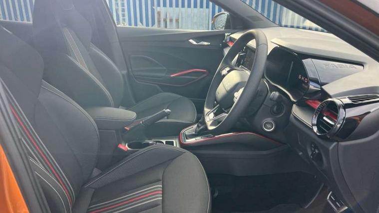 Advanced driver attention and drowsiness monitor, Bluetooth connection, Driver alert system, Electromechanical power steering, Exterior temperature gauge, Service interval indicator, Traffic sign recognition, Virtual cockpit with 10.25" colour display, Wireless SmartLink for Apple CarPlay and Android Auto, 6 Speakers (4 in front and 2 in rear), 9.2" colour display skoda navigation system with voice control and web radio, Auxiliary socket for external MP3 player, DAB digital radio reception, Auto dimming rear view mirror, Black radiator grille, Body coloured bumpers, Chrome window surround, Door mirror integrated indicators, Dynamic headlight range control, Front and rear electric windows, Front window wiper intermittent control, Ice scraper in fuel cap, LED 3rd brake light, LED daytime running lights with coming and leaving home feature, LED rear lights, Monte Carlo badging, Privacy glass, Rear LED fog light, Rear side wing doors, Rear window wiper with washing nozzles, Roof mounted spoiler, SKODA tailgate lettering in black, Sports bumpers, Unique dark chrome design logo on alloy wheels, 2 LED reading lights in front and rear, 3 rear headrests, Aluminium pedals, Backrest split and folding, Black headlining, Central console with fixed cup holder and storage box, Chrome handbrake release button, Door sills with fabia badging, Dual zone air conditioning with climatronic electronic control, Fabric/artificial leather upholstery, Front centre armrest, Front sports seats, Gearshift knob/handle in leather, Hand brake lever handle in leather, Height adjustable front headrests, Height adjustable front seats, Height adjustable steering wheel, ISOFIX and TopTether anchorage points to the outer rear seats, ISOFIX and TopTether on the front passenger seat, Luggage compartment lighting, Manually adjustable lumbar support in front seats, Metallic red interior door handles, Pollen filter, Rear seat bench unsplit, Single front passenger seat, Skoda lettering on steering wheel, Sun visors with mirror and airbag label on passenger side, Textile floor mats, Ticket holder, Umbrella in drivers door, Ambient lighting pack - Fabia Hatchback, Convenience pack - Fabia, Light and view pack plus - Fabia, 3-point height adjustable front seats belts with pretensioner and force limiter, Automatic warning lights in case of crash, Driver and passengers airbag with switch off function, e-Call+, ESC including ABS, MSR, ASR, EDS, HBA and XDS, Front and rear seat belt warning, FRONT ASSIST (AEB City and AEB Inter Urban), Front side airbags, Head airbags, Hill hold control, One tone horn, Pedestrian protection, Three rear 3-points safety seat belts with pretensioner and force limiter including stop function for outer rear seat belts, Tyre pressure monitoring system, Anti-theft alarm system including immobiliser, interior monitoring, backup horn, and towing protection, Central locking with radio remote control, interior controls, SAFE function and 2 foldable keys, Carbon effect door and side trim panels, Carbon effect lower decorative trim with white stitching, Grain satin black central console cover, Monte carlo air vents, Red metallic upper decorative trim, Anti-theft wheel bolts protection, Super-low rolling resistance tyres,