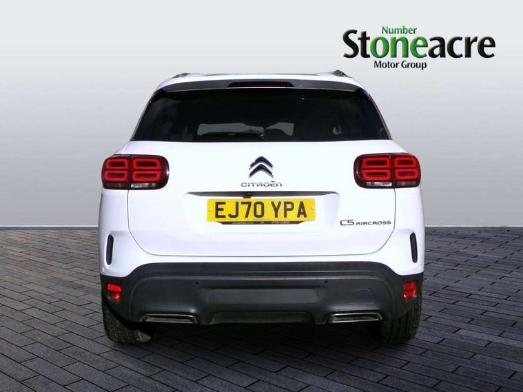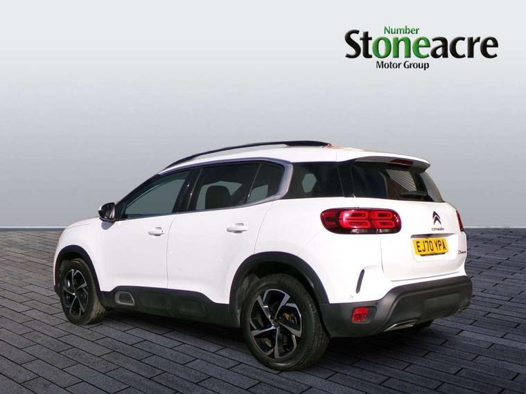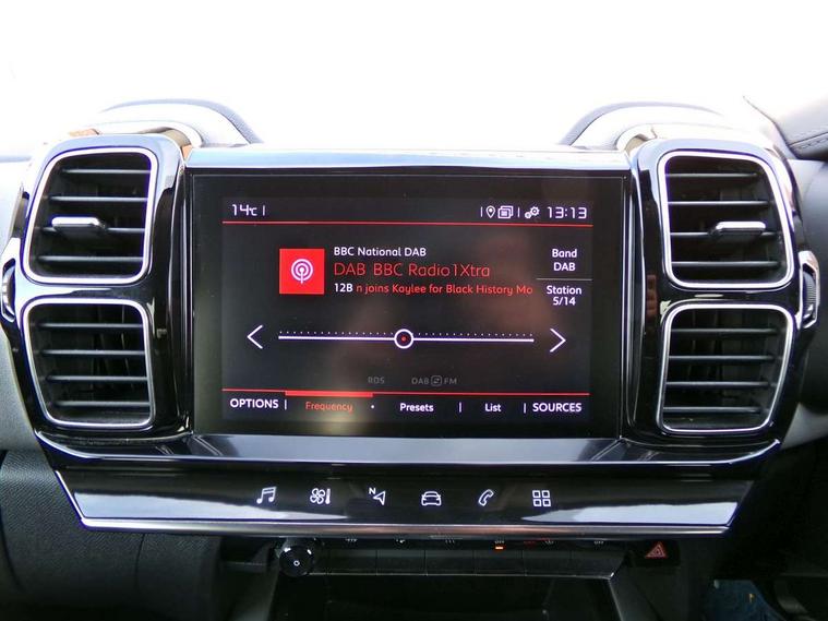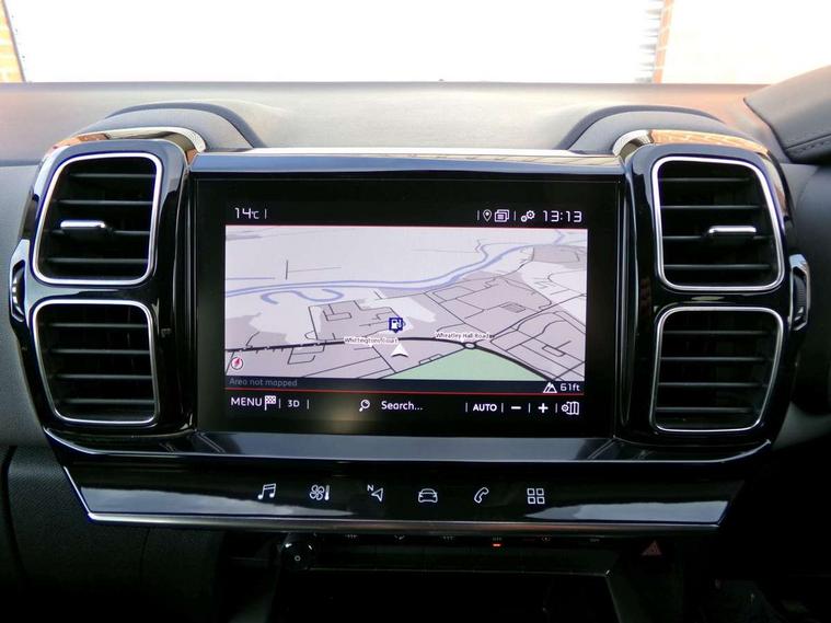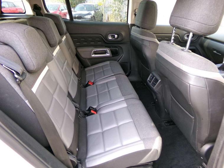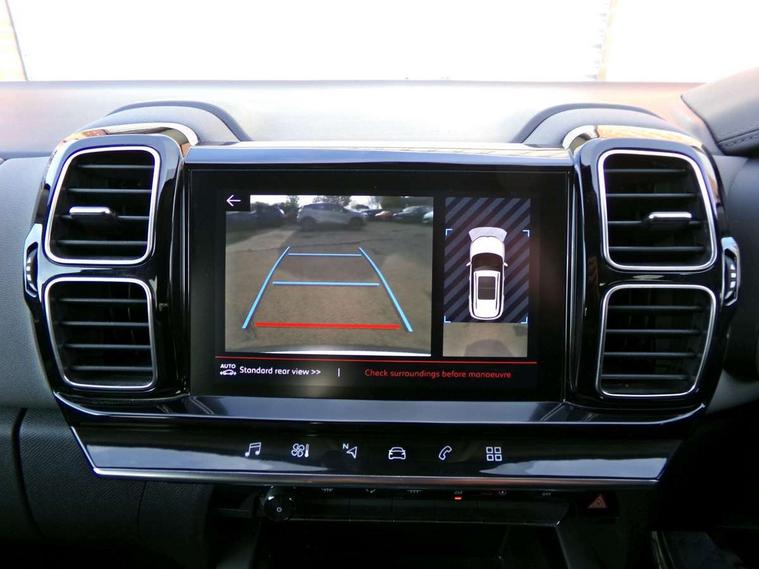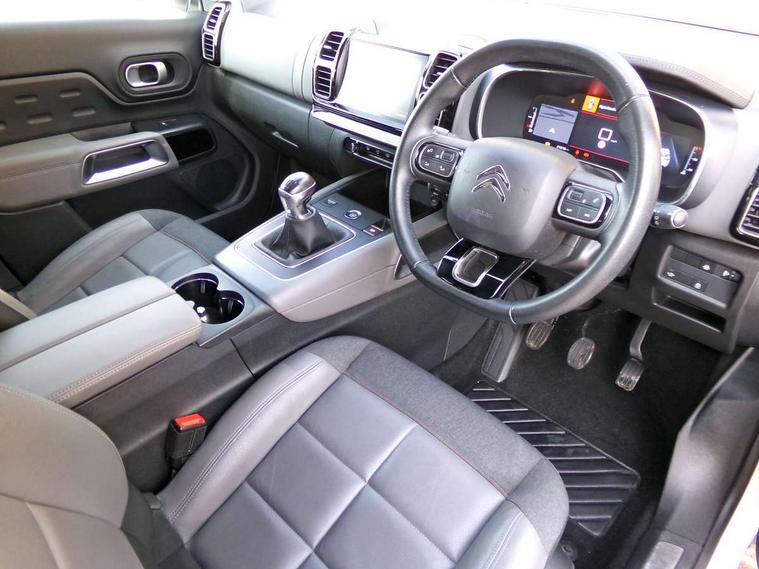 12.3" customisable TFT instrument display, Active blind spot monitoring system, Active lane departure warning system, Bluetooth telephone facility, Central 8" capacitive touch screen, Citroen connect box emergency assist system, Citroen connect Nav with connect box, Coffee Break Alert, Driver attention alert system, Eco+ mode, Electric power steering, Exterior temperature indicator with ice warning, Gear efficiency indicator, Mirror screen with Apple CarPlay and Android auto, Multi function trip computer, Programmable cruise control and speed limiter, Rear parking sensors, Speed limit recognition and recommendation, Traffic sign recognition and recommendation, Suspension with Progressive Hydraulic Cushions, 2 USB sockets, Auxiliary input socket, DAB (Digital Audio Broadcasting), AM/FM and MP3 compatible radio with two tweeters and four speakers, Voice recognition for radio, navigation and telephony features, 3D effect LED rear lights, Acoustic laminated windscreen with rain and brightness sensors, Airbump panels with colour insert on lower portion of the doors, Auto dimming electrochrome rear view mirror, Automatic hazard light activation upon heavy brake application, Automatic headlight activation via windscreen mounted sensors, Automatic triggered rear windscreen wiper in reverse gear, Automatic windscreen wipers, Body colour door handles, C5 Aircross monogram on boot rear, Citroen logo and monogram on rear, Dark tinted rear windows and rear windscreen, Electric, heated and folding door mirrors with integrated LED indicator and kerb puddle light, Front fog lights with cornering function, Front windscreen wiper with magic wash cleaning system, Gloss black finish on A and B pillar and aerodynamic trim, Guide me home headlight function, Halogen rear fog lights, Halogen rear number plate lights, Headlights left on audible warning, Heated rear windscreen with integrated antenna, High level LED centre brake light, LED daytime running lights, LED front indicators, LED Headlights, Longitudinal roof bars, Matte black lower rear skirt, Matte black side sill with anodised silver colour touch, Matte black wheel arch extensions, One touch electric front/rear windows with pinch protection, Painted front bumper, Painted rear bumper, Roof coloured rear spoiler with stainless edging trim, Satin chrome C signature, Satin chrome window surround, Twin exhaust effect trim, 12V socket in boot, 12V socket in cabin, 2 cup holders in the front and rear centre console, 2 Position boot floor, 2 way lumbar adjustment for driver, 2x Rear coat hooks, 3 Independent full size rear seats with adjustable recline angle, 3x Grab handles retractable with damping, Advanced comfort front and rear seats, Air recirculation when reverse gear is engaged, Anti odour and pollen filter, Central front armrest with butterfly wing opening and illuminated storage compartment, Dashboard closed glove box with lid and illumination, Dimmable white mood lighting, Dual zone automatic climate control, Fixing rings 4 in load compartment, Front and rear LED welcome/LED rear reading lights, Front door pockets store up to 1.5L bottle and A4 note pad, Front interior light with 2 reading spotlights and rear interior light with timer, Front seat back map pockets, Height and reach adjustable leather steering wheel with 2 control zones, Hinged rear parcel shelf, Isofix child seat preparation for front passenger seat, Leather effect interior door handles, Leather steering wheel with satin chrome inserts, Leather steering wheel with satin chrome inserts and radio controls, Manual passenger seat adjustment (height, fore/aft and backrest angle), Multi function steering wheel, Open central storage area below touch screen, Rear centre console ventilation system, Rear door pockets store up to 0.5L bottle, Rear passenger air vents, Satin chrome digital instrument panel and touchscreen trim, Satin chrome gear lever, Satin chrome interior door handles, Seatbelt unfastened on the move audible and visual alert for front and rear seats, Smooth opening flocked glove box with lighting, City camera pack with front parking sensors - C5 Aircross, 2x Isofix child seat fitting on outer rear seats, 3x Rear three point retractable seatbelts with pretensioners and force limiters in the outer rear seats, ABS/EBD, Adaptive driver and front passenger airbags with passenger airbag deactivation function, Collision risk alert, Driver and front passenger side airbags, Electric child locking functionality on rear windows and doors, Electronic parking brake, ESP including traction control and stability programme, Front and rear curtain airbags, Front optimised safety headrests and 3 x rear retractable headrests with height adjustable, Front three point retractable seatbelts height adjustable with pre tensioners and force limiters, Front ventilated disc brakes and rear disc brakes, Hill start assist, Two tone horn, Tyre under inflation indicator, Alarm - perimetric and volumetric alarm with anti-lifting mechanism, Automatic door locking, Electronic code immobiliser, Keyless entry and start, Remote central locking + deadlocks, Gloss black touch screen surround with integrated tactile buttons and chrome finisher, Leather effect dashboard facia, Satin chrome air vent decors, Soft touch matte dashboard with grey insert, 18" Swirl two tone diamond cut alloy wheels, Compressor with puncture repair kit,