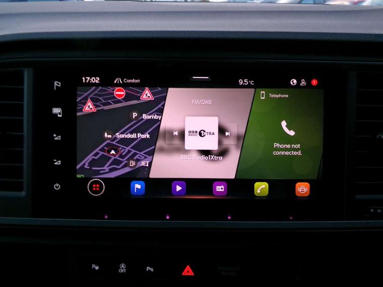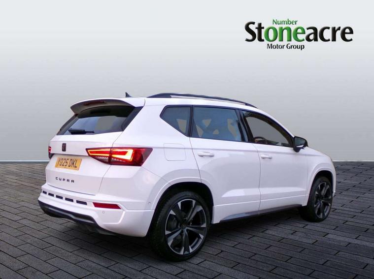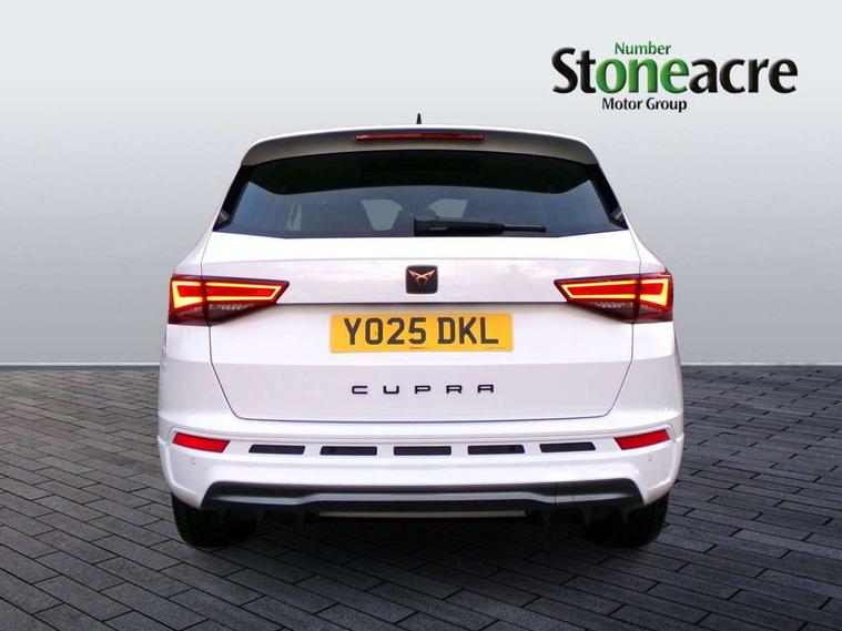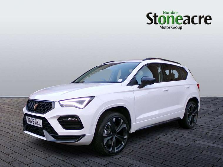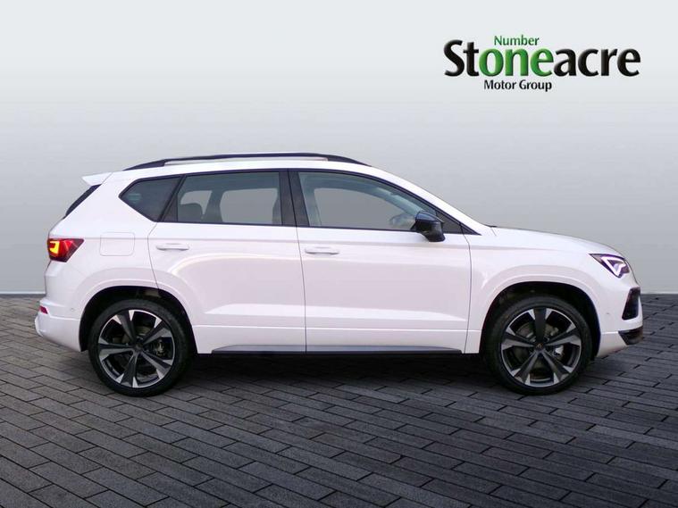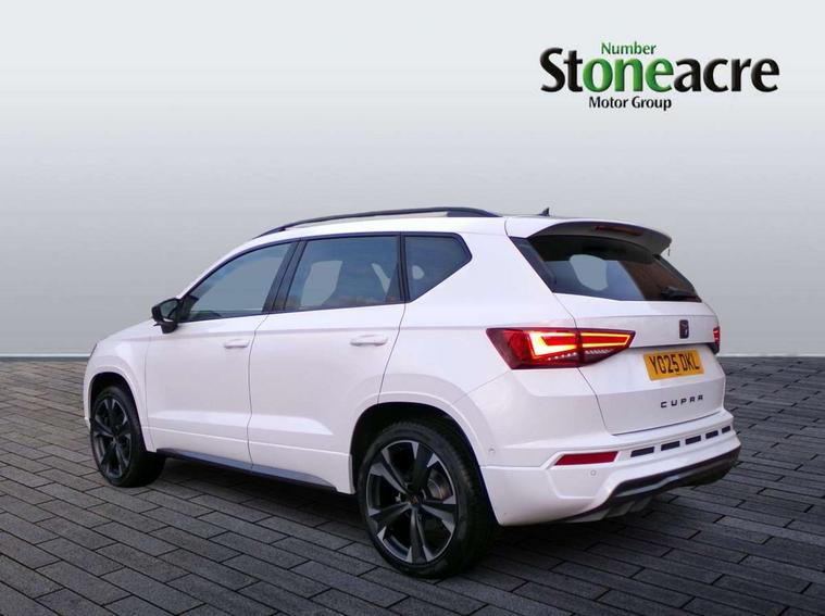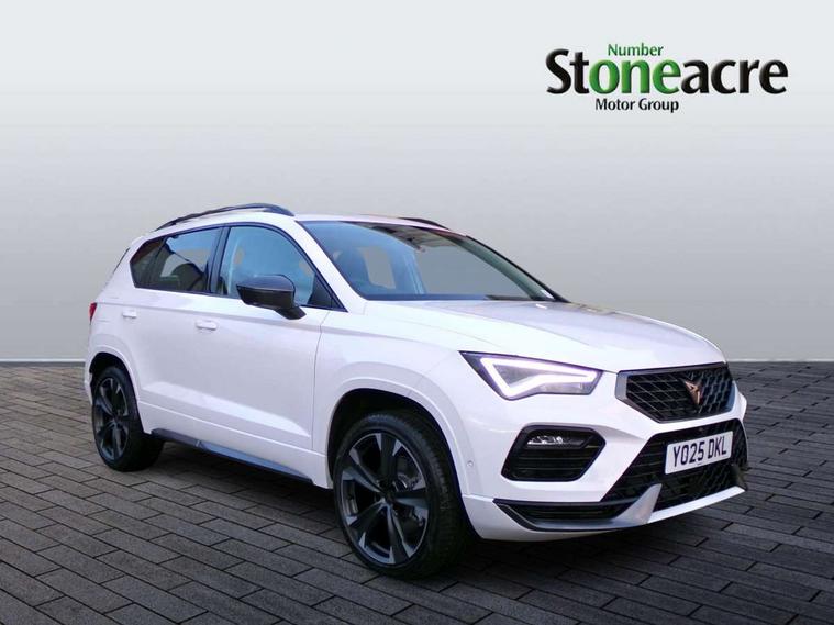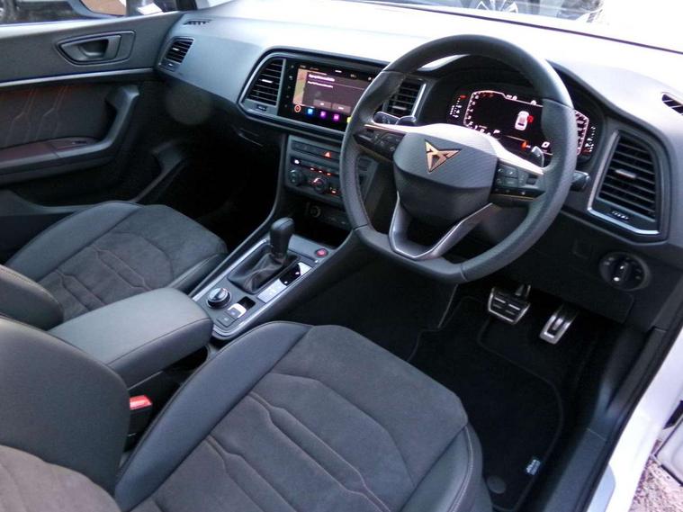 Cruise control system with speed limiter, Digital cockpit, Driving profile selection and conventional shock absorber, E-call, Outside temperature gauge, Progressive power assisted steering, Self parking functionality (includes front and rear parking sensors), Trip computer, wired and wireless full link smartphone integration, Front and rear shock absorption, chassis with increased ride height, Steering wheel mounted audio/phone controls, Body colour bumpers with dark aluminium diffusor, Body coloured wheel arch surrounds, Dark tinted rear windows, Daytime running lights, Door mirrors with welcome CUPRA light silhouette, Dynamic headlight range control with self adjusting whilst driving, Electric adjustable/heated/folding door mirrors, Front and rear electric windows, Front grille frame in chrome, Full LED headlamps with lens and LED front fog lamps with cornering function, Gloss black door mirrors, Gloss black roof rails, Gloss black side mouldings, Gloss black side window trim, Illuminated aluminium front door sill, LED rear tail lights with dynamic indicators, Rear fog lights, Rear side wing doors, Rear spoiler, Rear wash/wipe, Specific CUPRA design front bumper, Standard rear exhaust tailpipes, Third brake light, 12V socket in front, 3 seat bench in 2nd row, 60/40 split folding rear seat, Aluminium pedals, Bucket sport seats in dinamica upholstery, Cupra steering wheel emblem, Document holder under right front seat, Dual zone climate control, Front and rear head restraints, Front centre armrest, Front seat back storage pockets, Grey roof lining, Heated steering wheel, Height adjustable driver and passenger seat with lumbar adjustment, ISOFIX points in outer rear seats with top tether anchorage points, Leather steering wheel and gear knob, Multicoloured ambient lighting with LED interior illumination, Pedal cluster, Rear armrest and easy back seat release mechanism from boot, Single front passenger seat, Sports steering wheel, Steering wheel mounted gearshift paddles, Storage compartment in roof console for sunglass, Storage compartment under driver's seat, Convenience pack - Ateca, Interior lighting pack - Ateca, Navigation system plus pack with DAB - Ateca, Safety and driving pack - Ateca, 3x3 point rear seatbelts, ABS, Traction control system (TCS), Electronic stability control (ESC) and Electronic differential lock system (XDS), Airbags - Driver and front passenger airbag with deactivation, front side, two curtain and driver's knee airbags, Black brake callipers with CUPRA logo, Electric parking brake with auto hold function, Front and rear seatbelt reminder, Front assist with autonomous emergency braking, Hill hold control, Manual rear child locks, Single tone horn, Tiredness recognition system, Tyre pressure monitoring system, Alarm, Keyless entry, Locking wheel bolts, 19" Sport machined alloy wheels in black/silver,