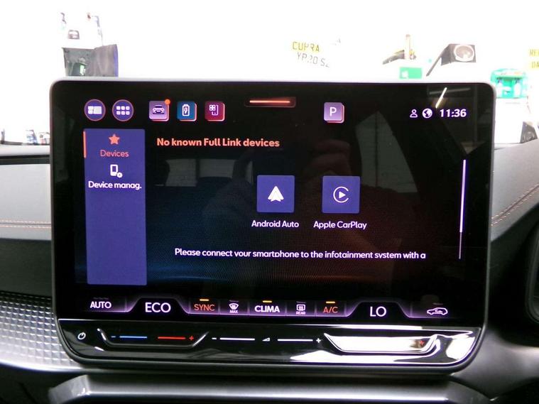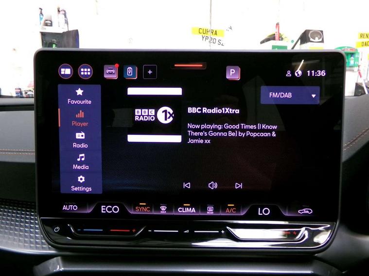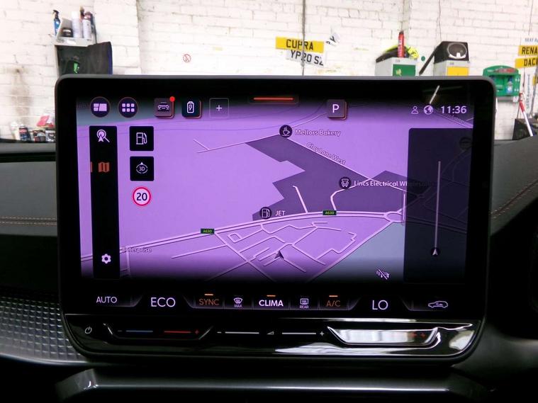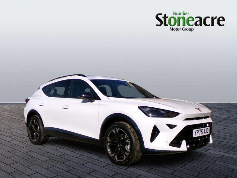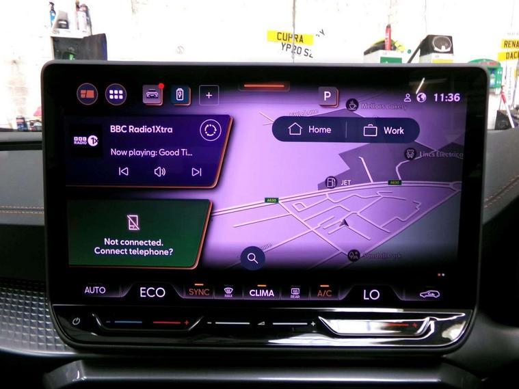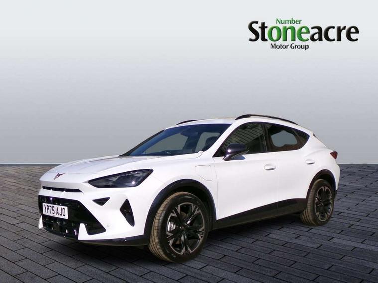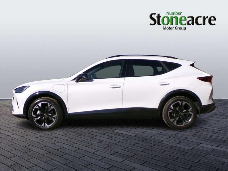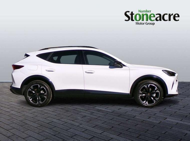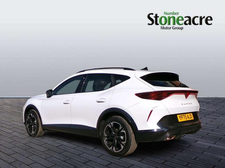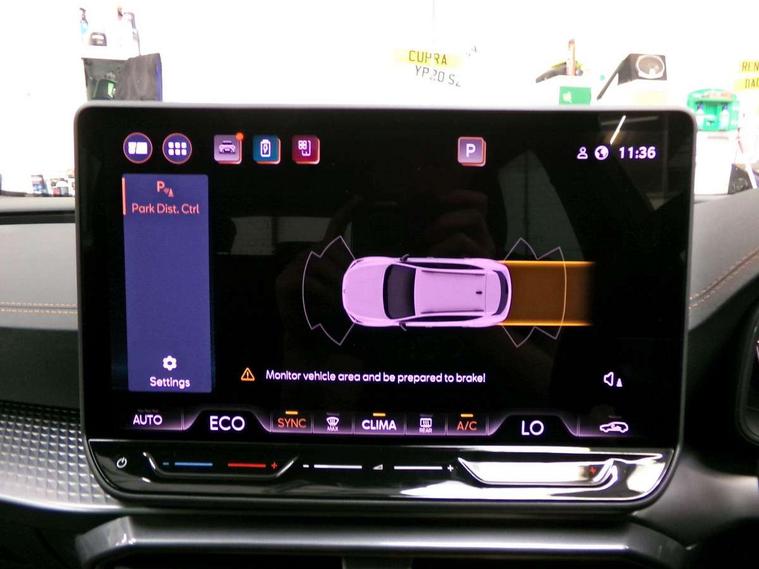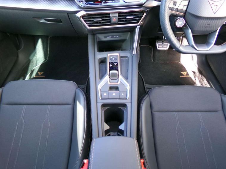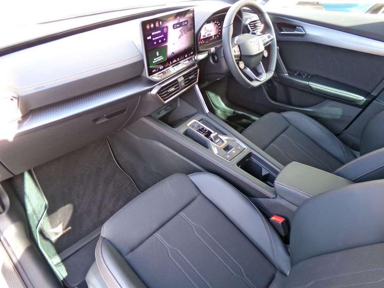 10.25" digital cockpit and configurable dashboard, Adaptive cruise control with follow-to-stop and speed limiter, Advanced driver alert system, Driving profile selection, Dynamic road sign display, Emergency steering support with turn assist, Forward collision warning with automatic braking, Front and rear parking sensors, Front cross traffic assist, Full link phone integration, Lane assist, Progressive steering, RPM, trip computer, outside temp gauge, instrument light brightness, low fuel warning light, lights on reminder, gearshift indicator, Service interval indicator, Start/stop system with regenerative braking, Voice control system, Wired Android Auto, Wireless apple carplay, Wireless phone charger, 10 amp mode 2 charging cable, 32 amp mode 3 charging cable, CUPRA sport suspension, Electronic locking differential and dynamic traction support, 2 front and 2 rear USB type C sockets, 7 speakers, Media system with navigation, 12.9" touchscreen display, voice control, DAB, steering wheel mounted controls, Auto dimming rear view mirror, Body colour door handles, Body coloured bumpers, Dark grey wing mirror, Daytime running light with automatic headlight control and coming home feature, Door panel ambient lighting, Dynamic headlight range control, Electric front/rear windows, Electrically adjustable, heated and folding door mirrors, Gloss black roof rails and window surrounds, High beam assist, LED 3rd brake light, LED front fog lamps with cornering function, LED Headlights, LED Taillights with dynamic indicator, Rain sensing wipers, Rear diffuser with copper simulated exhaust pipes, Rear fog lights, Rear side wing doors, Rear wash/wipe, Tinted rear windows, Welcome lights (within exterior mirror housing), 12V socket, 2 front and 2 rear reading lights, 3 seat bench in 2nd row, 60/40 split rear bench seat with armrest and mechanical seat release, Black headlining, Black interior roof lining, Cupra sports pedals, Dust/pollen filter, Front and rear head restraints, Front centre armrest, Heated supersports multifunction leather steering wheel with satellite buttons and gear shift paddles, Height/reach adjust steering wheel, Illuminated aluminium doorsteps, Illuminated interior front door sills, Illuminated sunvisor with mirror, Interior ambient lighting, Isofix, Manually adjustable height and lumbar support for front seats, PVC/Cloth upholstery with copper stitching + Sport seats, Satellite steering wheel, Single front passenger seat, Storage pockets on rear of front seats, Three zone climate control with control panel in rear, 3 point seatbelts on all rear seats, ABS, Brake control system - ESC and brake booster, Child proof door locks, Driver and front passenger airbags with front passenger airbag de-activation, Electronic parking brake, Front and rear disc brakes, Front side curtain airbags, Hill hold control, Public e-call, Seat belt reminder for front and rear seats, Tyre pressure monitoring system, Anti theft alarm system, Central locking system Keyless Go, Locking wheel bolts, Warranty - 5 years/90, 000 miles, Copper and aluminium interior detailing, 18" Sonora machined silver alloy wheels, Breakdown and tool kit,