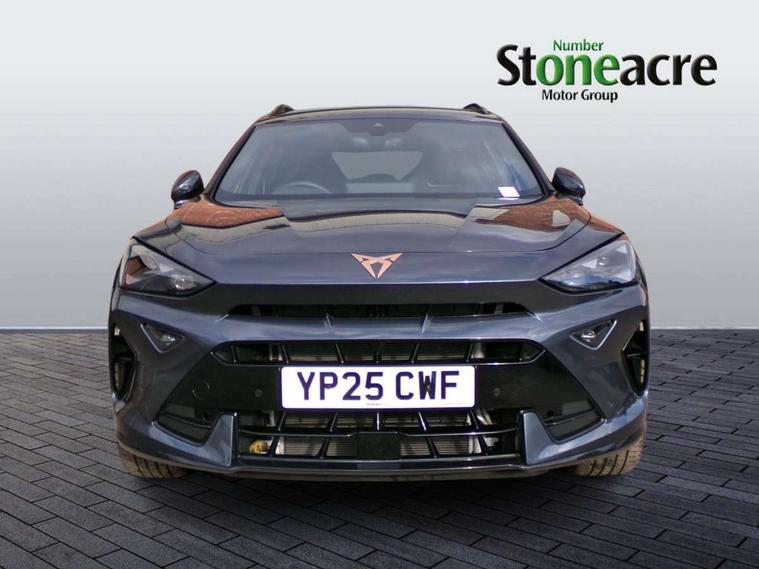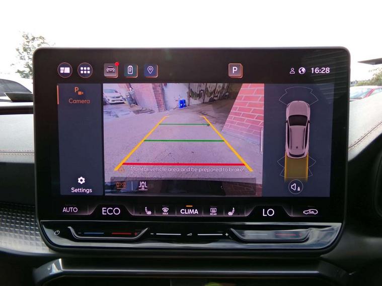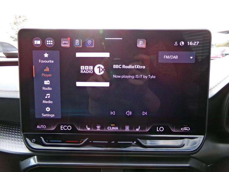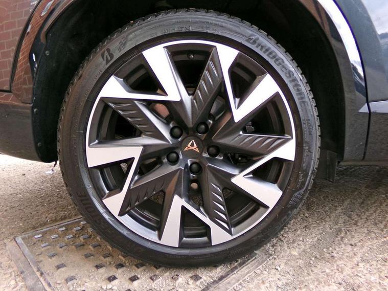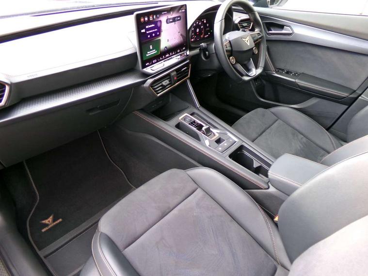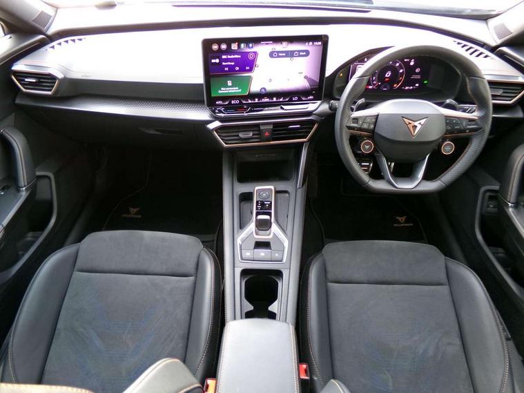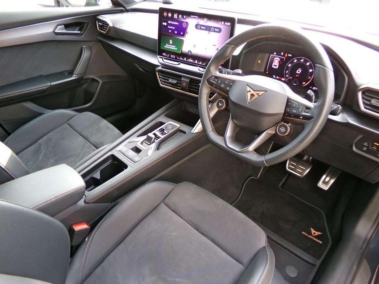 10.25" digital cockpit and configurable dashboard, Adaptive cruise control with follow-to-stop and speed limiter, Advanced driver alert system, Dynamic chassis control with driving profile selection (Comfort, Sport, CUPRA, Individual), Dynamic road sign display, Emergency steering support with turn assist, Forward collision warning with automatic braking, Front and rear parking sensors, Full link phone integration, Lane assist, Rear view camera, RPM, trip computer, outside temp gauge, instrument light brightness, low fuel warning light, lights on reminder, gearshift indicator, Service interval indicator, Speed sensitive power steering, Start/stop system with regenerative braking, Virtual pedal and electric tailgate, Voice control system, Wired Android Auto, Wireless apple carplay, Wireless phone charger, 10 amp mode 2 charging cable, 32 amp mode 3 charging cable, Adaptive chassis control with continuous operation, CUPRA sport suspension, Electronic locking differential and dynamic traction support, 2 front and 2 rear USB type C sockets, Media system with navigation, 12.9" touchscreen display, voice control, DAB, steering wheel mounted controls, Auto dimming rear view mirror, Body colour door handles, Body coloured bumpers, Dark grey wing mirror, Daytime running light with automatic headlight control and coming home feature, Door panel ambient lighting, Dynamic headlight range control, Electric front/rear windows, Electrically adjustable heated and folding door mirrors with memory function, Gloss black roof rails and window surrounds, High beam assist, LED 3rd brake light, LED front fog lamps with cornering function, LED Taillights with dynamic indicator, Matrix LED headlights with multifunction camera, Rain sensing wipers, Rear diffuser with copper simulated exhaust pipes, Rear fog lights, Rear side wing doors, Rear wash/wipe, Tinted rear windows, Welcome lights (within exterior mirror housing), 12V socket, 2 front and 2 rear reading lights, 3 seat bench in 2nd row, 60/40 split rear bench seat with armrest and mechanical seat release, Black headlining, Black interior roof lining, Cupra sports pedals, Dust/pollen filter, Electrically adjustable front seats with lumbar support and memory function, Front and rear head restraints, Front centre armrest, Heated front seats, Heated supersports multifunction leather steering wheel with satellite buttons and gear shift paddles, Height/reach adjust steering wheel, Illuminated aluminium doorsteps, Illuminated interior front door sills, Illuminated sunvisor with mirror, Isofix, Leather dashboard, door insert and side trim panel, LED smart wraparound lighting, PVC/Dinamica microfiber upholstery + bucket seats, Satellite steering wheel, Single front passenger seat, Storage pockets on rear of front seats, Three zone climate control with control panel in rear, 3 point seatbelts on all rear seats, ABS, Brake control system - ESC and brake booster, Child proof door locks, Driver and front passenger airbags with front passenger airbag de-activation, Electronic parking brake, Front and rear disc brakes, Front side curtain airbags, Hill hold control, Public e-call, Seat belt reminder for front and rear seats, Tyre pressure monitoring system, Anti theft alarm system, KESSY Advanced - Keyless start, keyless entry with SAFELOCK, Locking wheel bolts, Copper and aluminium interior detailing, 19" Sandstorm machined sport black and silver alloy wheels, Breakdown and tool kit,