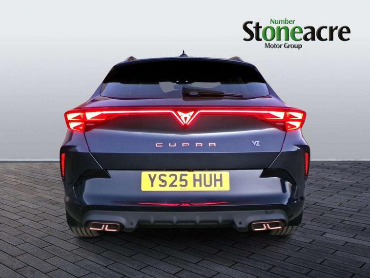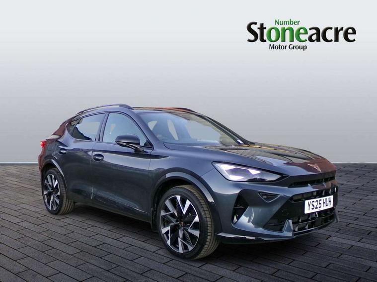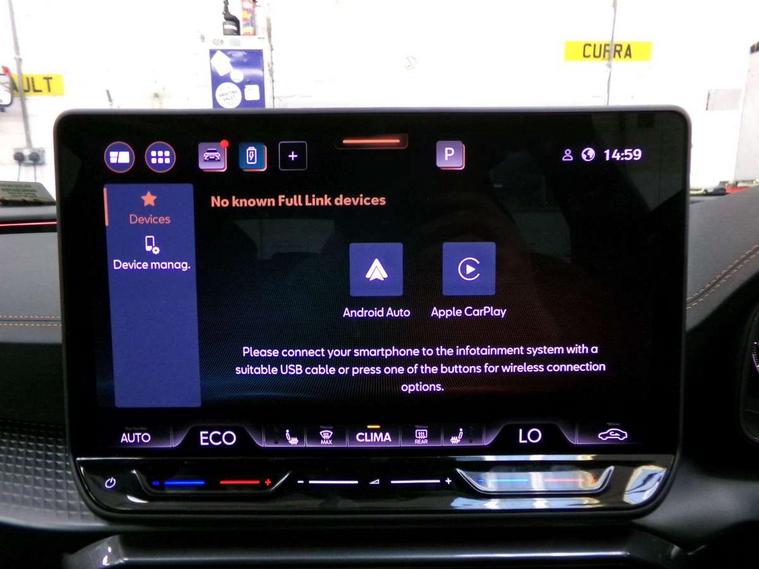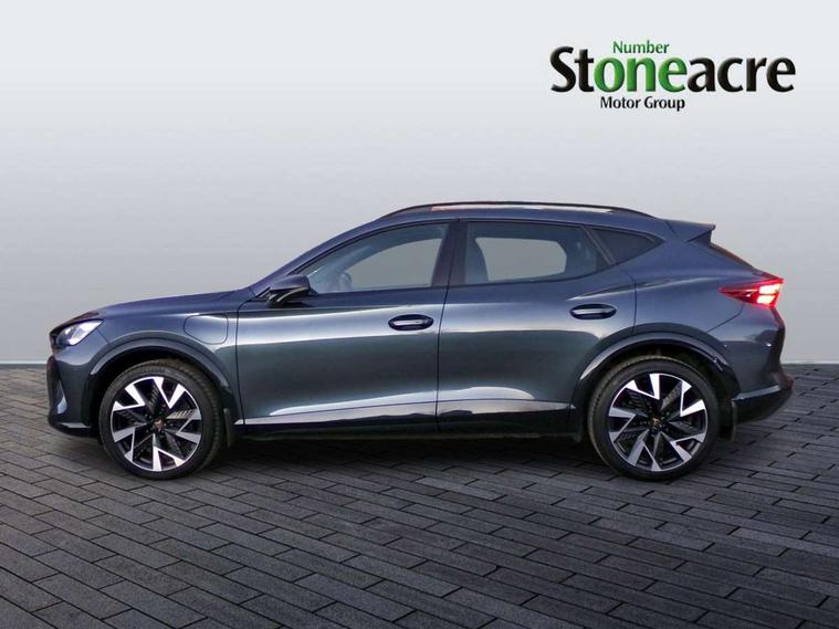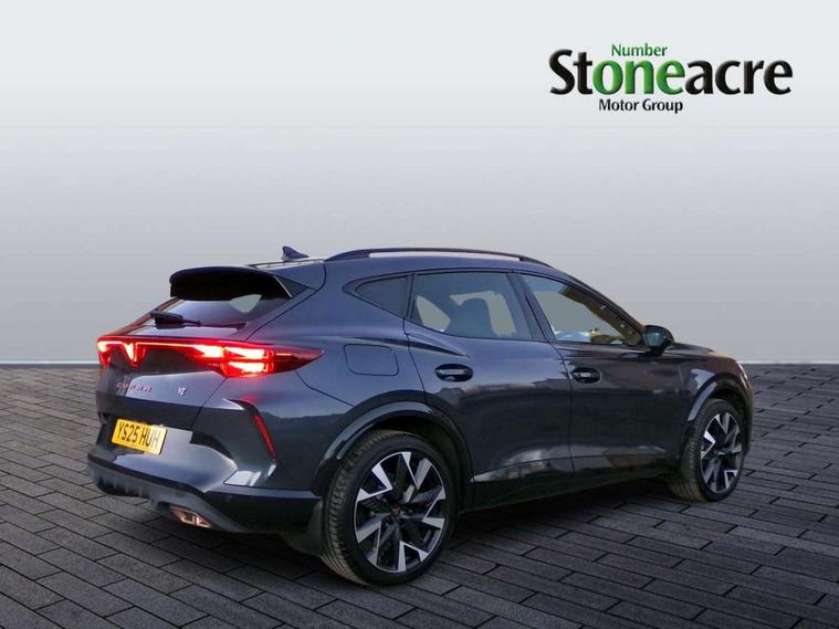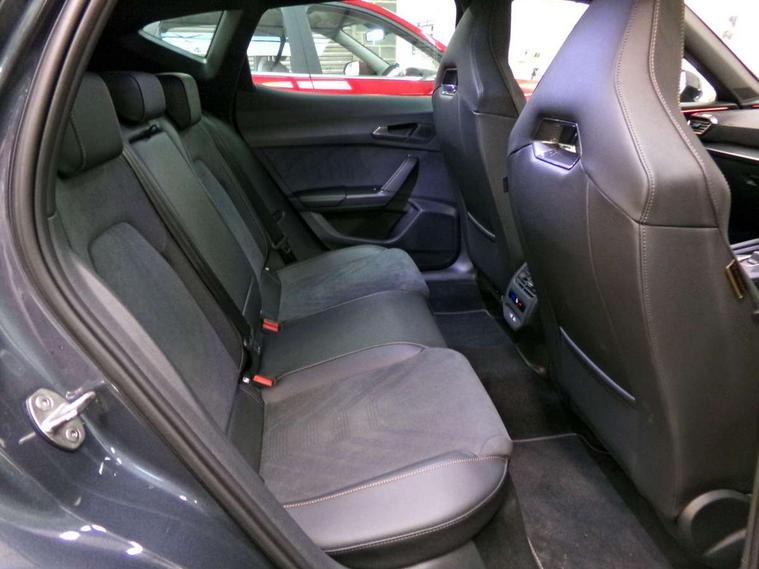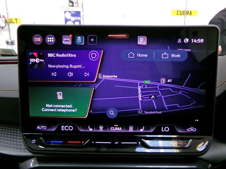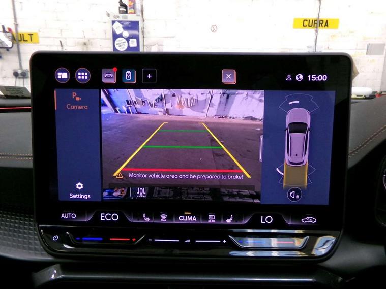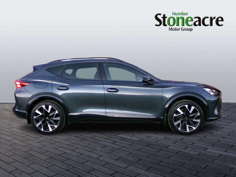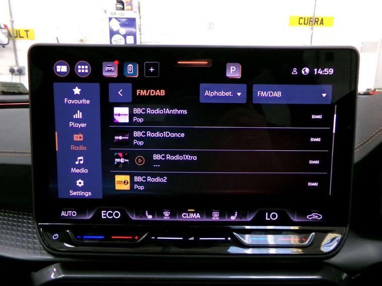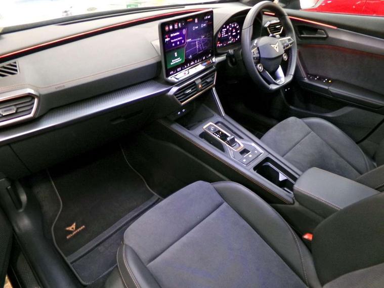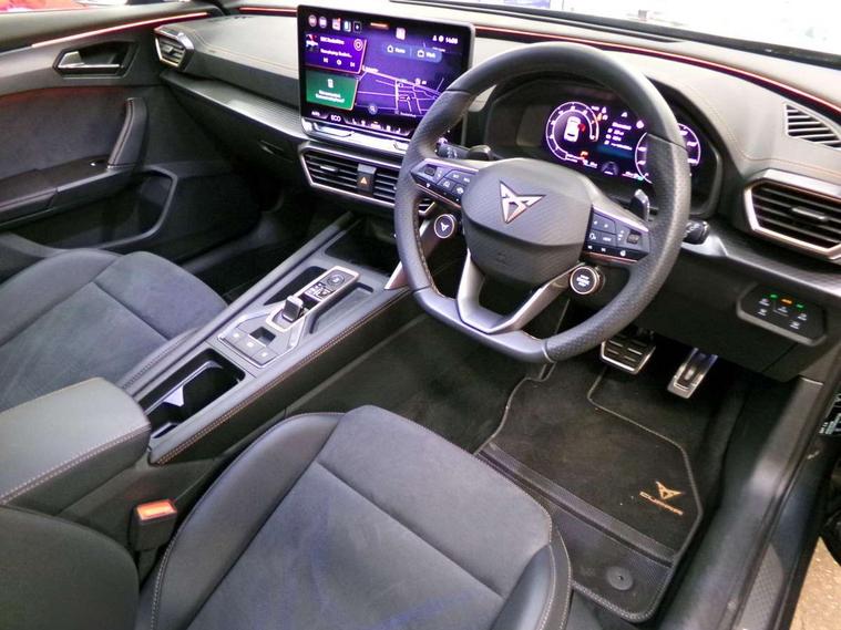 10.25" digital cockpit and configurable dashboard, Adaptive cruise control with follow-to-stop and speed limiter, Advanced driver alert system, Dynamic chassis control with driving profile selection (Comfort, Sport, CUPRA, Individual), Dynamic road sign display, Emergency steering support with turn assist, Forward collision warning with automatic braking, Front and rear parking sensors, Full link phone integration, Lane assist, Rear view camera, RPM, trip computer, outside temp gauge, instrument light brightness, low fuel warning light, lights on reminder, gearshift indicator, Service interval indicator, Speed sensitive power steering, Start/stop system with regenerative braking, Virtual pedal and electric tailgate, Voice control system, Wired Android Auto, Wireless apple carplay, Wireless phone charger, 10 amp mode 2 charging cable, 32 amp mode 3 charging cable, Adaptive chassis control with continuous operation, CUPRA sport suspension, Electronic locking differential and dynamic traction support, 2 front and 2 rear USB type C sockets, Media system with navigation, 12.9" touchscreen display, voice control, DAB, steering wheel mounted controls, Auto dimming rear view mirror, Body colour door handles, Body coloured bumpers, Dark grey wing mirror, Daytime running light with automatic headlight control and coming home feature, Door panel ambient lighting, Dynamic headlight range control, Electric front/rear windows, Electrically adjustable heated and folding door mirrors with memory function, Gloss black roof rails and window surrounds, High beam assist, LED 3rd brake light, LED front fog lamps with cornering function, LED Taillights with dynamic indicator, Matrix LED headlights with multifunction camera, Rain sensing wipers, Rear diffuser with copper simulated exhaust pipes, Rear fog lights, Rear side wing doors, Rear wash/wipe, Tinted rear windows, Welcome lights (within exterior mirror housing), 12V socket, 2 front and 2 rear reading lights, 3 seat bench in 2nd row, 60/40 split rear bench seat with armrest and mechanical seat release, Black headlining, Black interior roof lining, Cupra sports pedals, Dust/pollen filter, Electrically adjustable front seats with lumbar support and memory function, Front and rear head restraints, Front centre armrest, Heated front seats, Heated supersports multifunction leather steering wheel with satellite buttons and gear shift paddles, Height/reach adjust steering wheel, Illuminated aluminium doorsteps, Illuminated interior front door sills, Illuminated sunvisor with mirror, Isofix, Leather dashboard, door insert and side trim panel, LED smart wraparound lighting, PVC/Dinamica microfiber upholstery + bucket seats, Satellite steering wheel, Single front passenger seat, Storage pockets on rear of front seats, Three zone climate control with control panel in rear, 3 point seatbelts on all rear seats, ABS, Brake control system - ESC and brake booster, Child proof door locks, Driver and front passenger airbags with front passenger airbag de-activation, Electronic parking brake, Front and rear disc brakes, Front side curtain airbags, Hill hold control, Public e-call, Seat belt reminder for front and rear seats, Tyre pressure monitoring system, Anti theft alarm system, KESSY Advanced - Keyless start, keyless entry with SAFELOCK, Locking wheel bolts, Copper and aluminium interior detailing, 19" Sandstorm machined sport black and silver alloy wheels, Breakdown and tool kit,