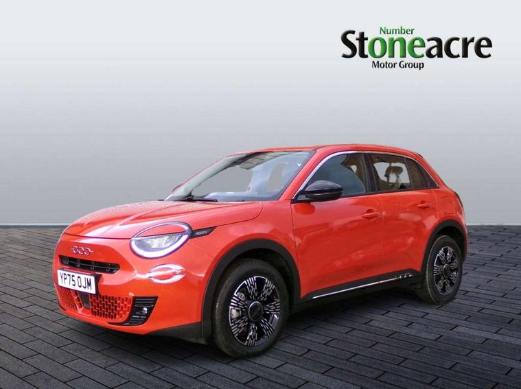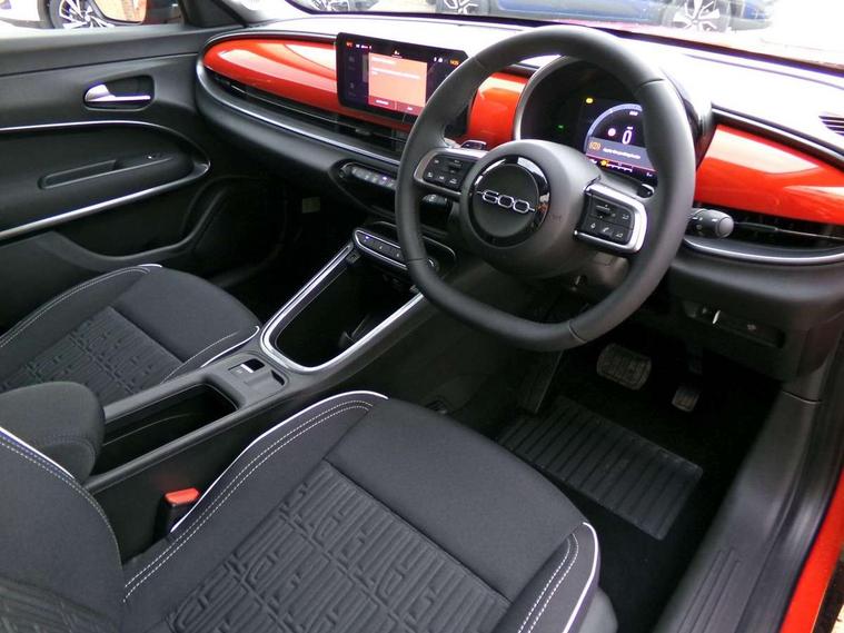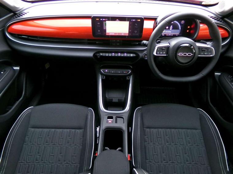7" TFT digital cluster, Bluetooth connectivity, BSRF connectivity box, Connected services, Cruise control, Drowsy driver detection, Emergency E-call assist, Engine emission level default, GSR II step 1, Intelligent speed assist, Lane keeping assistant (LKA), Odometer, Power assist steering, Rain and dusk sensors, Rear parking sensors, Traffic sign recognition, Wireless apple car play/android Auto, Without drive mode selector, L2-AGM 12V battery, 1st Row USB type-A and USB type-C, 4 speaker audio system, Radio, Uconnect infotainment 10.25" touchscreen with DAB, All power windows express Up/Down, Auto dimming frameless rear view mirror, Automatic headlights, Body coloured door handles, Chrome day light openings, Electric adjustable door mirrors, Exterior chrome accents, Front and rear Chromed 600 logo, Gloss black finish B pillar, Gloss black shark fin antenna, Glossy black door mirrors, Heated windscreen wiper blade area, LED 3rd brake light, LED daytime running lights, LED Fog lamps with cornering function, LED front signature lighting, LED front turn indicators and position lights, LED rear lights, LED rear signature lighting, LED reflector headlamps, Matt black side skirts with 600 chromed logo, Rear bumper embossed 600 logo, Rear roof spoiler, Rear side wing doors, Rear wiper, 2 Spoke synthetic leather steering wheel with audio control, 3 rear headrests, 3 seat bench in 2nd row, 4 way manually adjustable passenger seat, 6 way manually adjustable drivers seat, Auxilliary 12V power socket, Body colour dashboard fascia, Chrome interior door handles, Dark metachrome dashboard ring, English handbook, Front centre armrest, Front headrests, Front passenger grab handle, Front seatback pockets, ISOFIX attachment on front passenger and rear passenger seats, Manual climate control, Metachrome central compartment bezel, Monogram fabric upholstery, Paddle shifts, Partial body cover for shipment, Predisposal for accessory upgrade to default tunnel pad cover (dedicated prnd bezel), Rear seat 40/60 split, Single front passenger seat, Smart 15L storage central tunnel with tunnel pad cover, Sunvisor label ciao Fiat, Sunvisors with vanity mirrors, 3x3 point rear seatbelts, 6 airbags, ABS, Autonomous Emergency Brake (AEB) & Vulnerable Road User (VRU) Protection, Child locks on rear doors, Electronic parking brake with auto hold, ESC (Electronic Stability Control), Front passenger airbag deactivation, Seatbelt reminder and pretensioners for all seats, Anti-theft volumetric alarm, Anti-theft wheel bolts, Keyless Go, 17" Diamond cut alloy wheels, Fix and go puncture repair kit,