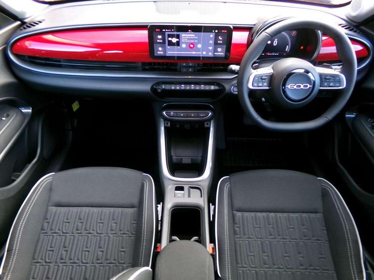 7" TFT digital cluster, Bluetooth connectivity, BSRF connectivity box, Connected services, Cruise control, Drowsy driver detection, Emergency E-call assist, Engine emission level default, GSR II step 1, Intelligent speed assist, Lane keeping assistant (LKA), Odometer, Power assist steering, Rain and dusk sensors, Rear parking sensors, Traffic sign recognition, Wireless apple car play/android Auto, Without drive mode selector, L2-AGM 12V battery, 1st Row USB type-A and USB type-C, 4 speaker audio system, Radio, Uconnect infotainment 10.25" touchscreen with DAB, All power windows express Up/Down, Auto dimming frameless rear view mirror, Automatic headlights, Body coloured door handles, Chrome day light openings, Electric adjustable door mirrors, Exterior chrome accents, Front and rear Chromed 600 logo, Gloss black finish B pillar, Gloss black shark fin antenna, Glossy black door mirrors, Heated windscreen wiper blade area, LED 3rd brake light, LED daytime running lights, LED Fog lamps with cornering function, LED front signature lighting, LED front turn indicators and position lights, LED rear lights, LED rear signature lighting, LED reflector headlamps, Matt black side skirts with 600 chromed logo, Rear bumper embossed 600 logo, Rear roof spoiler, Rear side wing doors, Rear wiper, 2 Spoke synthetic leather steering wheel with audio control, 3 rear headrests, 3 seat bench in 2nd row, 4 way manually adjustable passenger seat, 6 way manually adjustable drivers seat, Auxilliary 12V power socket, Body colour dashboard fascia, Chrome interior door handles, Dark metachrome dashboard ring, English handbook, Front centre armrest, Front headrests, Front passenger grab handle, Front seatback pockets, ISOFIX attachment on front passenger and rear passenger seats, Manual climate control, Metachrome central compartment bezel, Monogram fabric upholstery, Paddle shifts, Partial body cover for shipment, Predisposal for accessory upgrade to default tunnel pad cover (dedicated prnd bezel), Rear seat 40/60 split, Single front passenger seat, Smart 15L storage central tunnel with tunnel pad cover, Sunvisor label ciao Fiat, Sunvisors with vanity mirrors, 3x3 point rear seatbelts, 6 airbags, ABS, Autonomous Emergency Brake (AEB) & Vulnerable Road User (VRU) Protection, Child locks on rear doors, Electronic parking brake with auto hold, ESC (Electronic Stability Control), Front passenger airbag deactivation, Seatbelt reminder and pretensioners for all seats, Anti-theft volumetric alarm, Anti-theft wheel bolts, Keyless Go, 17" Diamond cut alloy wheels, Fix and go puncture repair kit,