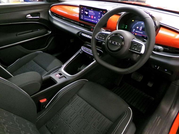 7" TFT digital cluster, Bluetooth connectivity, BSRF connectivity box, Connected services, Cruise control, Drowsy driver detection, Emergency E-call assist, Engine emission level default, GSR II step 1, Intelligent speed assist, Lane keeping assistant (LKA), Odometer, Power assist steering, Rain and dusk sensors, Rear parking sensors, Traffic sign recognition, Wireless apple car play/android Auto, Without drive mode selector, L2-AGM 12V battery, 1st Row USB type-A and USB type-C, 4 speaker audio system, Radio, Uconnect infotainment 10.25" touchscreen with DAB, All power windows express Up/Down, Auto dimming frameless rear view mirror, Automatic headlights, Body coloured door handles, Chrome day light openings, Electric adjustable door mirrors, Exterior chrome accents, Front and rear Chromed 600 logo, Gloss black finish B pillar, Gloss black shark fin antenna, Glossy black door mirrors, Heated windscreen wiper blade area, LED 3rd brake light, LED daytime running lights, LED Fog lamps with cornering function, LED front signature lighting, LED front turn indicators and position lights, LED rear lights, LED rear signature lighting, LED reflector headlamps, Matt black side skirts with 600 chromed logo, Rear bumper embossed 600 logo, Rear roof spoiler, Rear side wing doors, Rear wiper, 2 Spoke synthetic leather steering wheel with audio control, 3 rear headrests, 3 seat bench in 2nd row, 4 way manually adjustable passenger seat, 6 way manually adjustable drivers seat, Auxilliary 12V power socket, Body colour dashboard fascia, Chrome interior door handles, Dark metachrome dashboard ring, English handbook, Front centre armrest, Front headrests, Front passenger grab handle, Front seatback pockets, ISOFIX attachment on front passenger and rear passenger seats, Manual climate control, Metachrome central compartment bezel, Monogram fabric upholstery, Paddle shifts, Partial body cover for shipment, Predisposal for accessory upgrade to default tunnel pad cover (dedicated prnd bezel), Rear seat 40/60 split, Single front passenger seat, Smart 15L storage central tunnel with tunnel pad cover, Sunvisor label ciao Fiat, Sunvisors with vanity mirrors, 3x3 point rear seatbelts, 6 airbags, ABS, Autonomous Emergency Brake (AEB) & Vulnerable Road User (VRU) Protection, Child locks on rear doors, Electronic parking brake with auto hold, ESC (Electronic Stability Control), Front passenger airbag deactivation, Seatbelt reminder and pretensioners for all seats, Anti-theft volumetric alarm, Anti-theft wheel bolts, Keyless Go, 17" Diamond cut alloy wheels, Fix and go puncture repair kit,