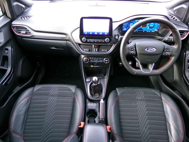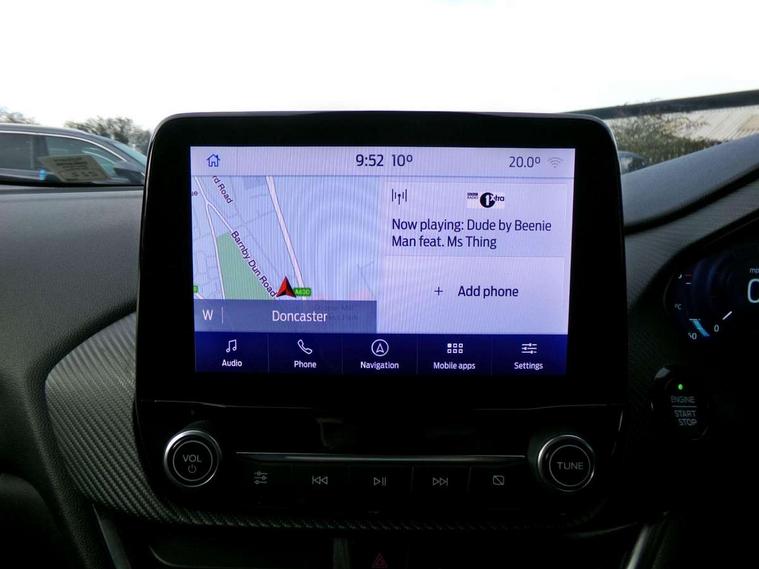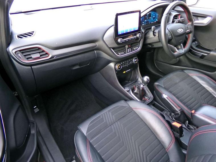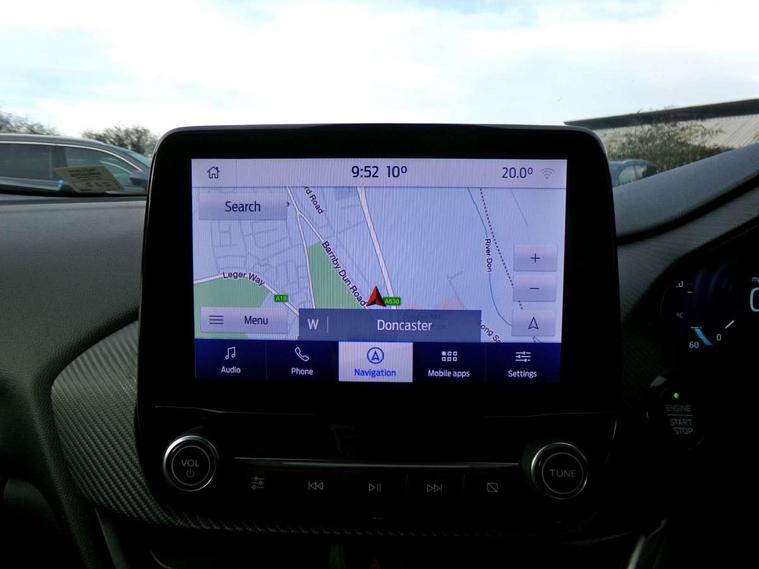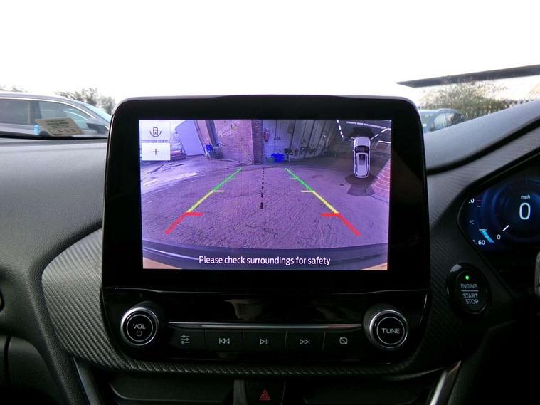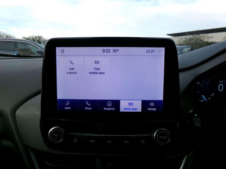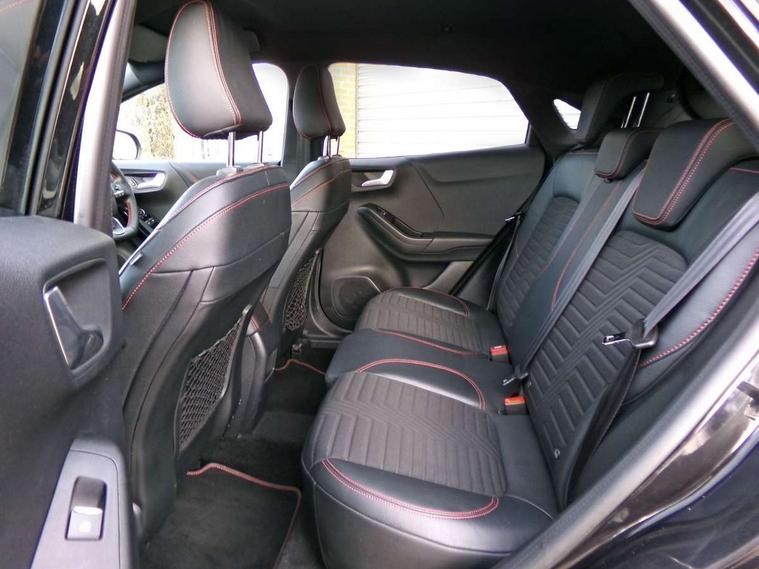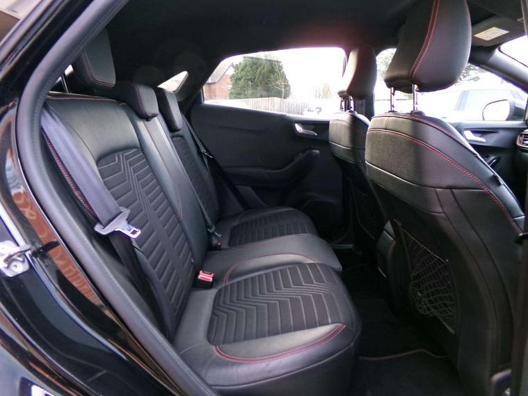 Ford easy fuel, Full digital 12.3" instrument cluster, Lane keeping aid with lane departure warning, Power liftgate hands free including keyless start + entry, motion sensing key fob, Rear parking sensor, Selectable drive modes(Normal, Eco, Sport, Slippery and Trail), Wireless charging pad, Automatic headlights with rain sensing wipers and auto high beam, Fixed LED headlamps, Front fog lights with cornering lights and LED rear lamps, Power foldable heated door mirrors with puddle lamps, Privacy glass to side rear windows and tailgate glass, Quickclear heated windscreen, ST-Line body kit with large rear spoiler wth sports suspension, Alloy sports pedals, Casual partial leather upholstery with salerno bolster, Centre console with armrest and stowage, Driver and passenger seat lumbar and height adjust, EATC - Electronic Auto Temperature control, Ford megabox extended bootspace, Front and rear floor mats, ST-Line flat bottomed leather steering wheel with leather handbrake and aluminium gear knob, B&O Premium Audio system + Ford SYNC 3 navigation pack - Puma, Driver assistance pack - Puma, 3 rear seatbelts, Electronic stability control (ESC) and hill start assist, Pre-collision assist with autonomous emergency braking, pedestrian/cyclist detection & post-collision braking, Tyre pressure monitoring system (TPMS), Thatcham alarm, Carbon look interior deco spears, 18" 5 spoke matt black machined finish alloy wheels, Tyre inflation kit,