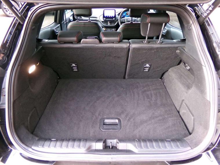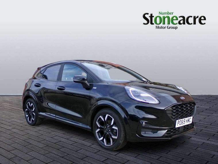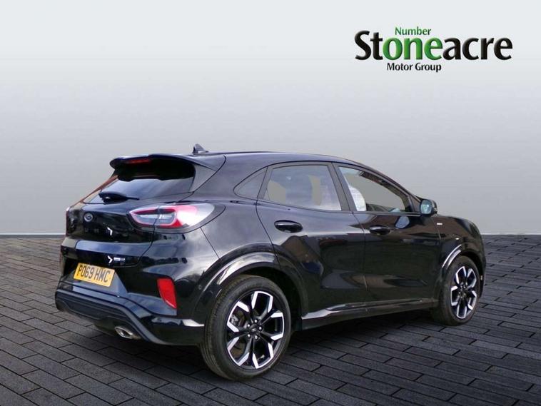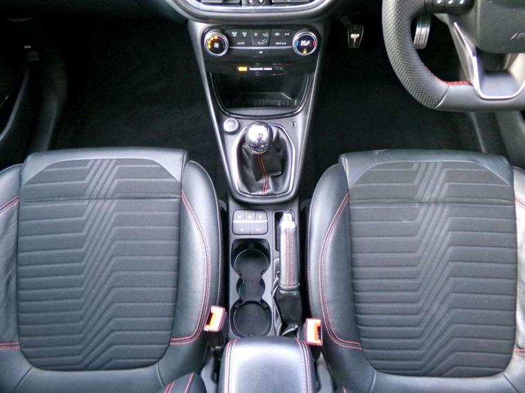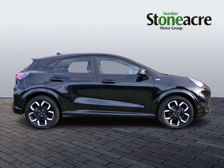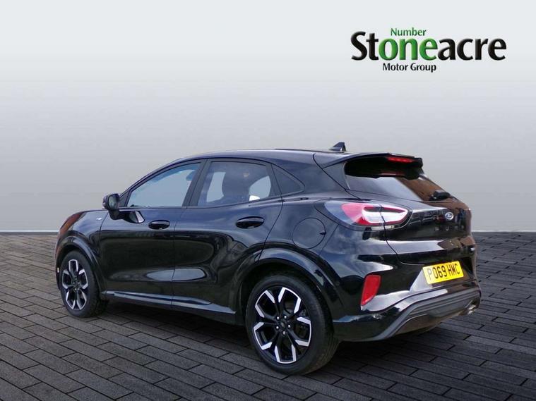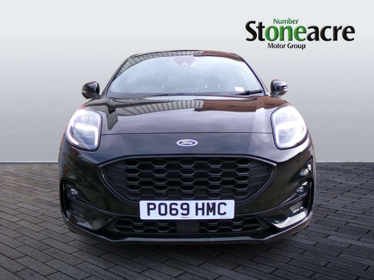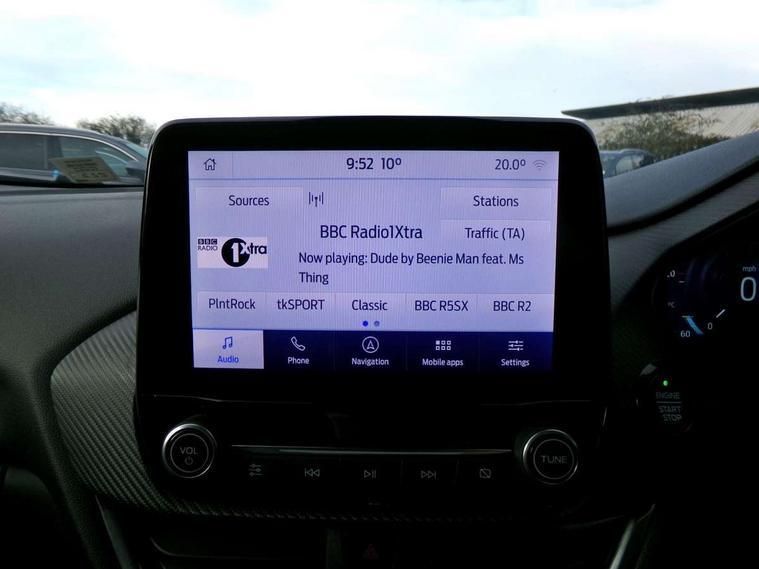 Ford easy fuel, Full digital 12.3" instrument cluster, Lane keeping aid with lane departure warning, Power liftgate hands free including keyless start + entry, motion sensing key fob, Rear parking sensor, Selectable drive modes(Normal, Eco, Sport, Slippery and Trail), Wireless charging pad, Automatic headlights with rain sensing wipers and auto high beam, Fixed LED headlamps, Front fog lights with cornering lights and LED rear lamps, Power foldable heated door mirrors with puddle lamps, Privacy glass to side rear windows and tailgate glass, Quickclear heated windscreen, ST-Line body kit with large rear spoiler wth sports suspension, Alloy sports pedals, Casual partial leather upholstery with salerno bolster, Centre console with armrest and stowage, Driver and passenger seat lumbar and height adjust, EATC - Electronic Auto Temperature control, Ford megabox extended bootspace, Front and rear floor mats, ST-Line flat bottomed leather steering wheel with leather handbrake and aluminium gear knob, B&O Premium Audio system + Ford SYNC 3 navigation pack - Puma, Driver assistance pack - Puma, 3 rear seatbelts, Electronic stability control (ESC) and hill start assist, Pre-collision assist with autonomous emergency braking, pedestrian/cyclist detection & post-collision braking, Tyre pressure monitoring system (TPMS), Thatcham alarm, Carbon look interior deco spears, 18" 5 spoke matt black machined finish alloy wheels, Tyre inflation kit,