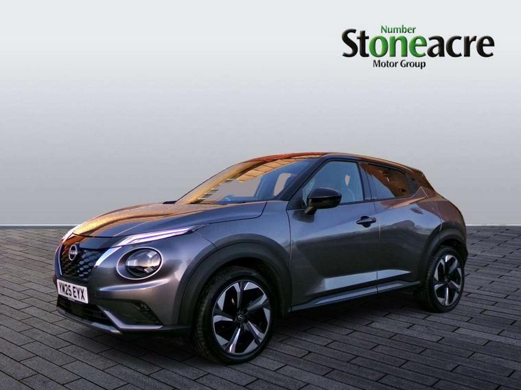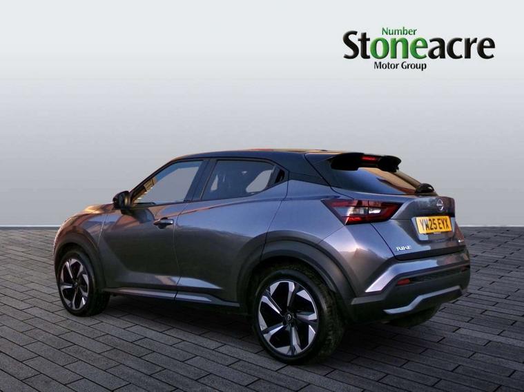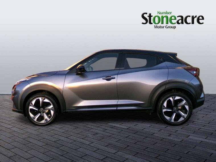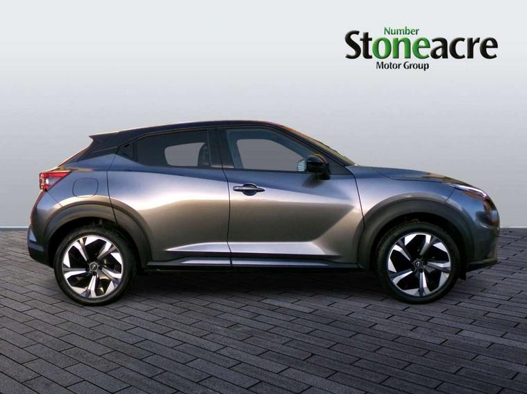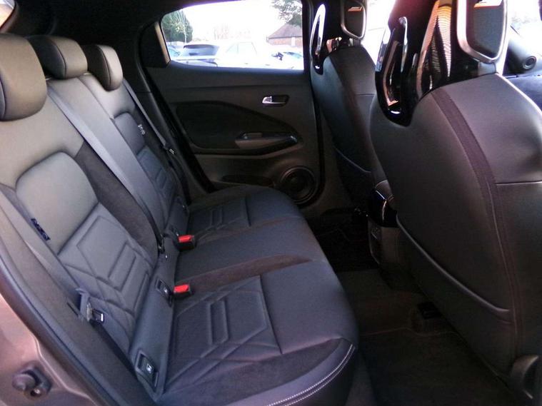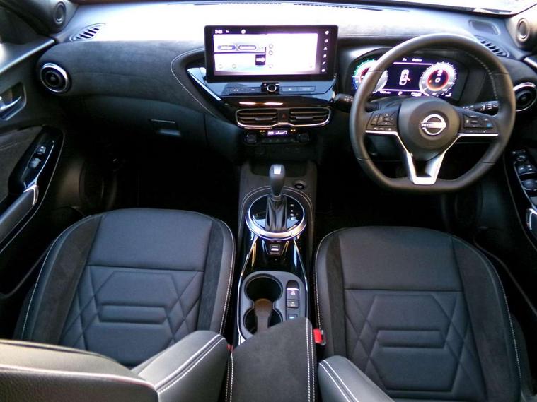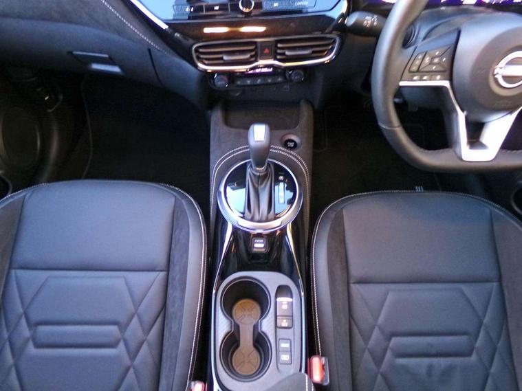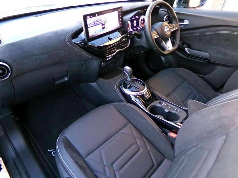 12.3" full colour TFT screen combimeter, Drive modes select (Eco, normal and sport), e-Pedal step, Emergency and breakdown call, EV mode switch, Front parking sensor, Intelligent driver alert system, Intelligent lane intervention, Lane departure warning system, Nissan connect 12.3" touch screen entertainment system, Nissan connect nav with TomTom traffic, Nissan connect services, Outside temperature sensor, Power Steering, Rear parking sensor, Stop/start button, Traffic sign recognition, Trip computer, Voice recognition, WiFi connectivity, Wireless Apple CarPlay and Google Android auto, Wireless Smartphone charger, 10 Bose speakers 6 speakers and 2 headrest speakers for driver/passenger seats, 2 X Rear console USB port, Bluetooth system, USB, Aux-in and 12V socket, Bose personal sound stage control, DAB Digital radio, Auto dimming frameless rear view mirror, Automatic hazard signal with emergency stop signal, Body colour door handles, Electrically adjustable door mirrors with integrated indicators, Follow me home headlights, Front and rear electric window with one touch driver window, Heated and auto folding door mirrors, High beam assist, LED 3rd brake light, LED daytime running lights, LED front fog lights, LED headlamps, LED rear fog lamp, LED rear lamps, One touch passenger window, Rain sensor windscreen wipers, Rear privacy glass, Rear side wing doors, Rear wiper, Roof spoiler, Shark fin roof antenna in solid Black, Three blink turn signal, 3 height adjustable rear headrests, 3 seat bench in 2nd row, 60/40 split folding rear seat, Automatic climate control, Card holder on driver sunvisor, Door ambient lighting, Driver seat back pocket, Driver side rear coat hanger, Driver/passenger sunvisors and vanity mirrors, Front and rear cabin lights, Front armrest, Front door pockets with bottle holders, Front head restraints, Front/rear passenger grab handles, Gear console ambient circle lighting, Height adjustable driver's seat, Internal chrome door handles, Leather gearshift knob, Luggage board, Luggage space lighting, Monoform sporty seats, Multifunction steering wheel, Passenger seat back pocket, Rear door bottle holders, Single front passenger seat, Smooth synthetic leather steering wheel, Synthetic leather kneepad, Telescopic steering wheel adjustment, Two cupholders in front centre console, Two rear isofix child seat anchorage points with top tether, Welcome light and console tray ambient lighting, Heat pack with height adjustable passenger seats - Juke, Interior personalisation pack - Juke, ProPilot pack - Juke Auto, Satin grey exterior personalisation pack - Juke, ABS with EBD and brake assist, Active ride control, Active Trace Control, Driver and passenger airbags, Driver and passenger side airbags, Electric handbrake with auto hold function, Electronic Stability Programme (ESP), Front and rear curtain airbags, Height adjustable seatbelts, Hill start assist, Intelligent emergency braking with pedestrian and cyclist recognition, Rear door child safety locks, Seatbelt reminder for driver/front passenger and rear seats, Three 3 point rear seatbelts, Traction control, Tyre pressure monitoring system, VDC Dynamic Vehicle Control, Alarm, Immobiliser, Intelligent key and start push button with walk away lock and approach unlock functions, Remote central locking, 19" Aero alloy wheels, Tyre puncture repair kit,