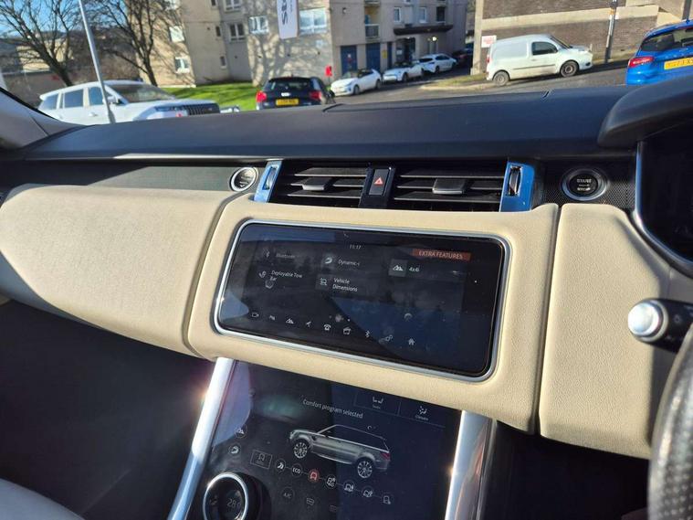 All Terrain Info Centre, Android Auto, Apple car play, Bluetooth connectivity, Electric power assisted steering (EPAS), Incontrol apps in vehicle touchscreen, Interactive Driver display instrument cluster, Mist sensor, Navigation pro system with 10" touch screen, app interface and media storage, Pro services and wifi hotspot, Push button start, Remote premium - Upgraded Incontrol remote app including remote climate control (engine dependent), remote lock + Unlock and remote beep + flash, TFT Virtual Instrument Panel, Touch pro duo system, Trip computer, Adaptive dynamics, All terrain progress control, Configurable dynamics, Electronic air suspension, Gradient release control (GRC), Terrain Response 2 with dynamic program, Twin speed transfer box, Bluetooth audio streaming, DAB Radio (Digital Audio Broadcasting), Incontrol protect - SOS emergency call with automatic collision detection, optimised assistance call and Incontrol remote app essential, USB/aux input socket, Acoustic front and toughened rear side glass, Acoustic laminated front windows, Adaptive brake lights, Auto dimming interior rear view mirror, Automatic headlights, Body coloured bumpers, Centre high mounted stop light, Electric windows with one touch open/close and anti trap, Electrical towing preparation, Engine cover, Follow me home lighting, Front and rear recovery eyes, Front fog lights, Headlight power wash, Heated rear window, Heated windscreen includes heated washer jets, LED rear lamps, Rain sensing windscreen wipers, Rear fog lights, Rear side wing doors, Rear wash/wipe, Remote window closing, Side repeater indicators in mirror, Standard bonnet, Trailer stability assist, 2 way active front head restraints, 2 way rear head restraints, 3 seat bench in 2nd row, Auto air recirculation, Centre console with armrest, Climate control memory, Customer configurable single point entry, Driver's footrest, Front and rear cupholders, Front door storage space, Front map lights, Front seat back map pockets, Front stowage pocket, Front/rear passenger grab handles, Isofix child seat preparation, Leather steering wheel, Loadspace light, Loadspace mounting provisions, Lockable glovebox, Multifunction steering wheel, Pollen filter, Power socket, Reach/rake electric adjustable steering column + entry/exit tilt away, Rear centre armrest, Rear ISOFIX, Roller blind loadspace cover, Single front passenger seat, Three 12V accessory power outlets, Smartphone pack - Range Rover Sport, 3 point seatbelts on all seats, Anti-lock braking system (ABS), Brake pre-fill technology, Cornering brake control (CBC), Curtain airbags, Customer configurable autolock, DSC - Dynamic Stability Control, Dual stage driver/passenger airbags, EBD - Electronic brakeforce distribution, Electric parking brake, Electronic traction control, Emergency braking includes city, urban AEB and pedestrian, Front seatbelt pretensioners, Gradient acceleration control, Height adjustable front seatbelts, Hill descent control, Hill launch assist, Low traction launch, Passenger seat occupant detector with front airbags, Power operated child locks, Roll stability control, Seatbelt warning, TPMS (Tyre pressure monitoring system), Immobiliser, Intrusion sensor, Keyless entry, Locking wheel nuts, Perimetric and volumetric anti theft alarm, Remote locking,