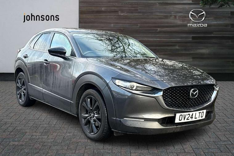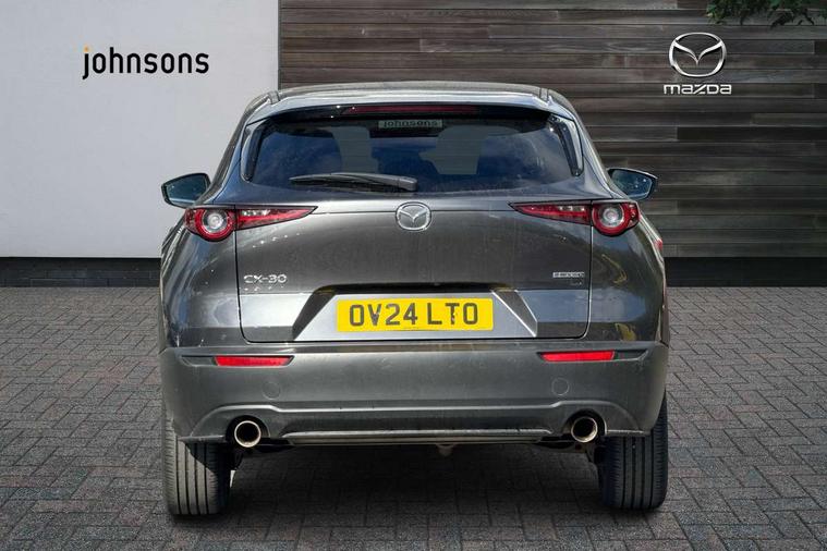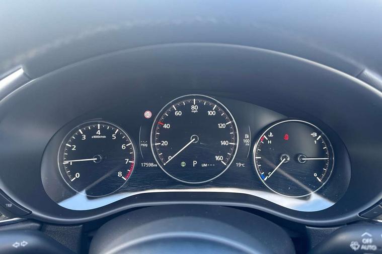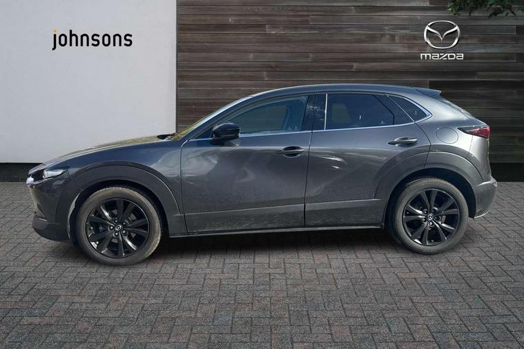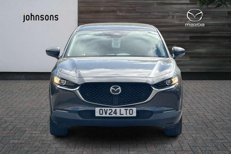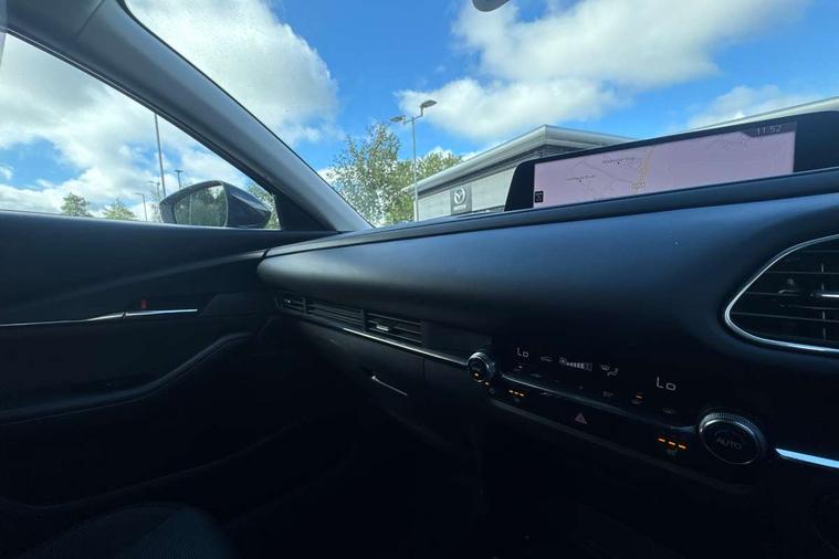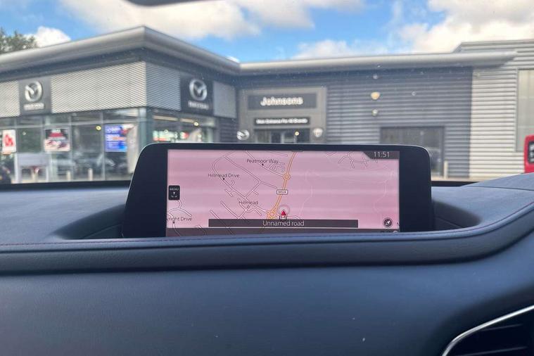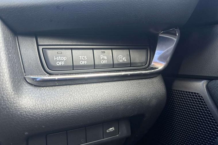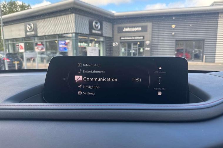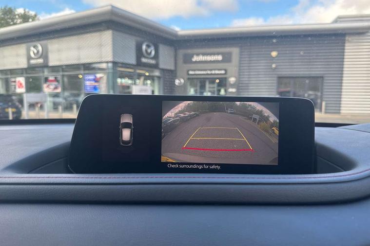 10.25" display with Mazda Connect infotainment, 7" TFT Colour driver instrument panel display, Adaptive cruise control (Mazda radar cruise control) features stop and go, Blind spot monitoring with rear cross traffic alert, Drive mode selector, Driver attention alert system, E-call with GPS, Emergency stop signalling system, Engine start/stop button, Front and rear parking sensors, Integrated bluetooth, Integrated Mazda navigation system, Intelligent speed assist, Lane keep assist system (LAS) with Lane departure warning system (LDWS), Mazda connected services, PAS, Power lift gate, Qi wireless charging, Reversing camera, Service indicator, Tailgate, Traffic sign recognition, Trip computer, Windscreen projected colour active driving display (HUD), Wireless Apple CarPlay/Android Auto, i-stop, 2 USB charging ports in front inner central armrest, AM / FM / DAB radio with 8 speakers, Multimedia Commander including separate volume dial, Steering wheel mounted audio/bluetooth controls, Auto dimming rear view mirror, Auto headlight levelling, B-pillar and C-pillar garnishes in piano black finish, Black electrically adjustable, heated auto power folding door mirrors with integrated indicators, Chrome finish signature wing in front grille, Coming/leaving home lighting function, Dual chrome exhaust, Dusk sensing headlights, Electric front/rear windows with one touch auto up/down, Front kodo turn signal, Gloss black front grille, Gloss black rear roof spoiler, LED headlights with halogen daytime running lights and high beam control, LED rear combination lights, Privacy glass (rear side windows and rear screen), Rain sensing front wipers with adjustable speed and intermittent wipe, Rear fog lights, Rear side wing doors, Rear wiper, Third brake light, 12V power outlet in centre console, 3 seat bench in 2nd row, 60/40 split fold down rear seats, Chrome interior trim accents with steering wheel centre bezel, surround of engine start / stop button and glove box handle, Cloth upholstery with red stitching and interior accents, Dark cloth door panel inserts, Dashboard, door cards and front centre armrest in black cloth with red stitching, Driver and front passenger visors with covered vanity mirror and driver ticket holder, Driver seat manual slide, recline, height and seat tilt adjust, Driver, front passenger and two rear door storage, Driver, Front passenger and two rear grab handles with coathooks, Dual zone climate control air conditioning with rear air vents, Folding rear centre armrest with two cup holders, Front and rear (x3) head restraints, Front and rear LED lighting, Front armrest, Front centre storage with two cupholders, Front passenger seatback pockets, Front passengers seat manual slide, recline and height adjustment, Gear shift indicator, Glovebox illumination, Heated front seats with 3 stage setting, ISOFIX child seat anchorage points attached on outer rear seats, Leather wrapped gear shift knob, Leather wrapped steering wheel with telescopic and tilt adjustment, LED luggage compartment lighting, Light roof headlining and pillars, Roof mounted sunglasses holder, Single front passenger seat, 3 point ELR front seat belts x2 with pretensioners, 3 point ELR rear seat belts, Anti-lock braking system (ABS), Drivers knee airbag, DSC - Dynamic Stability Control, Electronic parking brake with auto disengage function and auto hold function, Front and rear curtain airbags, Front dual stage driver and single stage front passenger airbags, Front passenger airbag cut-off switch, Front side airbags, Front smart city brake support, G-Vectoring control plus, Hill launch assist, Manual child lock in rear doors, Mild Hybrid system with regenerative braking, Seatbelt reminder for driver/front passenger and rear seats, Traction control system (TCS), Tyre pressure monitoring system (TPMS), Remote central locking with deadlocking and automatic door lock when driving, Smart keyless entry, Thatcham accredited alarm and immobiliser, 18" Black metallic alloy wheels, Emergency tyre repair kit,