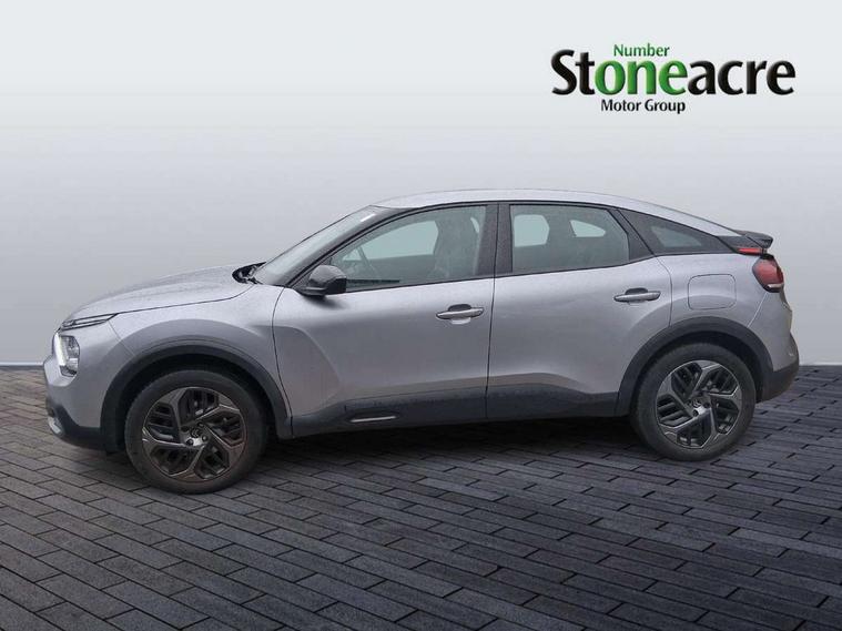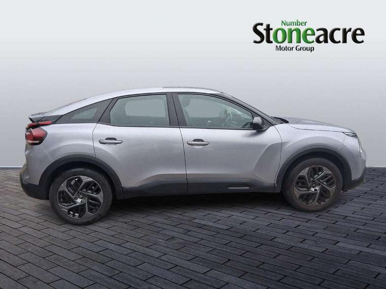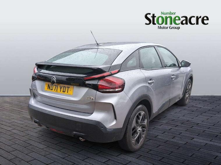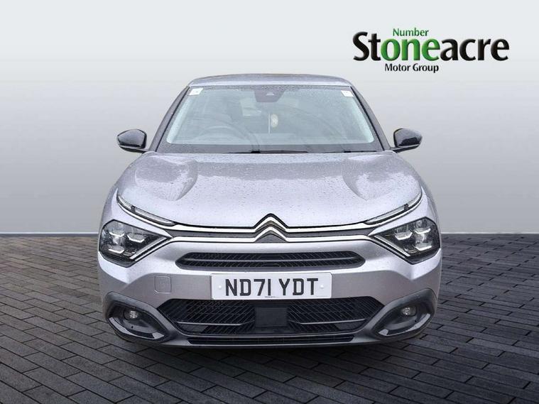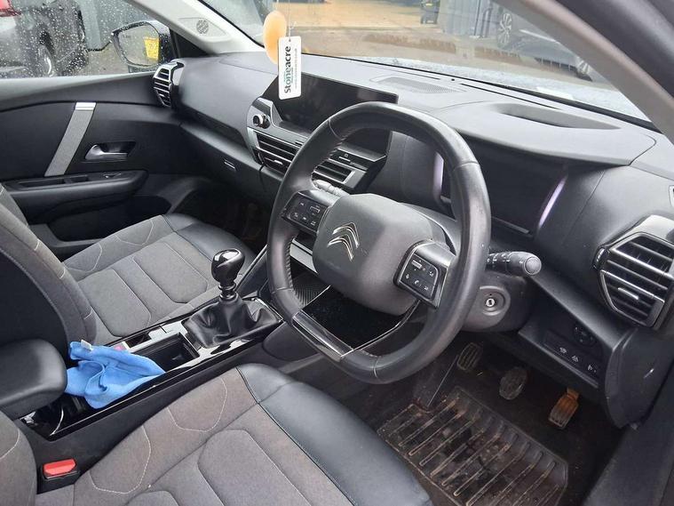 10" high resolution touchscreen user interface, controlling media, connectivity and vehicle settings, 5.5 inch backlit full TFT driver's instrument cluster with LED ambient lighting, Apple car play and Android auto, Citroen connect box emergency and assistance system, Citroen connect nav with speed cam and danger zones alert, Cruise control + speed limiter, Driver's head-up display, Electronic Power Steering (EPS), In-crash braking, Rear parking sensors, Top rear vision reversing camera, Voice commands, Suspension with progressive hydraulic cushions - double hydraulic stops on front suspension and single on rear suspension, 6 speakers, Auxiliary input socket, Bluetooth telephone and audio streaming, DAB Digital radio, Automatic headlights, Body colour bumpers, Body colour door handles, Body colour painted external rear view mirrors, Electrically heated, folding and adjustable external rear view mirrors with courtesy lighting, Front and rear electric windows, Gloss black rear skirt, LED daytime running lights in V signature, LED front fog lamps with static cornering function, LED front headlamps, Rain sensing automatic front windscreen wipers, Standard interior rear-view mirror with manual day-night switching, Welcome and goodbye lighting, 12V power outlet, 1x USB Type-C socket charging & data connection and 1x USB Type-A socket in 1st row and 1x USB Type-A socket charging in 2nd row, 3 rear headrests, Boot light, Chevrons cloth and leather effect textile seat upholstery, Dashboard tray in front cabin, Driver and passenger sunvisors with illuminated vanity mirrors, Dual zone automatic air conditioning, Front and rear LED interior lighting, Front head restraints, Grained leather steering wheel with two command blocks, Height adjustable driver's seat with adjustable lumbar support, Height adjustable front passenger seat, Height and reach adjustable steering wheel, Map pockets in rear of front seats, Raised centre console with armrest and two cup holders, Split folding rear seats, Two position boot floor, High level acoustic insulation pack - C4/C4 X/e-C4 X, 3x3 point rear seatbelts, ABS, Driver and front passenger airbags, Electric parking brake, ESP, Front seatbelt pretensioners, Hill start assist, Manual child lock in second row, Manual deactivation of front passenger airbag, Post collision safety brake, Row 1 and 2 curtain airbags, Row 1 side thorax airbags, Seatbelt unfastened on the move warning, Tyre underinflation detection, Anti-theft alarm (volumetric protection), Immobiliser, Remote locking with deadlocks, Two remote keys, 18" Bi-tone painted aeroblade alloy wheels with anti-theft locking wheel nuts, Puncture repair kit with compressor,