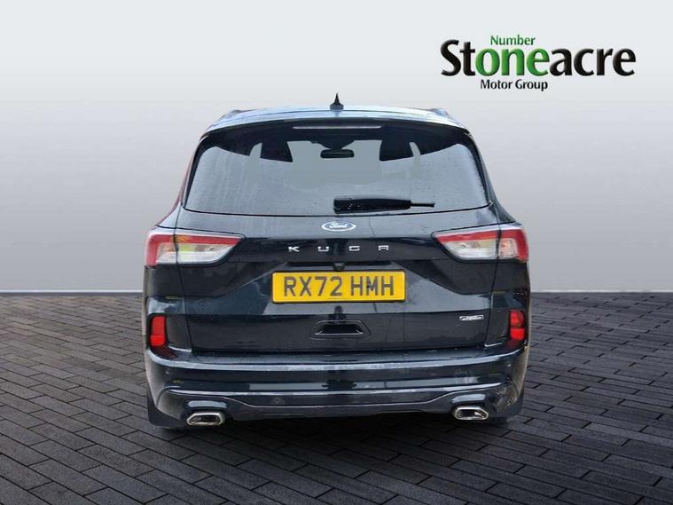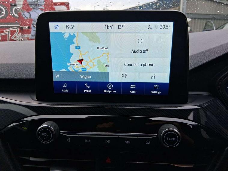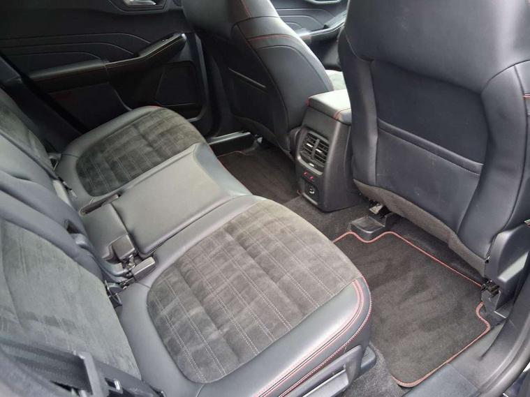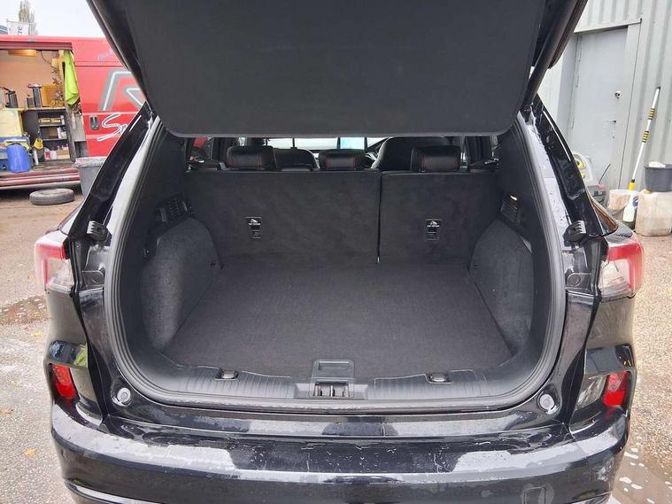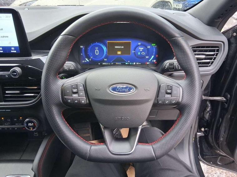Driver impairment monitor, Ford easy fuel, Ford SYNC 3 with 8" colour touchscreen, App Link, andriod auto/apple carPlay and navigation with Ford pass connect, Front and rear parking sensors, Hands free power tailgate, Intelligent speed assist, Lane keeping aid with lane departure warning, Mobile phone wireless charging pad, Power assist steering, Selectable drive modes, 3-Pin Home charge cable (230V/16A Domestic socket), Sports suspension, Ford DAB audio system with 6 speakers, Auto dimming rear view mirror, Auto headlamps with high and low beam, Auto wipers, Black roof rails, Front LED fog lights with cornering function, Full LED headlamps, Large rear spoiler, LED daytime running lights, LED rear lights, Power folding heated door mirrors with puddle lights, Power front/rear windows with global close, Power opening panoramic roof, Privacy glass, Quickclear heated windscreen, ST Line body styling kit with unique front and rear fascia and bumper, rear painted diffuser, front painted skid plates, dark mesh upper grille, ST Line front scuff plates, Twin exhausts, 10 way power adjustable drivers seat, 2nd row sliding seats, 8 way manual passenger seat including lumbar support and height adjust, Alloy pedals, Ambient lighting, Centre console with electronic parking brake, Dark headlining and pillars, Dual electronic automatic temperature control, Flat bottomed leather steering wheel in sensico with red stitching, Front and rear head restraints, Heated passenger and driver seats, Rear charging point, Sensico partial premium leather upholstery, Sports seats, ST Line front and rear floor mats, B&O with large instrument cluster pack - Kuga, 3x3 point rear seatbelts, Airbags - front driver/passenger, front and rear curtain, Drivers knee airbag, Electronic stability control (ESC) and ABS, Ford MyKey Gen 2 safety system, Post collision braking, Powered child proof rear door locks, Pre collision assist with autonomous emergency braking, Red brake calipers, Tyre pressure monitoring system, Engine immobiliser, Keyless entry, Keyless start with 'Ford Power' starter button, Locking wheel nuts, Remote powered central double locking doors, Thatcham category 1 alarm,