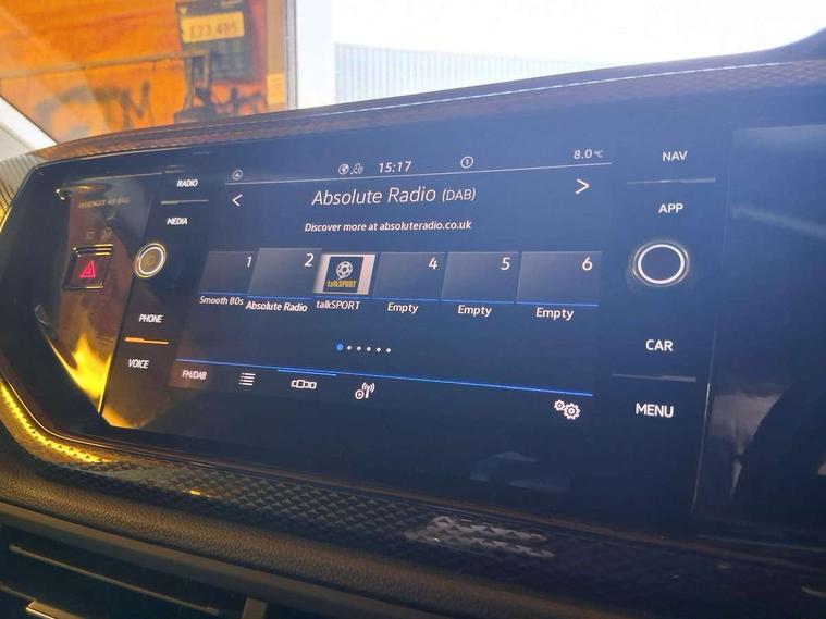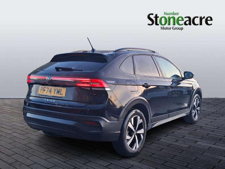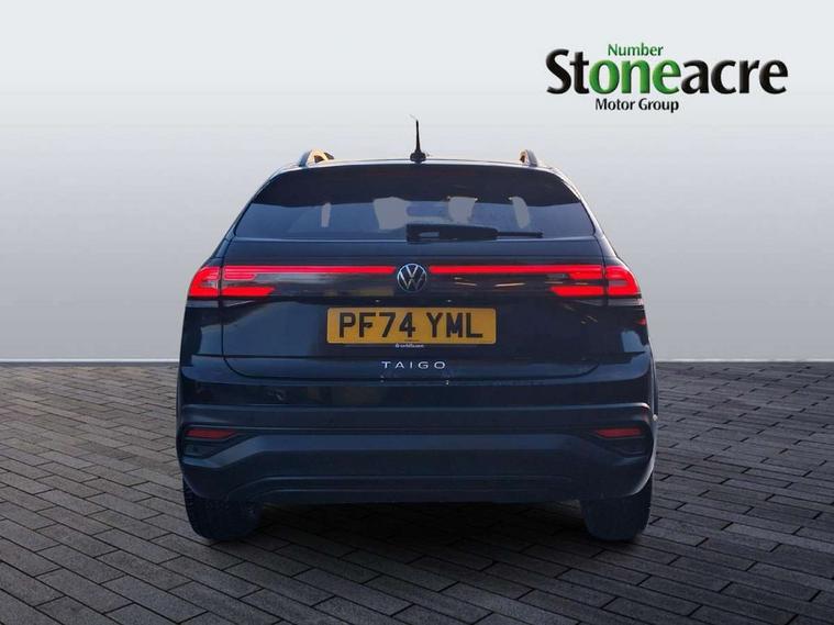 Adaptive cruise control, Advanced driver attention and drowsiness monitor, Dynamic road sign display, e-Call (emergency call), Power Steering, Rear view camera, Travel assist including emergency assist, Washer fluid level indicator, Wireless Charging including Bluetooth, Start-stop system with battery regeneration (recuperation - energy recovery during braking), WeConnect plus, Ambient lighting with logo projection, Aspherical driver's exterior mirror, Body coloured bumpers, Body coloured exterior mirror housings and door handles, Electric windows, External USB type C socket and charging sockets, Heat insulating glass windscreen, LED rear combination lamp, LED third brake light, Left convex exterior mirror, Power folding adjustable/heated exterior mirrors and front passenger exterior mirror lowering function, Rear fog light on one side, reversing light on both sides, Rear side wing doors, Rear wash/wipe with intermittent wipe setting, Side windows in heat-insulating glass, from B-pillar and rear window dark tinted, 'Slash/ Austin' Cloth upholstery, 12V socket in centre console, 2 front reading lights, 3 rear head restraints, 3 seat bench in 2nd row, Black carpets, Ceramique headliner, Child seat anchor for child seat system i-Size, 2x top tether and child seat anchor in front on front passenger side, Door and side trim panels in titan black, Driver and front passenger seat height adjustment, Front centre armrest, Handbrake lever handle in leather, Height and reach adjustable steering wheel, Leather trimmed gear knob, Leather wrapped multifunction steering wheel with paddle shift, Luggage compartment floor, Luggage compartment light, Lumbar support for driver's and front passengers seat, Seat covers in titanium black, Single front passenger seat, Split folding backrest with centre armrest and unsplit rear seat bench, Storage compartment under front seats, Sun visors with illuminated vanity mirrors, Titanium black instrument panel, Chrome Package - Taigo, Drivers assistance package - Taigo, Light and sight pack - Taigo, 2 x 3-point seatbelts/outer rear seats with ECE label, 3-point seat belts in front with pretensioner and height adjustment, 3-point seatbelt for centre rear seat, Driver and front passenger airbag with front passenger airbag deactivation, Driver and front passenger safety-optimised head restraints, Electronic stability control, Extended and predictive pedestrian/ cyclist protection, Front and rear disc brakes, Front curtain and side airbags with center airbag, Hill start assist, Manual rear child locks, Single tone horn, Tyre pressure loss indicator, Anti-theft alarm system with interior monitoring, backup horn, and towing protection, Keyless locking and starting system keyless access with safelock, Black (slush) Dashboard, Lava stone black gloss/matt decorative inserts in dash and front door panels, Low rolling resistance tyres,