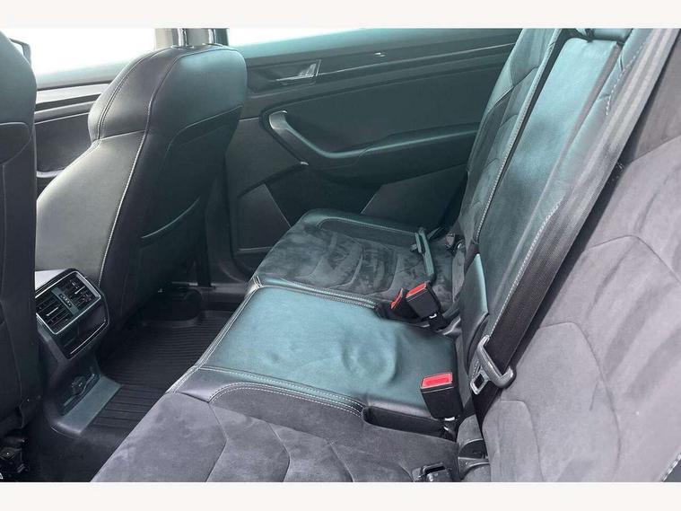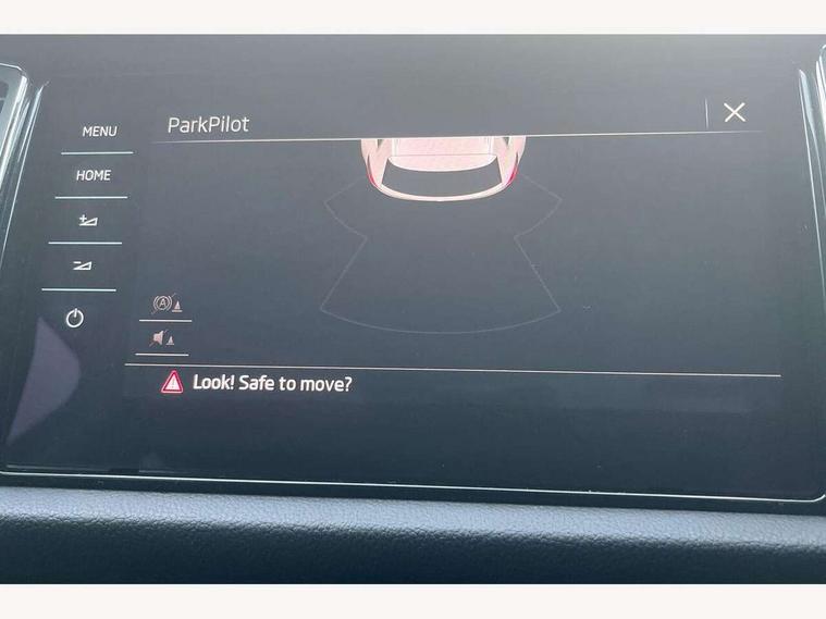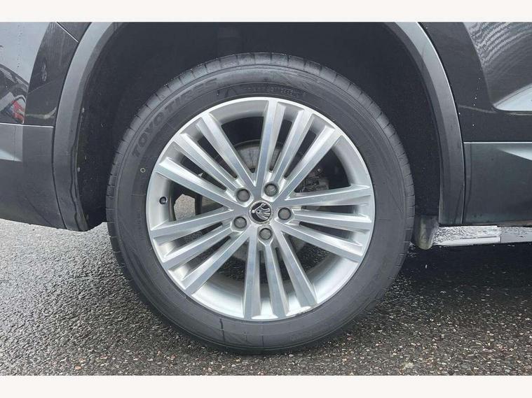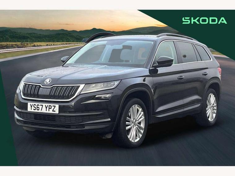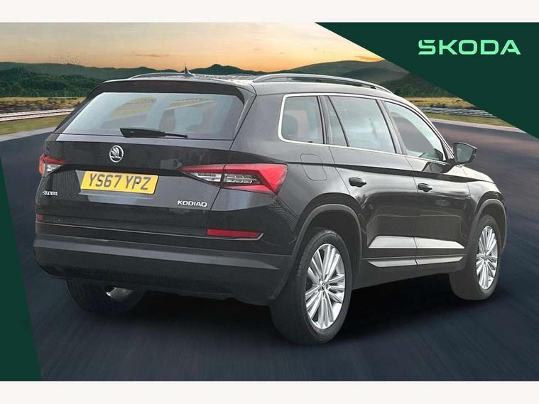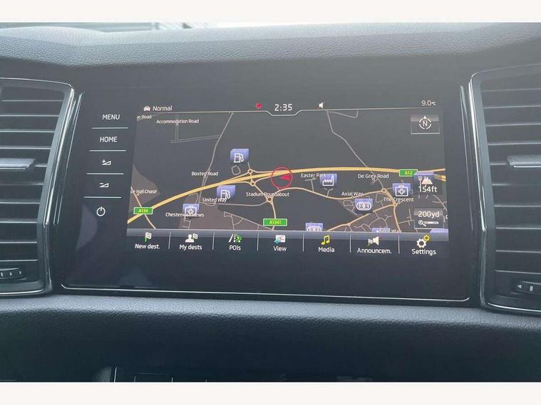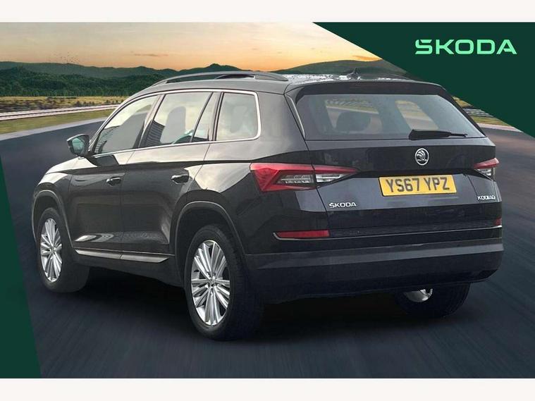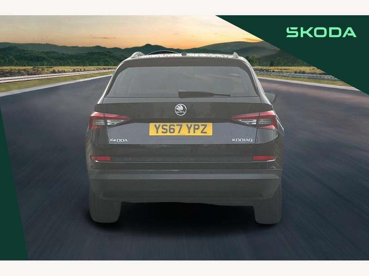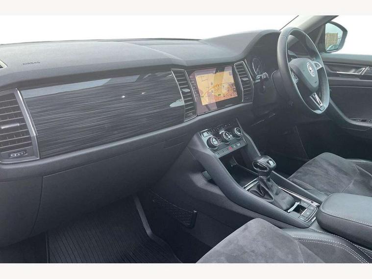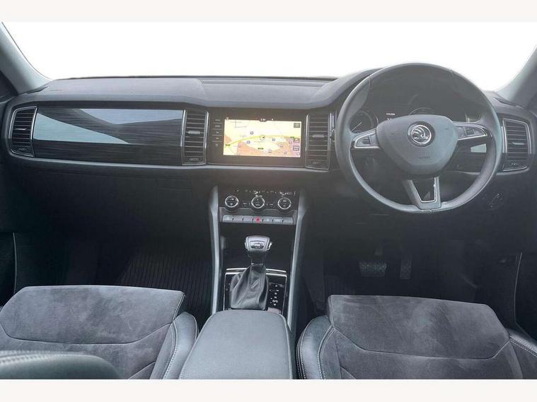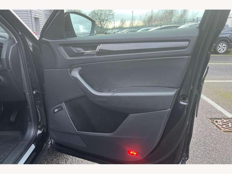 Bluetooth system, Columbus satellite navigation with 9.2" touch screen and integrated Wi-Fi, Drive mode selector, Exterior temperature gauge, Power tailgate, SmartLink, Speed limiter, Bolero Radio, DAB Digital radio, DVD System, SD card slot, USB connection, Adaptive front lighting system, Aero wiper + intermittent function, Auto dimming door mirrors, Auto dimming rear view mirror, Automatic activation of hazard warning lights, Body colour bumpers, Body colour door mirrors and handles, Electric adjustable/heated/folding door mirrors, Electric front windows, Electric rear windows, Front and Rear door steps, Headlight washers, Heated rear window, High gloss black grille with chrome inserts, LED daytime running lights, LED front fog lights with static cornering light function, LED Headlights, Light assistant (coming home/tunnel light), Rain and light sensors, Rear spoiler, Rear wiper, Sunset privacy glass, Tinted windows, 12V Accessory socket in centre console, 12V power point in luggage area, 3 rear height adjustable headrests, 4 lashing points on luggage floor, 60/40 split fold rear seat back, Boot storage compartments, Centre console with storage/cupholders, Chrome gear shift lever, Chrome inner door handles, Driver + front passenger lumbar support, Driver's glovebox with lid, Driver's storage box, Folding grab handles with rear coat hooks, Front and rear bottle holders, Front centre armrest with storage compartment, Front/rear courtesy lights, Height adjustable front seats, Height/tilt adjustable front headrests, Illuminated air conditioned glovebox, Illuminated luggage compartment, Isofix system on outer rear seats, Luggage compartment cover, Luggage nets in boot, Manually adjustable steering column, Passenger side net compartment on centre console, Pollen filter, Rear centre armrest with cupholders, Removable LED light in boot, Storage compartment under front seats, Sunglasses storage, Sunvisors with illuminated vanity mirrors, Ticket holder, Chrome pack - Kodiaq, 3 point front/outer rear seatbelts+pre-tensioners, ABS + EDL + ASR + MSR + ESC, Automatic unlocking of doors in case of impact, Driver and passenger airbags, Drivers knee airbag, Electromechanical parking brake, Front assist including city emergency braking, Front side airbags, Fuel cut off safety device, Head airbags, Hill hold control, Hydraulic Brake Assist (HBA), Passenger airbag deactivate switch, Seatbelt warning, Two tone horn, Tyre pressure monitor, Alarm with interior monitoring and tilt sensor, Anti-theft wheel bolts, Immobiliser, Keyless entry and keyless start, Remote central locking,
