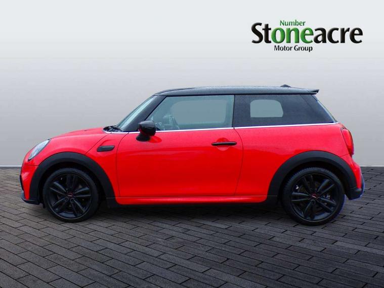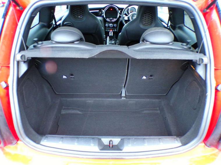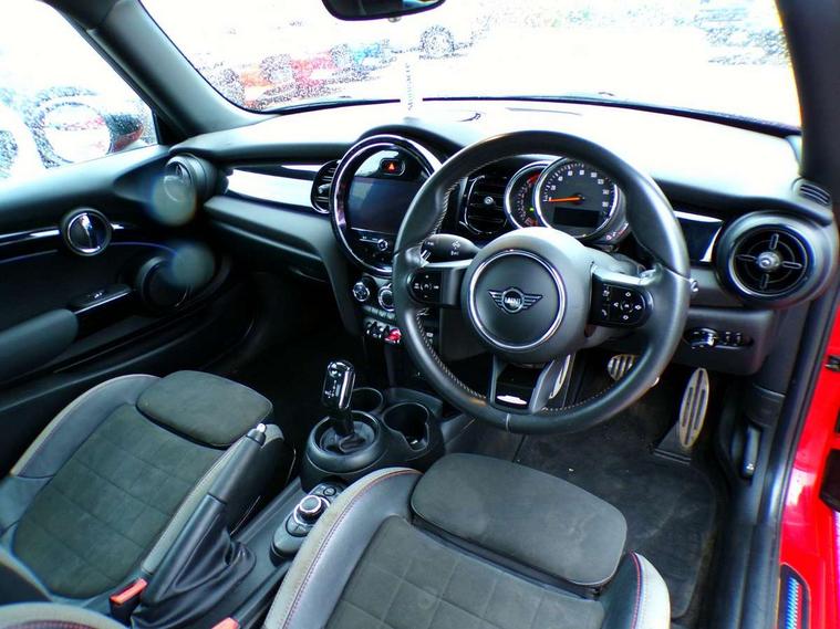 Apple CarPlay, Automatic start/stop function with brake energy recuperation, Compatible mobile phone bluetooth with audio streaming, Cruise control with brake assist, Electro-mechanical speed dependant steering assistance, Flexible car sharing preparation, Instrument cluster, MINI Driving Modes - centre toggle switch to control driving setting (sport, mid and green), Mini E-call, MINI TeleServices, On board computer, Rear park distance control, Service interval indicator, Double Vanos system, Fully variable valve control, High precision injection, Intelligent adaptive suspension, Performance Control, Steptronic transmission with double clutch, 8.8" touchscreen with LED ring, FM tuner and DAB digital radio, 3rd brake light, Automatic headlight activation switch, Body colour fuel filler cap, Chrome border high gloss black slats radiator grille, Dynamic brake lights, Electric front windows, Exhaust tailpipe on left with chrome finisher, Heated rear window, Heated windscreen washer jets, JCW Aerodynamic kit - Front and rear bumpers with sporty JCW styling and part-painted side sills with MINI John Cooper Works door sill finishers, John Cooper Works rear spoiler, LED headlight with closed ring and daytime driving lights, Metal door sill strips with MINI imprint, Model logo Cooper on right of tailgate, Rain sensor window wipers, Rear fog lights, Rear LED lights with union jack design, Rear window wiper, Side scuttle panel with integrated indicator, Sun/heat protection glass, White indicator lenses, 12V Accessory socket in centre console, 2 seat bench in 2nd row, 4 lashing eyes in luggage compartment, 60/40 split folding rear seat, Anthracite headliner including grab handles and clothes hooks, Carbon black colour line - Knee roll and door armrest, Chrome interior highlights, Cupholders, Front and rear isofix with front passenger airbag deactivation, Front floor mats in velour, Glove compartment, Height and length steering column adjustment, Interior lighting with 12 different colours across the dashboard, underneath door bezel with illuminated laser-engraved design on central display, JCW Sport seats with integrated headrests, adjustable thigh support and John Cooper Works logo, Leatherette gearshift lever and handbrake gaiters, LED reading lights, vanity mirror lights, front foot well light and spotlight on front seats, Manual air conditioning, Mechanical seat adjustment - forward/back & backrest for front seats and driver seat height adjust, Multifunction steering wheel, Passenger seat height adjuster, Single front passenger seat, Storage compartments in doors, Sunvisors with vanity mirrors, Tool kit, Walknappa leather steering wheel with grey seam and John Cooper Works badge on Piano Black lower steering wheel spoke, Piano black exterior pack - Mini Hatchback Cooper, 3 point seatbelts on all four seats, 6 Airbags - front, side, head and seat belt tensioners, Anti-lock braking system (ABS), DSC - Dynamic Stability Control, Front and rear disc brakes, Single tone fanfare horn, Tyre pressure monitoring system, Alarm system with tilt sensor, monitoring doors, bonnet interior and tailgate, Electronic vehicle immobiliser, Start/stop toggle with keyless go, Piano black interior trim,