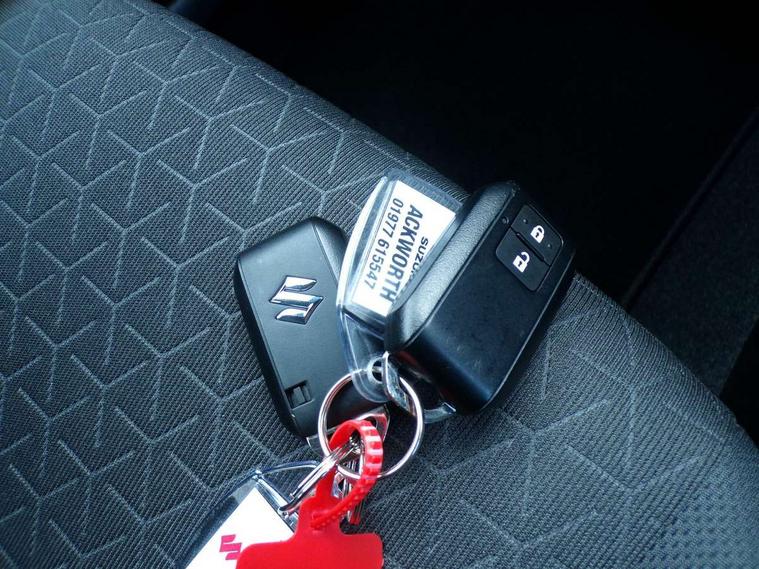 Adaptive cruise control with Stop and Go, Automatic start/stop system, Blind spot monitoring, Colour LCD information display, Digital clock, Driver monitoring system, eCall, Fuel consumption display (average/instantaneous) and range display, Intelligent speed control support, Lane departure prevention, Lane departure warning system, Lane keeping assist (LKA), Low fuel level warning light, Navigation system, Outside temperature display, PAS, Rear cross traffic alert, Rear parking camera, Rear parking sensors, Remote fuel cap release, Smartphone integration with Apple CarPlay and Android auto, Suzuki connect, Tailgate, Traffic sign recognition, Weaving alert, 4 speakers + 2 tweeters, 9-inch infotainment display, Auxiliary input socket, Bluetooth audio streaming, DAB Digital radio, Steering wheel audio controls, USB Type A and C, 'Guide me home' headlamps, 1 speed with intermittent rear wiper + washer, 2 speeds front wiper with intermittent + washer, Automatic headlights, Black coloured A & B pillars, Black Upper and lower front grille, Body colour door mirrors and handles, C pillar trim moulding, Door mirrors with built-in turn signal lamp, Electric door mirrors, Electric folding door mirrors, Electric front windows, Electric rear windows, Green tinted glass, Heated door mirrors, High beam assist, LED daytime running lights, LED High mounted stop light, LED number plate light, LED position lamps, LED projector headlamps, LED rear combination lamp, Manual headlamp level control, Rain sensor, Rear fog lights, Rear privacy glass, Rear side wing doors, Rear spoiler, Side spoiler, 1 cup holder in rear, 12V Accessory socket in front console, 2 cup holders in front, 2 Isofix seat anchors, 3 bench rear seats in 2nd row, 3 rear head restraints, 3 spoke leather covered steering wheel, 60/40 split rear seats, Accessory socket, Automatic air conditioning, Centre console storage, Centre lower box, Child seat tether anchorages x 2, Chrome handbrake release button, Chrome interior door handles, Cloth upholstery, Door pockets with bottle holder, Driver/passenger sunvisors with ticket holders + vanity mirrors, Front cabin lights, Front headrests, Front map light, Front passenger side assist grip, Gearshift paddles, Glovebox, Heated front seats, Heater, Height adjustable driver's seat, Luggage area lamp, Painted interior door trim ornament, Parcel shelf, Passenger seat back pocket, Pollen filter, Rear assist grips x2, Rear heater duct, Single front passenger seat, Tilt adjustable steering wheel, Tilt/telescopic adjustable steering wheel, 3 point ELR seatbelts for centre seat, 3 point ELR seatbelts front and rear, ABS+EBD+Brake assist, Curtain airbags, Driver airbag, Dual sensor brake support, ESP + traction control, Front and rear seatbelt reminder, Front passenger airbag, Front passenger airbag deactivation, Front seat seatbelts shoulder height adjuster, Front seatbelt pretensioners with force limiters, Hill hold control, Rear child proof door locks, Rear seatbelts with pre-tensioners and load limiters, Side airbags with incorporated into front seats, Tyre pressure indicator, Deadlocks, Freewheeling key cylinders, Immobiliser, Keyless entry and start, Light - on and Key in reminder, Locking wheel nuts, Remote central locking, Painted instrument panel ornament, 16" Polished alloy wheels, Emergency flat tyre repair kit,