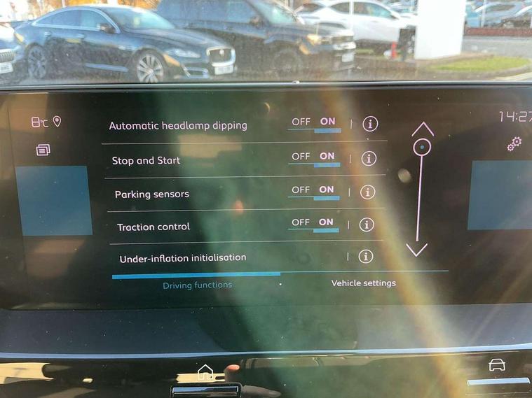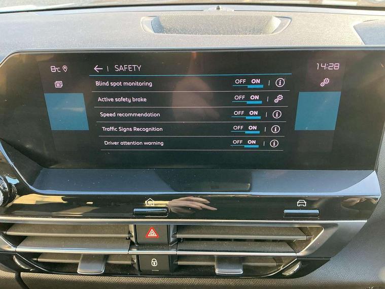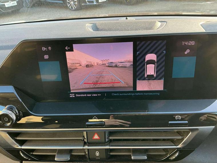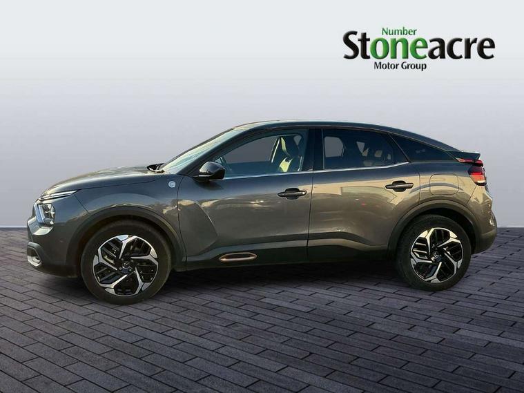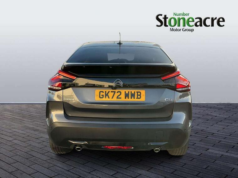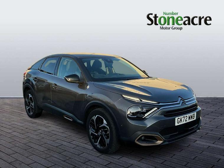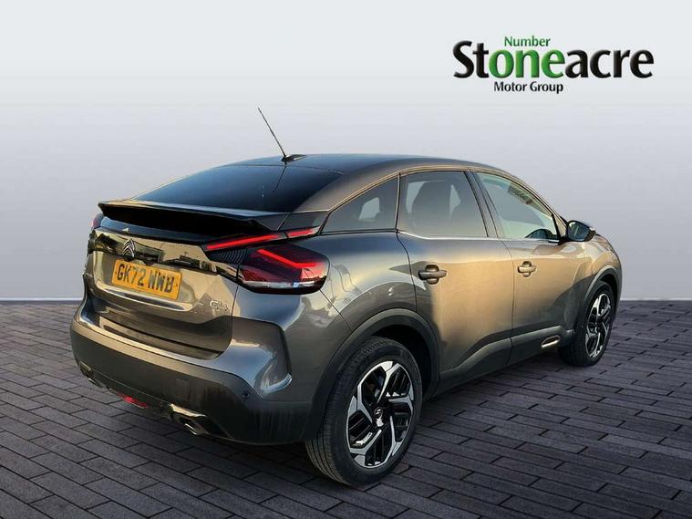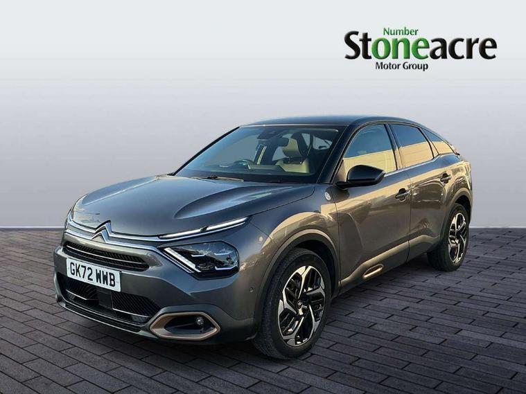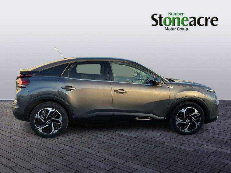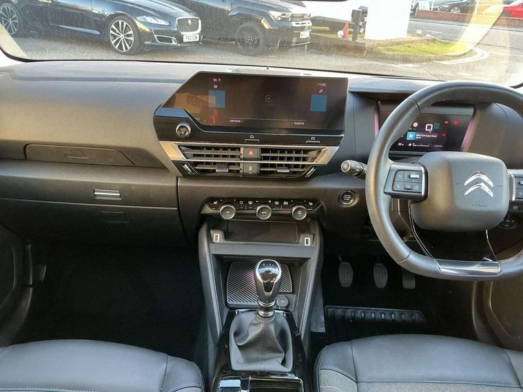 10" high resolution touchscreen user interface, controlling media, connectivity and vehicle settings, 5.5 inch backlit full TFT driver's instrument cluster with LED ambient lighting, Active blind spot detection, Apple car play and Android auto, Citroen connect box emergency and assistance system, Citroen connect nav with real time traffic and speedcam, Cruise control + speed limiter, Driver's head-up display, Electronic Power Steering (EPS), In-crash braking, Tailgate, Voice commands, Advanced comfort suspension - double hydraulic stops on front suspension and single on rear suspension, Auxiliary input socket, Bluetooth telephone and audio streaming, Citroen Hifi system with 1 speaker in dashboard centre, 4 woofers in doors, 2 tweeters in pillars and 1 subwoofer, DAB Digital radio, 3rd brake light, Body colour bumpers, Body colour door handles, Body colour painted external rear view mirrors, Body coloured door mirrors, Boot spoiler, C-Series badging on front wing, Dark tinted rear windows and side windows with chrome detail, Electrically heated, folding and adjustable external rear view mirrors with courtesy lighting, Electrochrome interior rear-view mirror with automatic day-night switching, Front and rear electric windows, Gloss black rear skirt, Intelligent beam headlights, LED daytime running lights in V signature, LED front fog lamps with static cornering function, LED front headlamps, Rain sensing automatic front windscreen wipers, Rear side wing doors, Rear wiper, Roof aerial, Welcome and goodbye lighting, 12V power outlet, 1x USB Type-C socket charging & data connection and 1x USB Type-A socket in 1st row and 1x USB Type-A socket charging in 2nd row, 3 rear headrests, 3 seat bench in 2nd row, Boot light, Chevrons cloth and leather effect textile seat upholstery, Dashboard tray in front cabin, Deluxe leather steering wheel with two command blocks, Driver and passenger sunvisors with illuminated vanity mirrors, Dual zone automatic air conditioning, Electrically heated front seats, Front and rear LED interior lighting, Front head restraints, Heated steering wheel, Height adjustable driver's seat with adjustable lumbar support, Height adjustable front passenger seat, Height and reach adjustable steering wheel, Map pockets in rear of front seats, Raised centre console with armrest and two cup holders, Single front passenger seat, Split folding rear seats, Two position boot floor, High level acoustic insulation pack - C4/C4 X/e-C4 X, Safety pack plus - C4/C-Series Edition/Max, 3x3 point rear seatbelts, ABS, Driver and front passenger airbags, Electric parking brake, ESP, Front seatbelt pretensioners, Hill start assist, Manual child lock in second row, Manual deactivation of front passenger airbag, Post collision safety brake, Row 1 and 2 curtain airbags, Row 1 side thorax airbags, Seatbelt unfastened on the move warning, Tyre underinflation detection, Anti-theft alarm (volumetric protection), Immobiliser, Keyless entry and start, Remote locking with deadlocks, 18" Bi-tone diamond-cut aeroblade alloy wheels with anti-theft locking wheel nuts, Puncture repair kit with compressor,