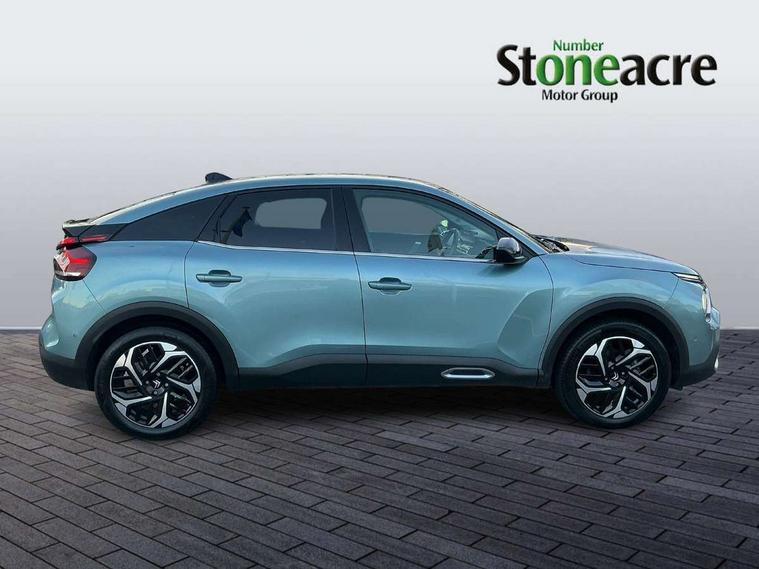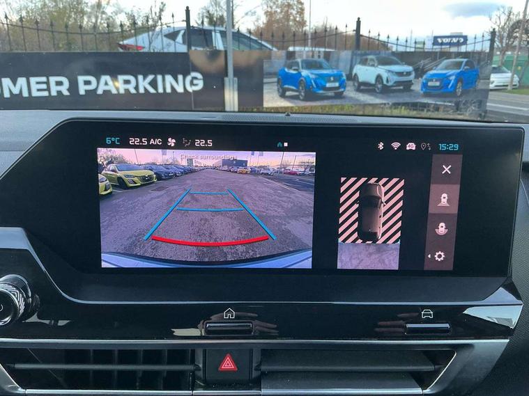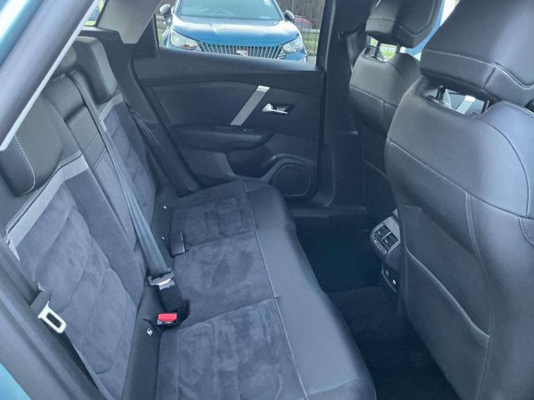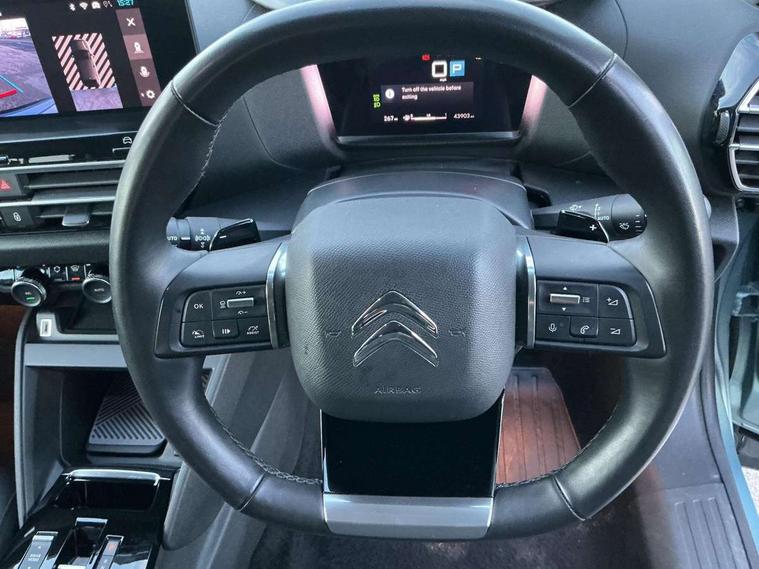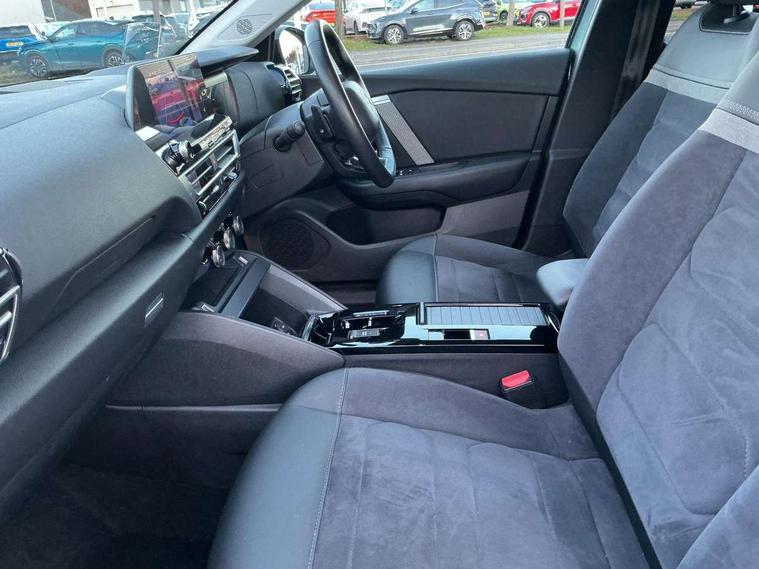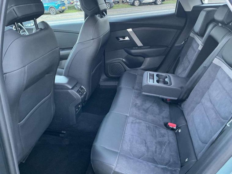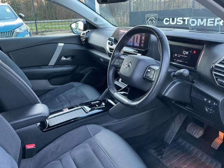 5.5 inch backlit full TFT driver's instrument cluster with LED ambient lighting, Active blind spot detection, Apple car play and Android auto, Citroen connect box emergency and assistance system, Citroen Smart Pad Support - integrated support for attaching a tablet computer for front passenger, Driver's head-up display, Electronic Power Steering (EPS), Front, rear and lateral parking sensors, In-crash braking, My Citroen Drive Plus: 10" high-resolution touchscreen user interface, controlling media, connectivity, vehicle settings + connected nav, Speed limiter, Tailgate, Voice commands, Advanced comfort suspension - double hydraulic stops on front and rear suspension, 6 speakers, Bluetooth telephone and audio streaming, DAB Digital radio, 3rd brake light, Automatic headlights, Body colour bumpers, Body colour door handles, Boot spoiler, C-Series badging on front wing, Dark tinted rear windows and side windows with chrome detail, Electrically heated, folding and adjustable external rear view mirrors with courtesy lighting, Electrochrome interior rear-view mirror with automatic day-night switching, Front and rear electric windows, Gloss black rear skirt, Intelligent beam headlights, LED daytime running lights in V signature, LED front fog lamps with static cornering function, LED front headlamps, Perla Nera black painted external rear view mirrors, Rain sensing automatic front windscreen wipers, Rear side wing doors, Rear wiper, Shark fin roof aerial, Welcome and goodbye lighting, 12V power outlet, 1x USB Type-C socket & data connection, 1x USB Type-A socket at 1st row + 1x USB Type-A socket , 1x USB Type-C socket in 2nd row, 3 rear headrests, 3 seat bench in 2nd row, Alcantara and black leather effect textile seats, Boot light, Dashboard tray in front cabin, Deluxe leather steering wheel with two command blocks, Driver and passenger sunvisors with illuminated vanity mirrors, Dual zone automatic air conditioning, Electrically heated front seats, Front and rear LED interior lighting, Front head restraints, Height adjustable driver's seat with adjustable lumbar support, Height adjustable front passenger seat, Height and reach adjustable steering wheel, Map pockets in rear of front seats, Raised centre console with armrest and two cup holders, Rear central folding armrest with cupholders and ski hatch, Single front passenger seat, Split folding rear seats, Two position boot floor, XXL storage in front cabin, High level acoustic insulation pack - C4/C4 X/e-C4 X, 3x3 point rear seatbelts, ABS, Driver and front passenger airbags, Electric parking brake, ESP, Front seatbelt pretensioners, Hill start assist, Manual child lock in second row, Manual deactivation of front passenger airbag, Row 1 and 2 curtain airbags, Row 1 side thorax airbags, Seatbelt unfastened on the move warning, Tyre underinflation detection, Anti-theft alarm (volumetric protection), Immobiliser, Keyless entry and start, Remote locking with deadlocks, 18" Bi-tone diamond-cut aeroblade alloy wheels with anti-theft locking wheel nuts, Puncture repair kit with compressor,