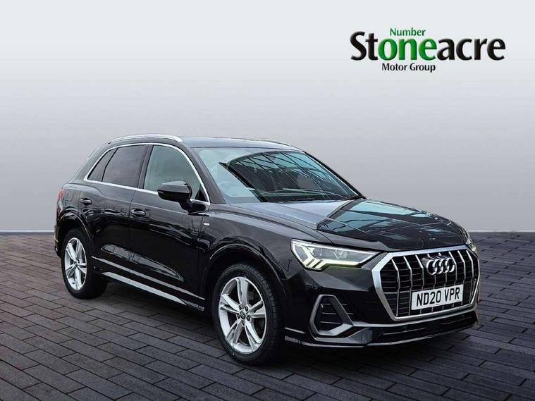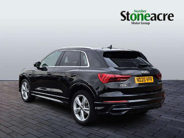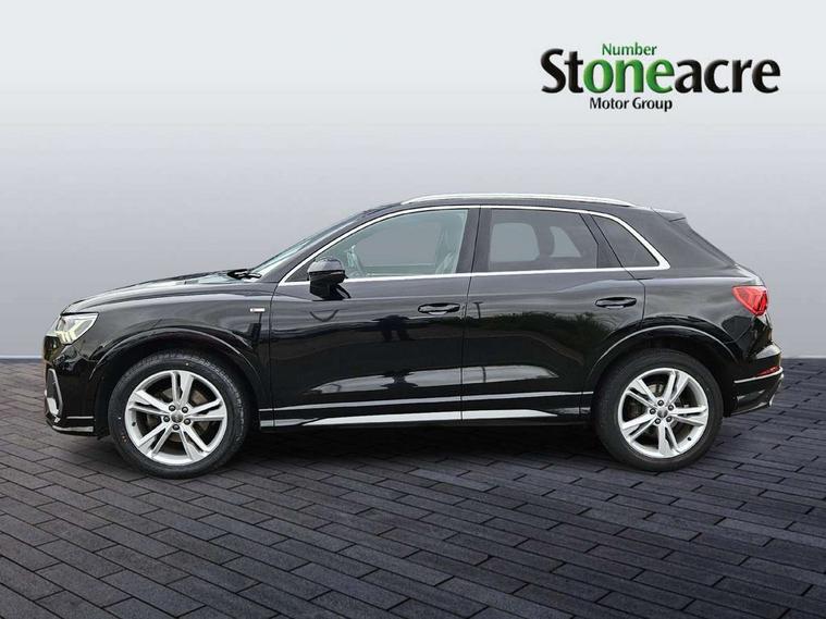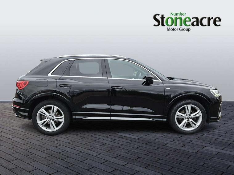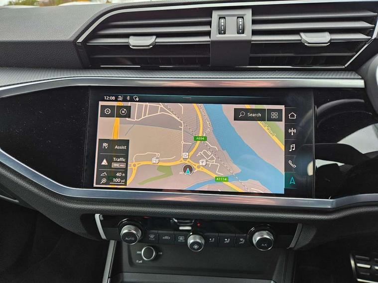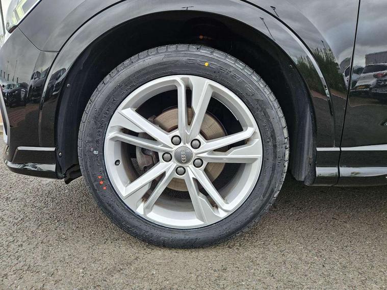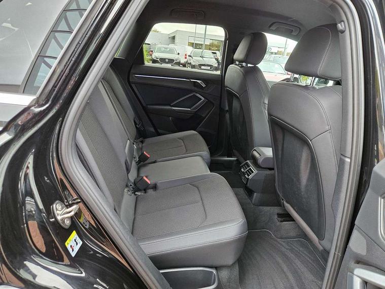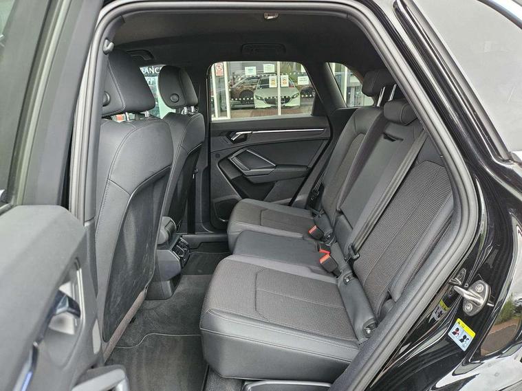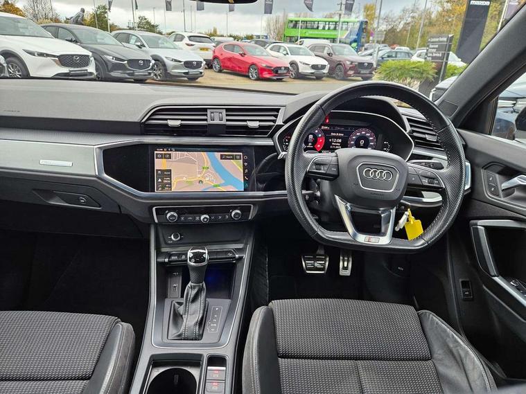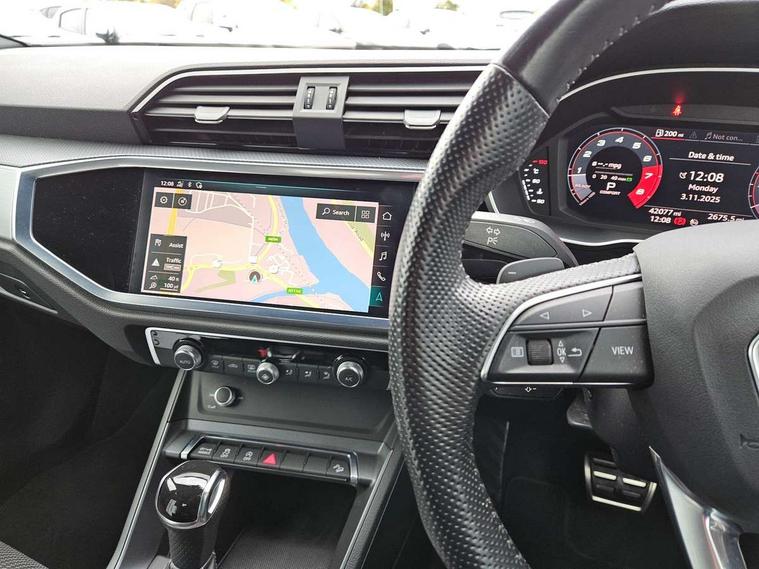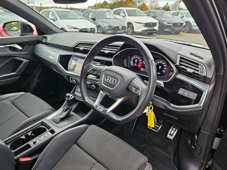 Audi connect safety and service (e-call), Audi drive select, Audi lane departure warning, Audi side assist, Audi Virtual Cockpit - 10.25" display, Bluetooth interface, Camera based traffic sign recognition, MMI Navigation Plus with high resolution 10.1 inch touchscreen colour display, Power operated tailgate, Progressive steering, Service interval indicator, Smartphone interface includes wireless Apple carplay/Android Auto, Start stop system with recuperation, Voice control system with natural language interaction, 48V Mild hybrid technology, Sports suspension, 1 x USB type C and 1 USB type A charging points, 6 passive loudspeakers, DAB digital radio module, Acoustic windscreen, Aluminium roof rails, Aluminium window trim, Auto dimming frameless rear view mirror, Body coloured bumpers, Electrically folding, adjustable and heated door mirrors with integrated LED side indicators and kerb view function for passenger side, Front and rear electric windows, Front fog lights, Front side air inlets in matt platinum grey, Front spoiler blade in matt platinum grey, Grille vertical bars in aluminium silver/Matt, High gloss black finish B and C pillars, LED headlights with LED daytime running lights and dynamic rear indicator, LED rear lights, Privacy glass dark tinted rear and rear-side windows (from B-pillar backwards), Rain and light sensors, Rear diffuser strip in matt titanium black, S line badges on front wings, S Line front and rear bumpers, Side skirt insert in matt Platinium grey, Silver chrome grille surround, Titanium black radiator grille, 12V socket in rear centre console, 40:20:40 folding with manual adjustment for 60:40 forwards/backwards position and backrest angle, Adjustable rear seat bench/backrest with centre armrest and cupholder, Black cloth headlining, Dual zone electronic climate control, Front and rear black floor mats with contrast stitching in rock grey, Front and rear headrests, Front and rear roof module including reading lights, Front centre armrest, Glove compartment lighting, Height and reach adjustable steering wheel, Illuminated door sill trims with S logo, ISOFIX child seat mounting for front passenger with airbag deactivation and outer rear seat including top tether attachment point for outer rear seats, Luggage compartment light, Manual front seats with height adjustment, Perforated leather gearknob, Stainless steel luggage compartment sill finisher, Stainless steel pedals, Non smoking pack - Q3, 3x3 point rear seatbelts, 6 airbags - Driver, front passenger, curtain and side windows, Audi pre-sense front with pedestrain and cyclist recognition, Electrically operated child locks on rear doors, Electromechanical parking brake, Electronic stabilisation control including ABS, ASR and EDL, Hill descent control, Hill hold assist, Pre sense basic, Seatbelt monitoring, Tyre pressure warning, Warning triangle and first aid kit, Anti theft alarm, Anti theft wheel bolts, Remote central locking, Dark matt brushed aluminium inlay, Detail dashboard around MMI touch colour display in glass look, black with surround in aluminium look, Leatherette door armrest, Tool kit, Tyre repair kit,