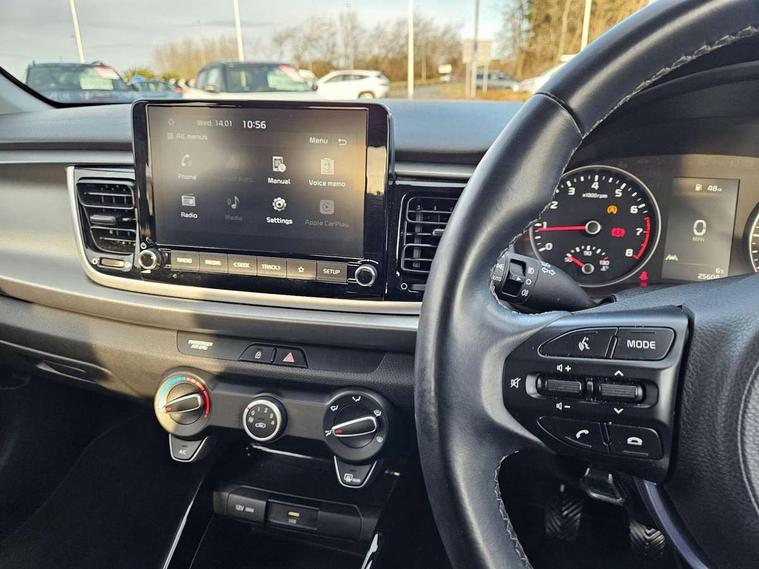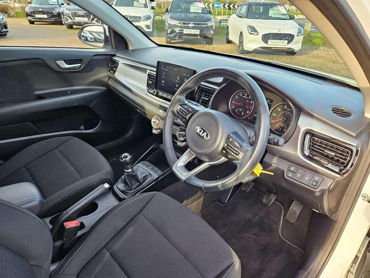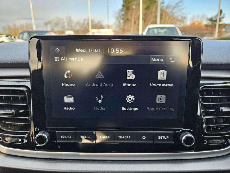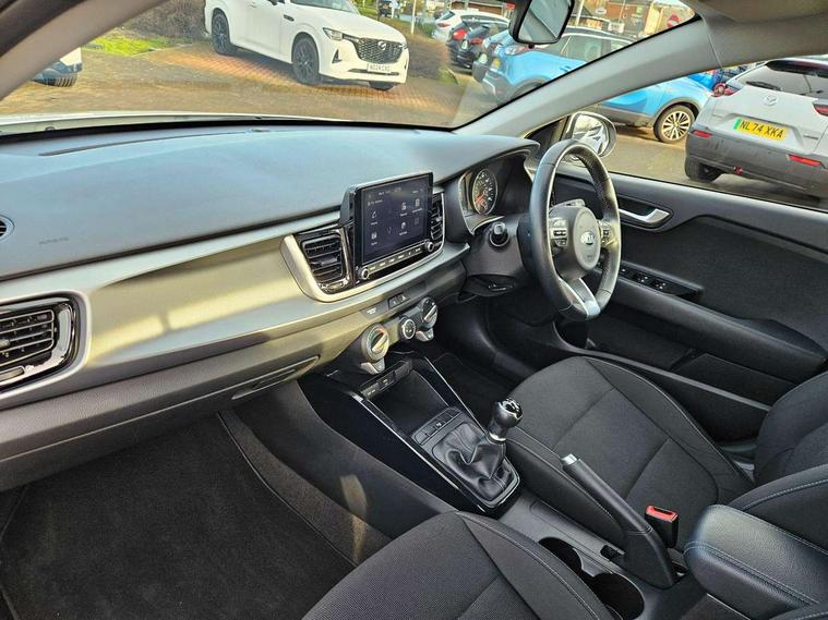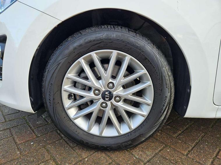 8" touch screen, Apple car play/Android Auto, Cruise control + speed limiter, Digital clock, Electric power steering, Emergency stop signalling system, Gear selection indicator, Manual speed limit assist (MLSA), Outside temperature display, Rear parking sensor, Reversing camera system with dynamic guidelines (Integrated into centre fascia screen), Tachometer, Trip computer, Voice control system, Windscreen washer level indicator, Intelligent Stop and Go, 6 speakers, Bluetooth connectivity including audio streaming, DAB Digital radio, Front USB port for media connection, Rear USB port, Steering wheel mounted audio controls, Aeroblade-type front wipers, Automatic lighting control, Bi-function projection headlights, Black grille with chrome surround, Body colour bumpers, Body colour door handles, Body coloured door mirrors, Cornering light, Electric adjustable/heated/folding door mirrors, Front electric windows with driver's auto up/down function, Headlamp levelling, Heated rear window, LED daytime running lights, LED indicators in door mirrors, Projection front fog lights, Projection headlights, Rear electric windows, Rear fog lamp, Rear wash/wipe, Speed variable front wipers, Tinted glass, Welcome home function, 3 passenger assist grips, 60/40 split/folding 2nd row of seats, Air conditioning, All round height adjustable headrests, Centre Console with Storage Box and Sliding Armrest, Dash illumination dimmer switch, Driver's seat height adjuster, Driver/passenger sunvisors and illuminated vanity mirrors, Front and rear door map pockets with bottle holder, Front passenger seatback pockets, Front USB charger port and 12V socket, ISOFIX top tethers and lower anchor points, Leather trimmed gearshift, Leather trimmed steering wheel, Load area light, Luggage area parcel shelf, Luggage hooks, Overhead console with sunglasses holder, Premium cloth upholstery, Silver interior door handles, Tilt/telescopic adjustable steering wheel, Advanced driving assistance pack - Rio, 3-point front seatbelts, 3x3 point rear seatbelts, ABS with Electronic Brakeforce Distribution (EBD) and Brake Assist System (BAS), Automatic unlocking of doors in case of impact, Cornering brake control (CBC) and Straight line stability (SLS), Electronic stability control (ESC) and vehicle stability management (VSM), Front seatbelt pretensioners + load limiters, Height adjustable front seatbelt anchors, Hill start assist control (HAC), Passenger airbag deactivate switch, Rear child proof door locks, Seatbelt warning, Traction control, Twin curtain airbags, Twin front airbags, Twin front side airbags, Tyre pressure monitoring system, Anti theft alarm, Deadlocking system, Engine immobiliser, Locking wheel nuts, Remote central door and tailgate locking with fold-away key, Speed sensitive auto door locking, Visible vehicle identification number, Silver fascia trim, 15" Alloy wheels, Tyre mobility system,