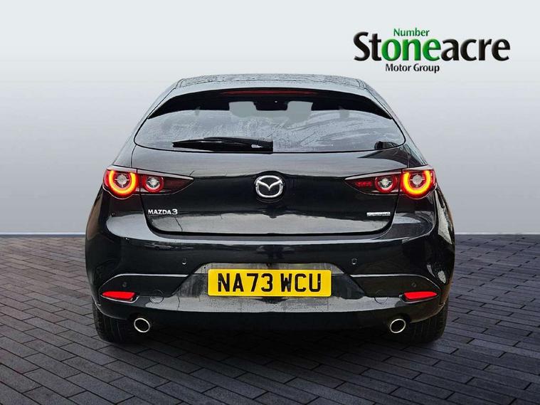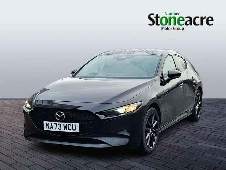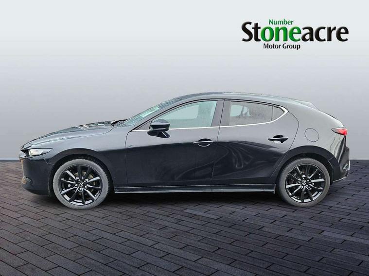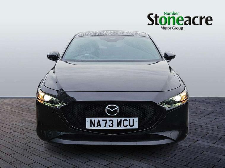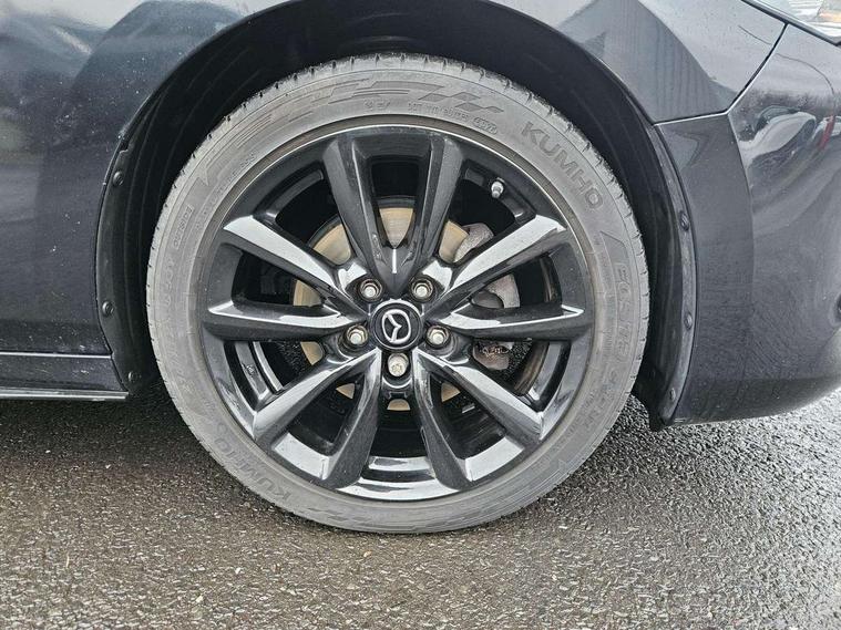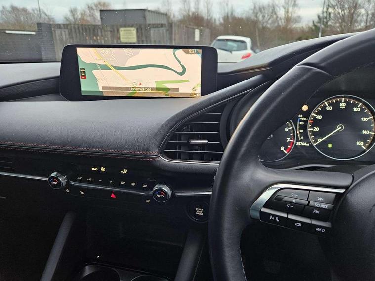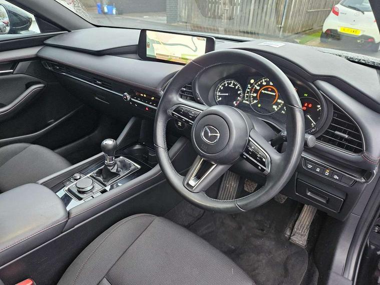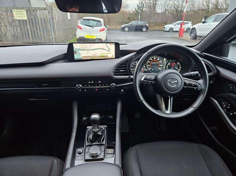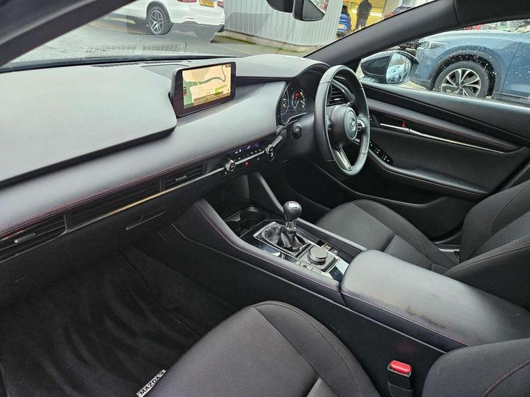 10.25" display with Mazda Connect infotainment, 7" colour TFT display, Audio transfer from bluetooth devices, Blind spot monitoring with rear cross traffic alert, Colour active driving display inc Windscreen projected, Traffic Sign Recognition, turn-by- turn navigation and Mazda Radar Cruise Control information, Digital instrument cluster, Driver attention alert system, E-call with GPS, Emergency stop signalling system, Engine start/stop button, Front and rear parking sensor with audible and visual warning, Head up Display, Integrated bluetooth with steering wheel mounted controls, Intelligent speed assist, Lane keep assist system (LAS) with Lane departure warning system (LDWS), Mazda connected services, Mazda Navigation System with european mapping, Mazda Radar Cruise Control, Mobile App interface, Multimedia Commander, PAS, Reversing camera, Service indicator, Tailgate, Traffic sign recognition (TSR), Trip computer, Wireless Apple CarPlay/Android Auto, Wireless charging, Cylinder Deactivation, i-stop, 2 USB-C ports in the front, Mazda Multimedia System with AM / FM / DAB radio with 8 speakers, Auto dimming rear view mirror, B-pillar garnish in piano black, Black door mirrors, Coming/leaving home lighting function, Dark metallic finish signature wing, Daytime running lights, Dual chrome tailpipes tip, Dusk sensing headlights, Electric front/rear windows with one touch/auto up/down, Electrically adjustable, heated auto power folding door mirrors, Front body coloured bumper with black lower bezel, Front kodo turn signal, Gloss black finish front grille, Gloss black rear roof spoiler, High beam control, LED front fog lights, LED headlamps with auto levelling, LED indicator lights, LED rear combination lights, LED third brake light, Privacy glass with dark tinting on rear side windows and rear window, Rain sensing front wipers with adjustable sensitivity and speed, Rear colour coded bumper with gloss black lower moulding, Rear fog lights, Rear side wing doors, Speed adjustable rear wash wiper with intermittent wipe, 12v electrical power outlet, 3 seat bench in 2nd row, 60/40 split fold down rear seats, Black with red stiching steering wheel, gearshift gaitor, dashboard panel, armrest, Cloth upholstery, Dark cloth door panel inserts, Dark roof headlining, ceiling and pillars, Driver seat manual slide, recline, height and seat tilt adjust, Driver, front passenger and two rear door pockets, Driver, Front passenger and two rear grab handles with coathooks, Driver/passenger sunvisors + vanity mirrors (drivers side with ticket holder), Dual zone climate control air conditioning, Folding rear centre armrest with two cup holders, Front and rear courtesy lamps, Front armrest, Front centre storage with two cupholders, Front head restraints, Front passenger seatback pocket, Front passengers seat manual slide, recline and height adjustment, Gear shift indicator, Heated front seats with 3 stage setting, Illuminated glovebox, Interior colouration dashboard and doorcards in black with dark stitching, ISOFIX child seat anchorage points attached on outer rear seats, Leather wrapped gear shift knob, Leather wrapped steering wheel, LED interior light, LED light in luggage compartment, Power outlet in luggage compartment, Roof mounted sunglasses holder, Single front passenger seat, Three height adjustable rear head restraints, Tilt/height adjustable steering wheel, 3 point ELR front seatbelts with pretensioners, 3 rear 3 point seatbelts with ELR, Anti-lock braking system (ABS), Drivers knee airbag, DSC - Dynamic Stability Control, Dual stage driver and single stage passenger airbags, EBD - Electronic brakeforce distribution, Electronic parking brake with auto disengage function and auto hold function, Front and rear curtain airbags, Front passenger airbag cut-off switch, Front side airbags, Front smart city brake support, G-Vectoring control plus, Hill launch assist, Intelligent Traction Control system, Manual child lock in rear doors, Mild Hybrid system with regenerative braking, Seatbelt reminder for driver/front passenger and rear seats, Tyre pressure monitoring system (TPMS), Auto door lock when driving, Remote central locking + deadlocks, Smart keyless entry, Thatcham accredited alarm and immobiliser, 18" Black alloy wheels, Emergency tyre repair kit,