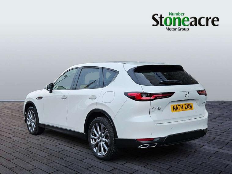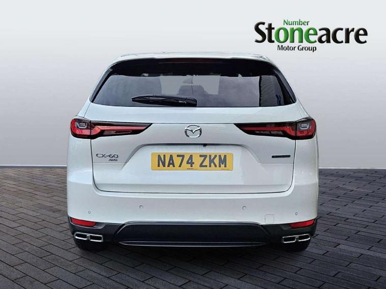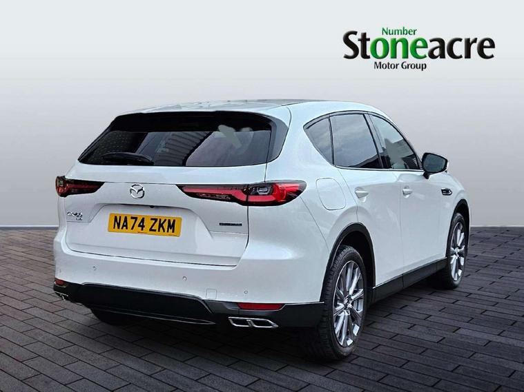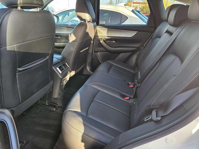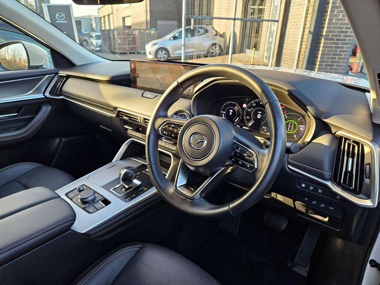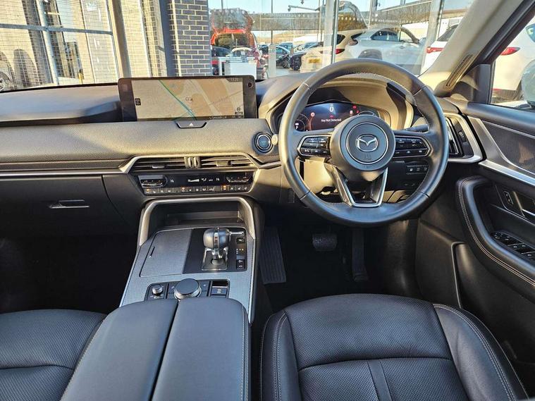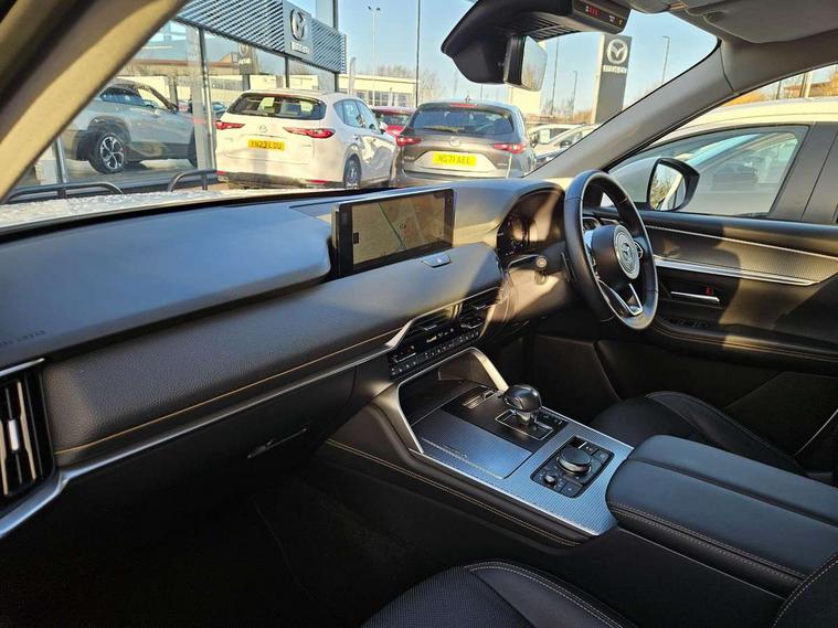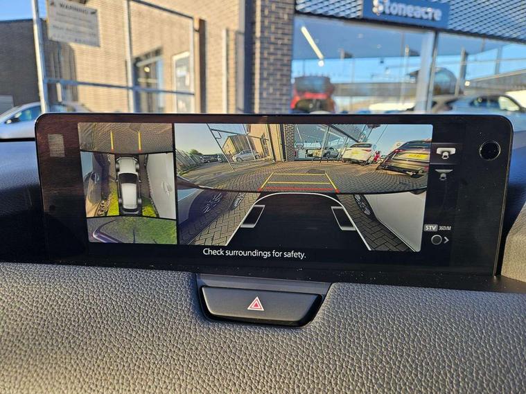 Emergency lane keeping with blind spot assist, Low washer fluid warning light, 12.3" Colour entertainment centre display with mazda connect infotainment, 12.3" TFT Colour display, Adjustable speed limiter, Blind spot assist, Blind spot monitoring with rear cross traffic alert, Cruise control, Distance alert system, Driver attention alert system, E-call with GPS, Emergency stop signalling system, Exit warning function, Front and rear parking sensors, Integrated bluetooth, Intelligent speed assist, Kinematic posture control, Lane keep assist system (LAS) with Lane departure warning system (LDWS), Mazda Navigation System with european mapping, Multimedia Commander, PAS, Power lift gate with handsfree function, Power liftgate, Power start/stop button, Reversing camera with static guide lines, Speed alert, Traffic sign recognition enhanced with mandated excessive speed warning, Trip computer, Windscreen projected colour active driving display, Wireless apple car play/android Auto, Type 2 Mode 2 cable for AC charging via UK 3-pin plug, 7.2 kw On board Charger, Mi-Drive (Normal, Sport, Off-road, Towing and EV mode), Paddle shift, Type 2 Mode 3 cable for AC charging via home or public charge points, AM / FM / DAB radio with 8 speakers, Steering wheel mounted audio/bluetooth controls, USB-C inputs (x2 front and x2 rear), Auto dimming driver's door mirror, Automatic headlight levelling, B-pillar and C-pillar garnishes in gloss black finish, Black wheel arch and side mouldings, Body colour roof spoiler, Body coloured bumpers, Body coloured door mirrors, Chrome finish signature wing in front grille, Chrome front side garish, Coming/leaving home lighting function, Dark plated headlight lense, Dusk sensing headlights, Electric front/rear windows with one touch auto up/down, Electrically adjustable, heated auto power folding door mirrors, Frameless auto dimming interior rear view mirror, Front kodo turn signal, Front wiper de-icer, Headlight washers, High beam control, LED 3rd brake light, LED headlamps, LED rear signature combination lamps, Piano black bar type front grille, Piano black window surrounds, Rain sensing front wipers with adjustable sensitivity and speed, Rear side wing doors, Rear wiper, Roof pillars and roof lining finished in lighter colour to soften the overall look, Signature LED daytime running lights, Silver decoration panel, 12v power outlet - front, 12V socket in boot, 3 height adjustable rear headrests, 3 seat bench in 2nd row, 40/20/40 split folding rear seats with quick levers in the boot, Cargo net, Chrome interior trim accents with steering wheel centre bezel, surround of engine start / stop button and glove box handle, Door panel trim vinyl leather with armrest, Driver and front passenger two rear grab handles with rear coat hooks, Driver and front passenger visors with covered vanity mirror and driver ticket holder, Driver seat manual slide, recline, height and seat tilt adjust, Driver, front passenger and two rear door pockets, Driver/passenger front seatback pockets, Dual zone climate control air conditioning with rear air vents, Featuring black vinyl leather dashboard trim with titanium coloured accents, Folding rear centre armrest with two cup holders, Front and rear signature illumination, Front centre storage with two cupholders, Front down lamp with front and rear foot lamps, Front headrests, Front passengers seat manual slide, recline and height adjustment, Glovebox illumination, Heated front seats with 3 stage setting, Heated leather wrapped steering wheel, ISOFIX child seat anchorage points attached on outer rear seats, Karakuri tonneau cover, Leather upholstery, Leather wrapped gear shift knob, LED illumination luggage compartment, Manual telescopic and tilt adjustment steering wheel, Practical and spacious front centre armrest storage, Rear seat recline function for rear passenger comfort, Remote fold down rear seats, Roof mounted sunglasses holder, Single front passenger seat, 3 point ELR front seat belts x2 with pretensioners, 3 point ELR rear seat belts, Active bonnet, Anti-lock braking system (ABS), Drivers knee airbag, DSC - Dynamic Stability Control, Electronic parking brake with auto disengage function and auto hold function, Front and rear curtain airbags, Front dual stage driver and single stage front passenger airbags, Front passenger airbag cut-off switch, Front side airbags, Front smart city brake support, Hill decent control, Hill launch assist, Manual rear child locks, Seatbelt reminder for driver/front passenger and rear seats, Traction control, Tyre pressure monitoring system (TPMS), Remote central locking with deadlocking and automatic door lock when driving, Smart keyless entry, Thatcham accredited alarm and immobiliser, Mesh metal film centre console panel, 18" Grey metallic alloy wheels, Emergency tyre repair kit,