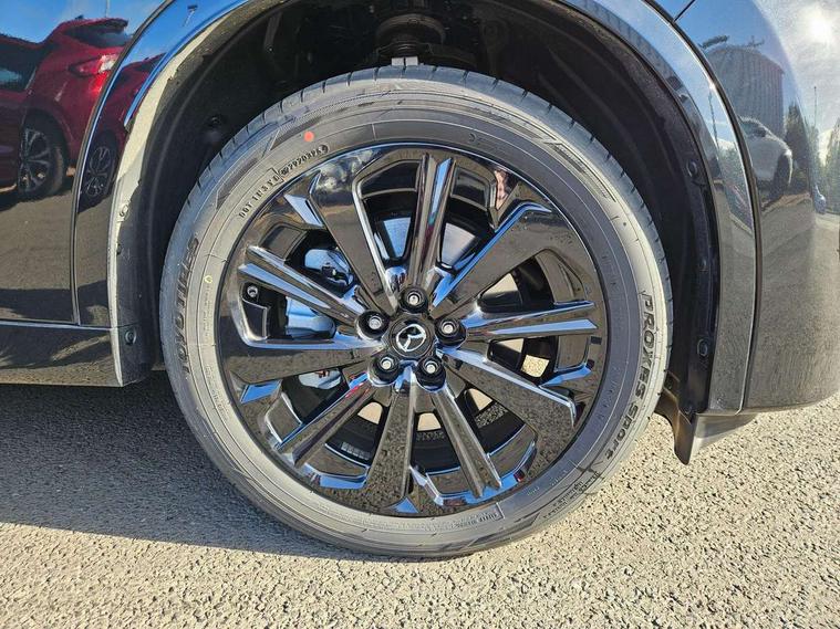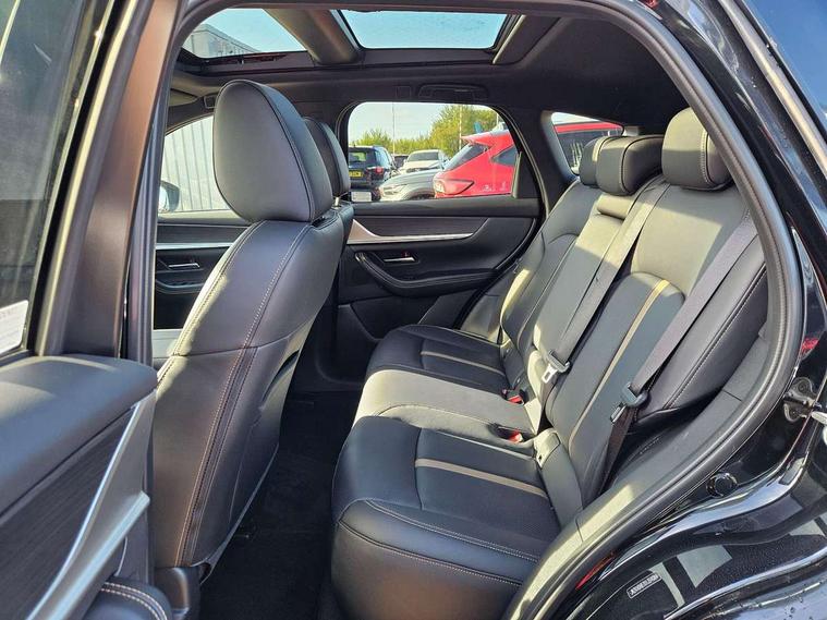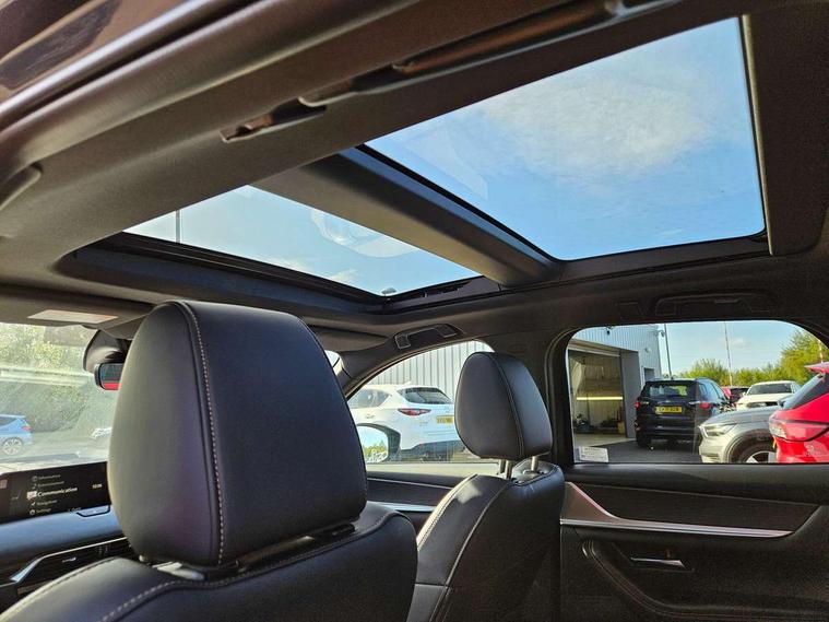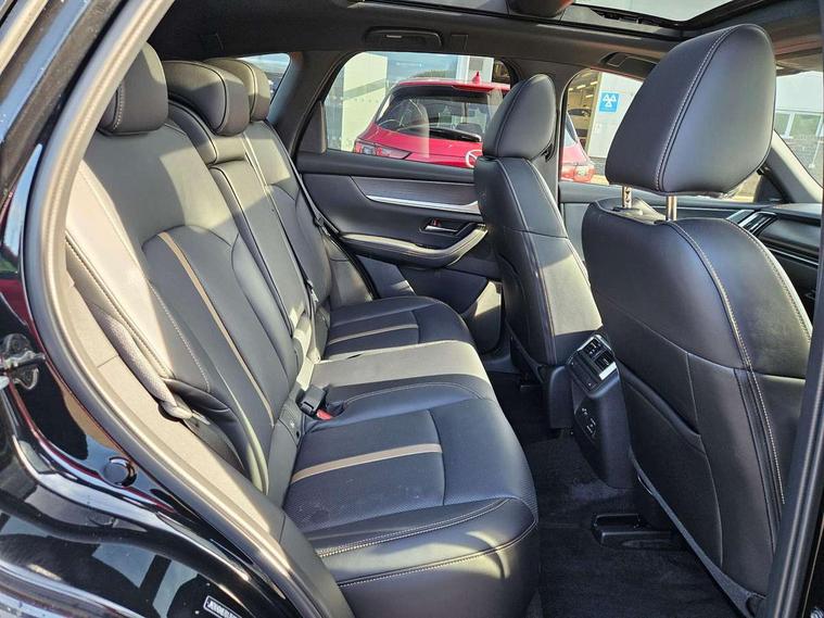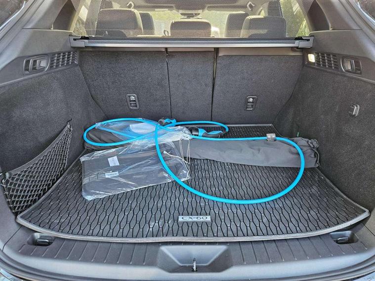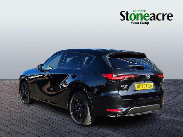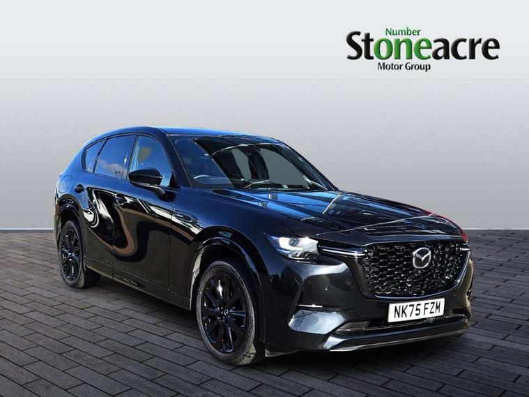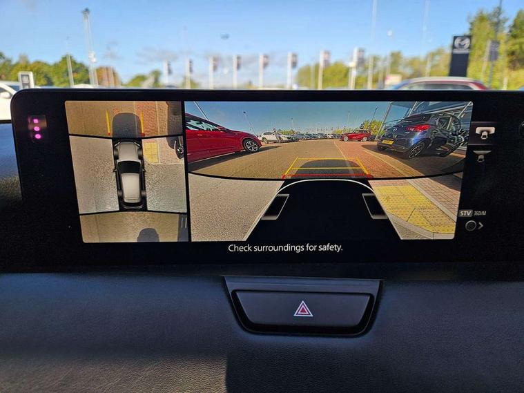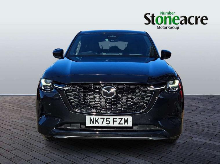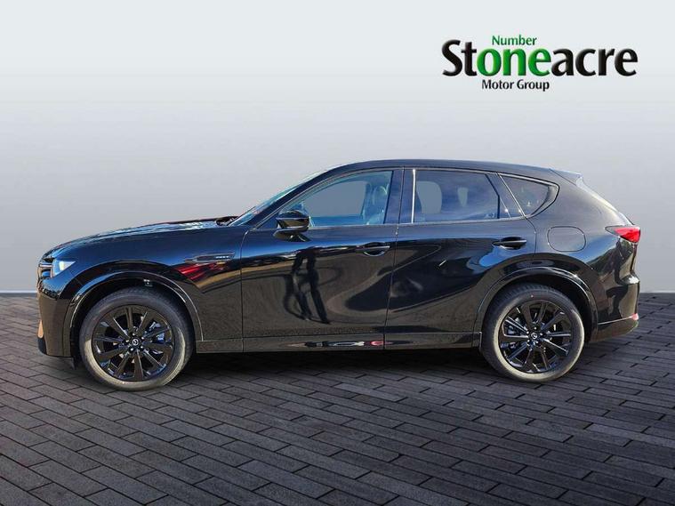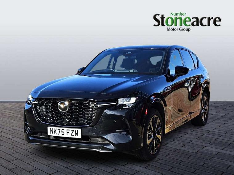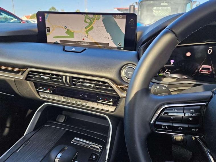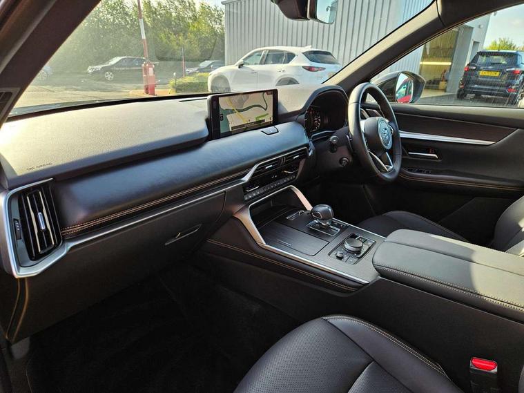 Emergency lane keeping with blind spot assist, Low washer fluid warning light, 12.3" Colour entertainment centre display with mazda connect infotainment, 12.3" TFT Colour display, Adjustable speed limiter, Blind spot assist, Blind spot monitoring with rear cross traffic alert, Distance alert system, Driver attention alert system, Driver Monitoring with personal identification, E-call with GPS, Emergency stop signalling system, Exit warning function, Front and rear parking sensors, Ingress / Egress support and automatic driver position guide, Integrated bluetooth, Intelligent speed assist, Kinematic posture control, Lane keep assist system (LAS) with Lane departure warning system (LDWS), Mazda Driver Personalisation System, Mazda hybrid navigation system with european mapping, Multimedia Commander, PAS, Power lift gate with handsfree function, Power start/stop button, Speed alert, Traffic sign recognition enhanced with mandated excessive speed warning, Trip computer, Windscreen projected colour active driving display, Wireless apple car play/android Auto, Type 2 Mode 2 cable for AC charging via UK 3-pin plug, 7.2 kw On board Charger, Mi-Drive (Normal, Sport, Off-road, Towing and EV mode), Paddle shift, Type 2 Mode 3 cable for AC charging via home or public charge points, AM/FM and DAB radio, Bose surround sound system with 12 Speaker, Bose center point, Bass match and audio pilot technology, Steering wheel mounted audio/bluetooth controls, USB-C inputs (x2 front and x2 rear), Auto dimming driver's door mirror, Automatic headlight levelling, B-pillar and C-pillar garnishes in gloss black finish, Body colour roof spoiler, Body coloured bumpers, Body coloured lower bumper, wheel arch and side mouldings, Coming/leaving home lighting function, Dark plated headlight lense, Dark plating finish signature wing in front grille, Dark plating front side garnish, Differentiated front bumper design to accentuate the intake, Dusk sensing headlights, Electric front/rear windows with one touch auto up/down, Electric panoramic sunroof, Electrically adjustable, heated auto power folding door mirrors with memory, Frameless auto dimming interior rear view mirror, Front kodo turn signal, Front wiper de-icer, Gloss black door mirrors, Headlight washers, High beam control, Honeycomb radiator grille in piano black, LED 3rd brake light, LED rear signature combination lamps, Rain sensing front wipers with adjustable sensitivity and speed, Rear side wing doors, Rear wiper, Roof pillars and roof lining finished in lighter colour to soften the overall look, Signature LED daytime running lights, Silver decoration panel, 12v power outlet - front, 12V socket in boot, 3 height adjustable rear headrests, 3 seat bench in 2nd row, 40/20/40 split folding rear seats with quick levers in the boot, Ambient lighting, Cargo net, Chrome interior trim accents with steering wheel centre bezel, surround of engine start / stop button and glove box handle, Door panel trim vinyl leather with armrest, Driver and front passenger two rear grab handles with rear coat hooks, Driver and front passenger visors with covered vanity mirror and driver ticket holder, Driver seat electric tilt, slide, recline, height and lumbar adjustment, Driver, front passenger and two rear door pockets, Driver/passenger front seatback pockets, Dual zone climate control air conditioning with rear air vents, Electric telescopic and tilt adjustment steering wheel, Featuring black vinyl leather dashboard trim with titanium coloured accents, Folding rear centre armrest with two cup holders, Front centre storage with two cupholders, Front down lamp with front and rear foot lamps, Front headrests, Front passengers seat electric slide, recline, height and lumbar adjustment, Front seat ventilation with 3-stage setting, Glovebox illumination, Heated front seats with 3 stage setting, Heated leather wrapped steering wheel, Heated outer rear seats with 3-stage setting, ISOFIX child seat anchorage points attached on outer rear seats, Karakuri tonneau cover, Leather wrapped gear shift knob, LED illumination luggage compartment, Nappa leather upholstery, Practical and spacious front centre armrest storage, Rear seat recline function for rear passenger comfort, Remote fold down rear seats, Roof lining (ceiling and pillars) - Black, Roof mounted sunglasses holder, Single front passenger seat, Convenience Pack - CX-60 PHEV, Driver Assistance Package - CX-60, 3 point ELR front seat belts x2 with pretensioners, 3 point ELR rear seat belts, Active bonnet, Anti-lock braking system (ABS), Drivers knee airbag, DSC - Dynamic Stability Control, Electronic parking brake with auto disengage function and auto hold function, Front and rear curtain airbags, Front dual stage driver and single stage front passenger airbags, Front passenger airbag cut-off switch, Front side airbags, Front smart city brake support, Hill decent control, Hill launch assist, Manual rear child locks, Seatbelt reminder for driver/front passenger and rear seats, Traction control, Tyre pressure monitoring system (TPMS), Remote central locking with deadlocking and automatic door lock when driving, Smart keyless entry, Thatcham accredited alarm and immobiliser, Mesh metal film centre console panel, 20" Black metallic alloy wheels, Emergency tyre repair kit,