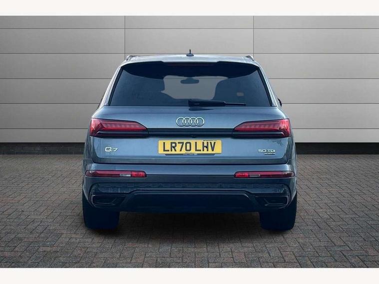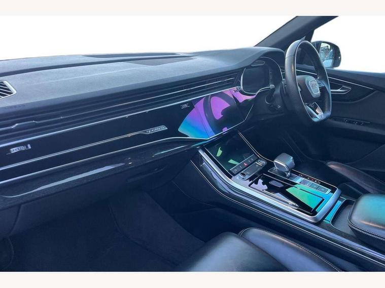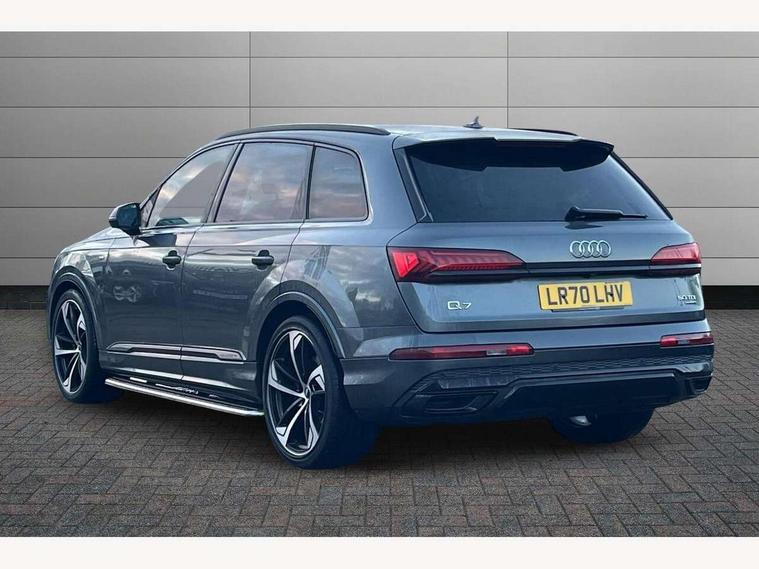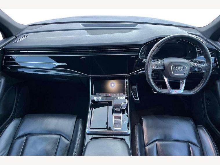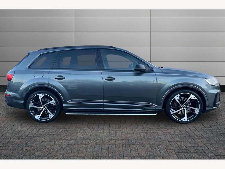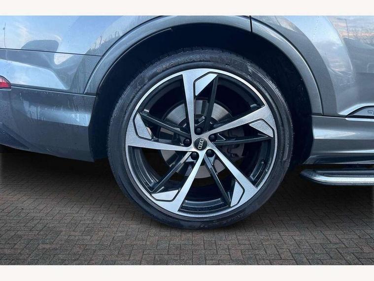 Audi connect safety and service (e-call), Audi drive select (Auto, Comfort, Dynamic, Efficiency, Individual, Off-road and All road), Audi phone box with wireless charging, Audi smartphone interface includes wireless Apple carplay/Android Auto, Camera based traffic sign recognition, Electromechanical steering, MMI navigation plus with MMI touch screens includes 10.1" and 8.6" screens with haptic feedback, Natural voice recognition, Parking system plus - front + rear sensors, PAS, Power operated tailgate, Rear view camera, Start/stop system, 48V Mild hybrid technology, Adaptive air sports suspension, Quattro all wheel drive with self locking centre differential, Audi music interface - front 2 USB-C ports with charger and data functions, Audi sound system with 6 channel amplifier, 180 watt amplifying capacity and 10 loudspeakers including subwoofer, DAB digital radio module, Audi matrix LED headlights with dynamic front and rear indicators, Auto dimming frameless rear view mirror, Black roof rails, Bumpers in contrast paint scandium grey finish includes door trim and wheel arch trim strips, inlays in door strip contain quattro embossing, Electrically adj heated/folding + automatically dimming exterior mirrors with memory + automatic kerb side function for passenger side exterior mirror, Heat insulating glass in windshield, LED daytime running lights, LED rear tail lights, Privacy glass - dark tinted rear and rear side windows from B-pillar backwards, 3 spoke flat bottomed high multi-function leather sport steering wheel with gearshift paddles, 4 zone deluxe automatic climate control, 7 seat layout with ISOFIX points for the front passenger seat and rear passenger seat, Comfort front centre armrest, Folding rear seats, Front head restraints, Front/rear floor mats, Heated front seats, LED interior ambient lighting, Luggage compartment cover, Luggage compartment sill protection in stainless steel, Rear head restraints, Stainless steel pedals, Tool kit, Titanium black styling pack - Q7/SQ7, 3 point seatbelts on all rear seats, Audi pre sense front, Driver and front passenger, front side and curtain airbags, Electromechanical parking brake, Electronic Stabilisation Control (ESC) including ABS, ASR and EDL, Extended pedestrian protection measures, Hill hold assist, Seatbelt monitoring, Tyre pressure loss indicator, Warning triangle and first aid kit, Anti theft alarm, Anti-theft wheel bolts and wheel loosening detection, Keyless go with remote central locking, Polished oak trim with grey finished, Tyre repair kit,