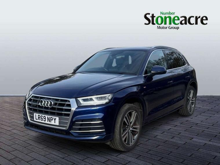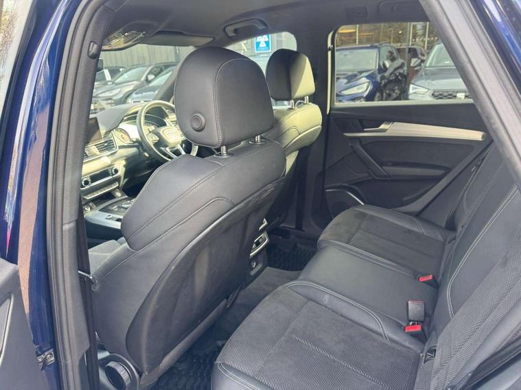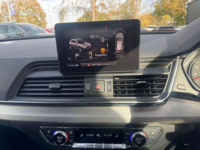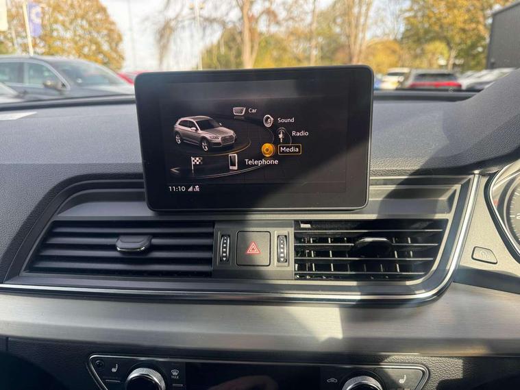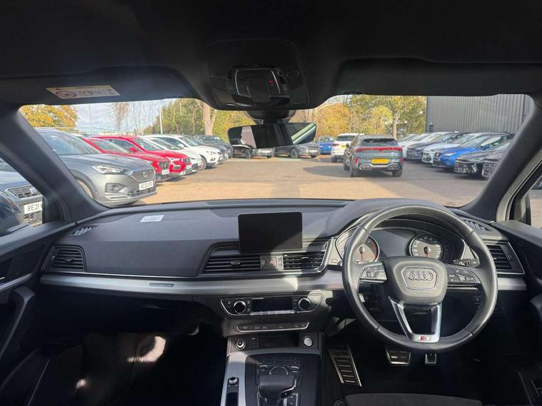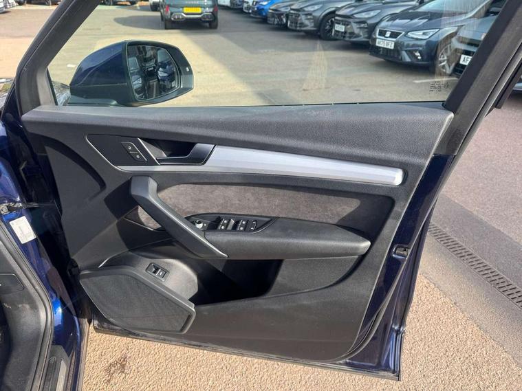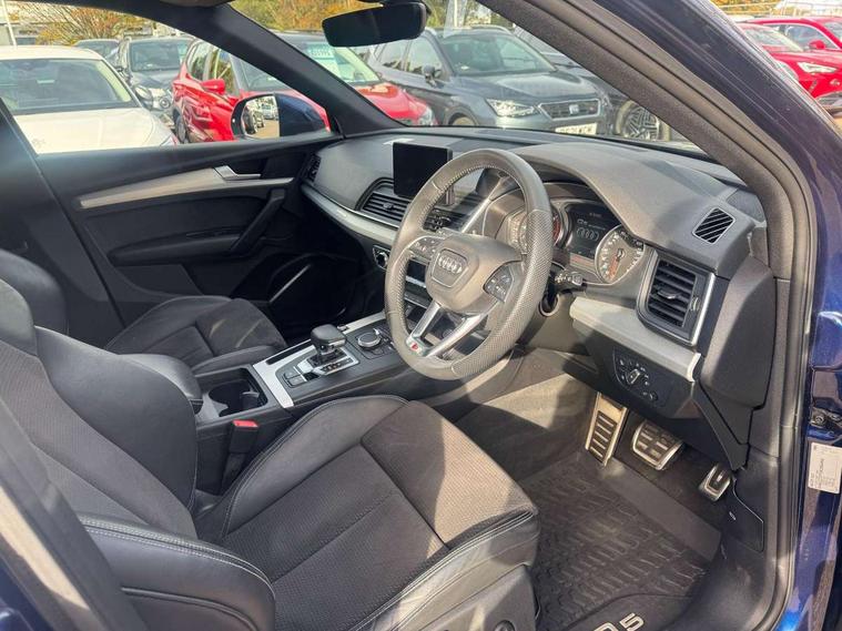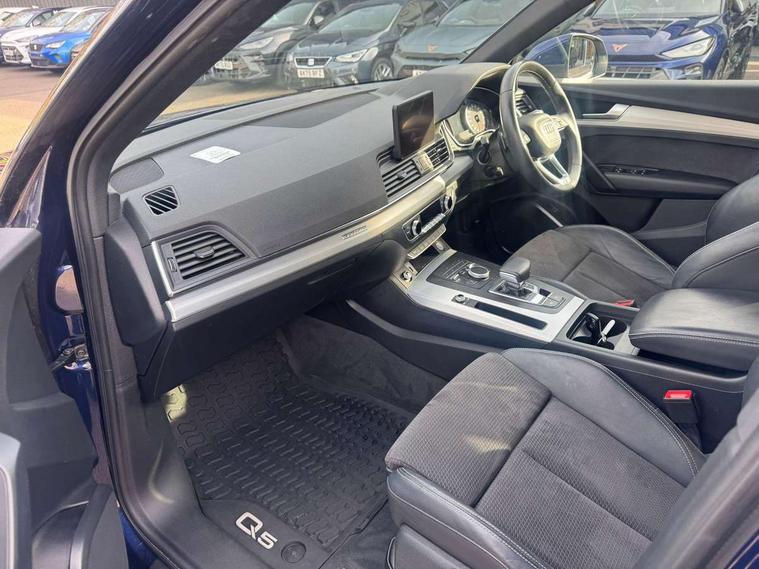 7" Colour driver information system, Audi connect safety and service (e-call), Audi drive select, Audi parking system plus with front and rear sensors, Audi Pre sense collision avoidance, Audi smartphone interface, Automatic start-stop system with coasting functionality and efficiency programme, Cruise control + speed limiter, Electro - mechanical power assisted steering, MMI Navigation, Mobile telephone preparation - bluetooth interface, Power tailgate, Service interval indicator, Voice control system, Dynamic suspension, Quattro on demand, 2x SD card slot, CD player, DAB Digital radio, MMI radio plus with 7" colour MMI screen and MMI controller, Acoustic windscreen, Air inlets in matt titanium black with blades in matt aluminium silver, Aluminium roof rails, Auto dimming rear view mirror, Automatic headlight levelling, Body colour bumpers, Body colour door mirrors, Body colour rear diffuser with matt aluminium silver surrounds, Body colour S Line side skirts, Body colour underbody protection, Chrome exhaust tailpipe, Electric adjustable/heated/folding door mirrors, Front and rear electric windows, High beam assistant, LED headlights with LED rear lights + dynamic rear indicators, Light and rain sensor for auto activation of lights and windscreen wipers, Loading sill protector in stainless steel, Privacy glass with front acoustic glazing, Rear wiper, S front and rear bumpers, S Line badges on the front wings, S Line rear spoiler, Twilight grey matt radiator grille with matt aluminium horizontal chrome struts, 2 x USB charging port with aux input socket, 3 rear headrests, 40:20:40 split folding rear seat with rear centre armrest, Black cloth headlining, Contrast stitching on seats, steering wheel and gear lever gaiter, Deluxe 3 zone electronic climate control, Front centre armrest, Front sport seats with S embossed logo, Front/rear floor mats, Heated front seats, Height adjustable front head restraints, Height/reach adjustable steering column, Illuminated door sill trims with S logo, ISOFIX child seat mounting and top tether, Luggage compartment carpet, Manual seat adjustment with 4-way electric lumbar support, Perforated leather gearknob, Removable luggage compartment floor, Stainless steel pedals, Sunvisors with vanity mirrors, Tool kit, Trunk roller cover, High gloss pack - Q5, LED interior light pack - Q5, Non Smokers pack, 3 point seatbelts on all seats, 6 airbags - Driver, front passenger, curtain and side airbags, Electromechanical parking brake, Electronic stabilisation control including ABS, ASR and EDL, Front passenger airbag deactivation, Hill descent control, Hill hold assist, Multi collision brake assist, Pop-up bonnet for pedestrian protection, Pre sense city, Seat belt force limiter, Seatbelt monitoring, Tyre pressure warning, Warning triangle and first aid kit, Anti theft alarm, Anti-theft wheel bolts, Keyless Go access/ignition system, Remote central locking, Matt brushed aluminium inlays,