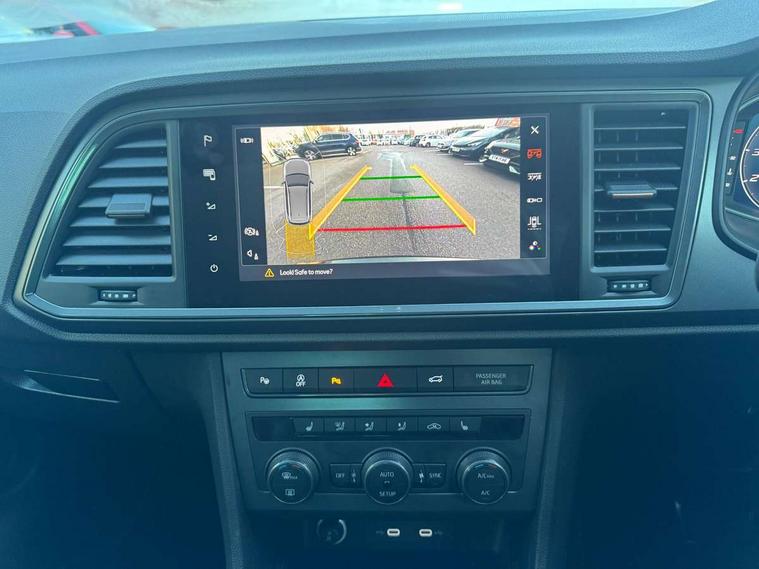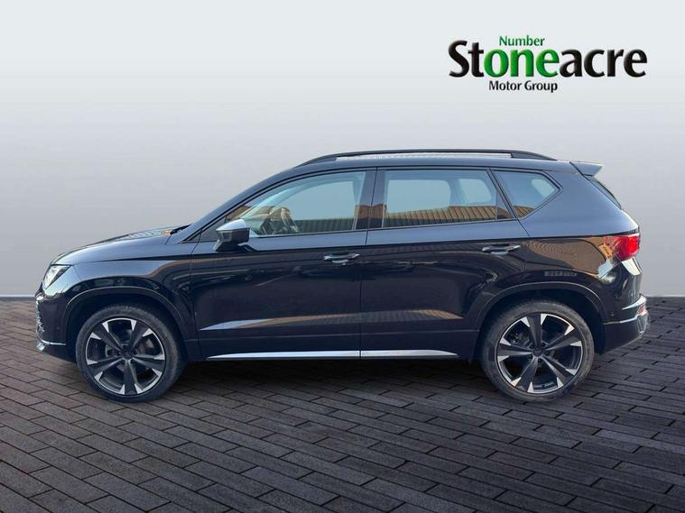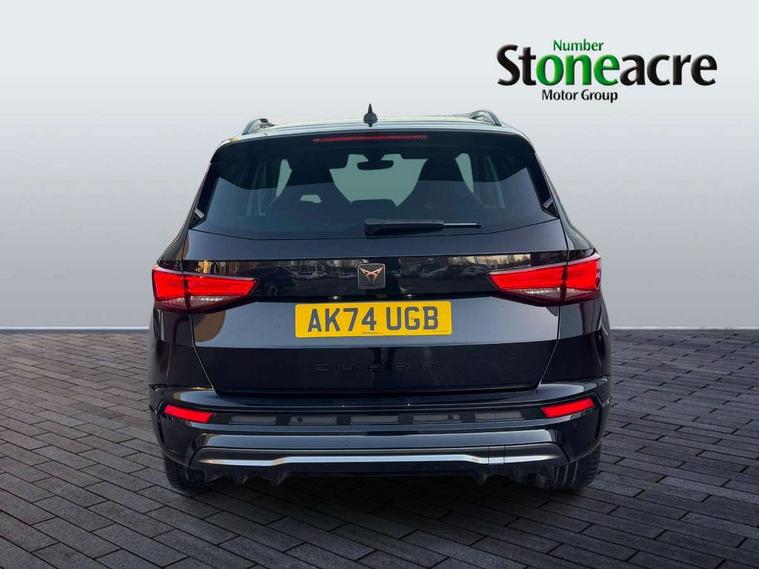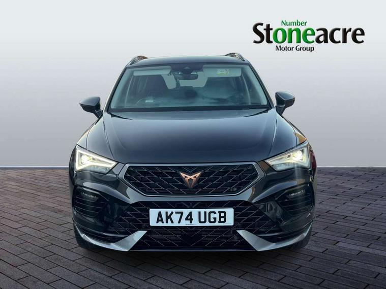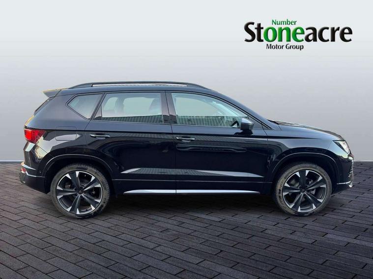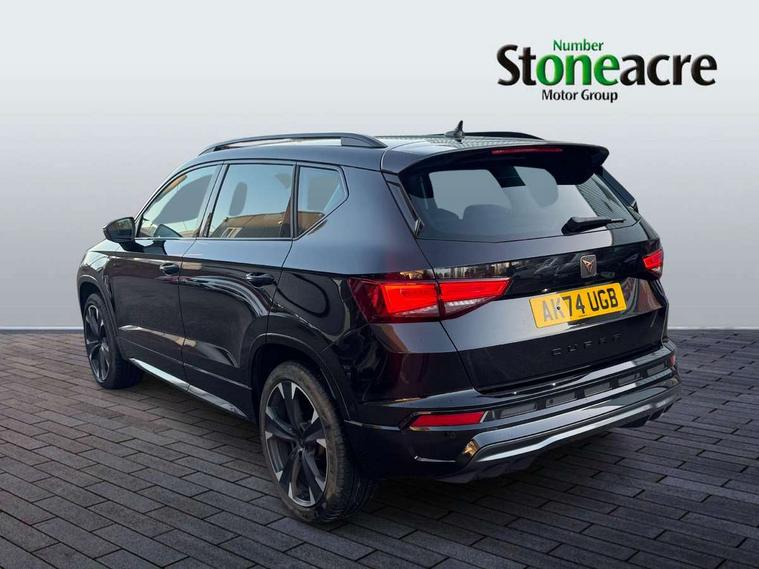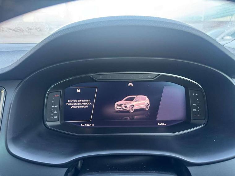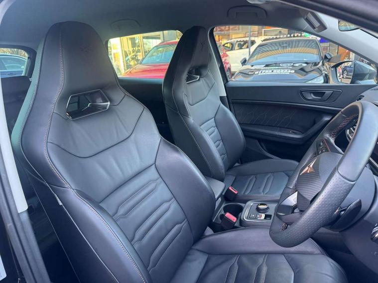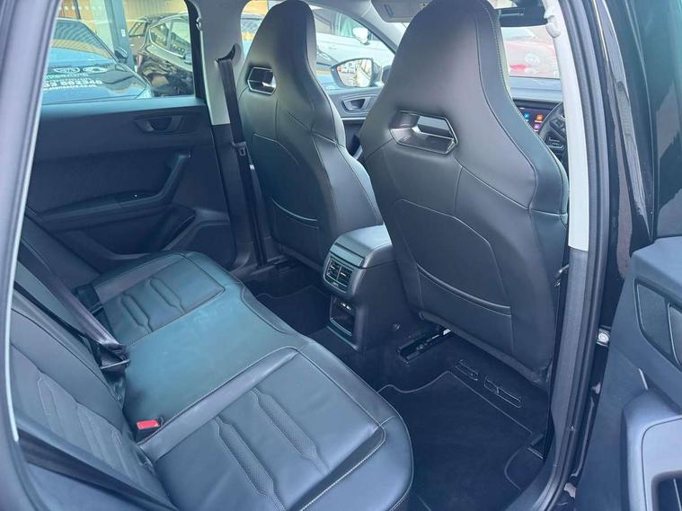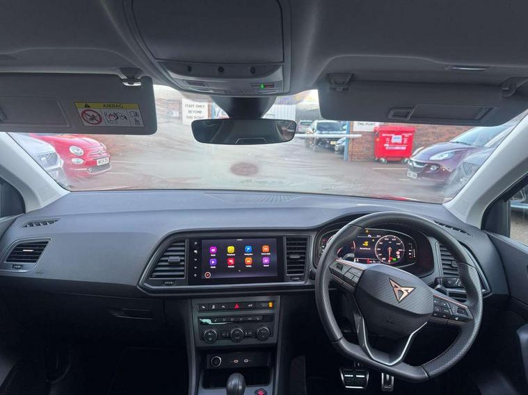 Cruise control system with speed limiter, Digital cockpit, Driving profile selection and conventional shock absorber, E-call, Electric tailgate with virtual pedal, Outside temperature gauge, Progressive power assisted steering, Rear view camera, Self parking functionality (includes front and rear parking sensors), Trip computer, wired and wireless full link smartphone integration, Wireless phone charger, Front and rear shock absorption, chassis with increased ride height, Steering wheel mounted audio/phone controls, Body colour bumpers with dark aluminium diffusor, Body coloured wheel arch surrounds, Dark tinted rear windows, Daytime running lights, Door mirrors with welcome CUPRA light silhouette, Dynamic headlight range control with self adjusting whilst driving, Electric adjustable/heated/folding door mirrors, Front and rear electric windows, Front grille frame in chrome, Full LED headlamps with lens and LED front fog lamps with cornering function, Gloss black door mirrors, Gloss black roof rails, Gloss black side mouldings, Gloss black side window trim, Illuminated aluminium front door sill, LED rear tail lights with dynamic indicators, Rear fog lights, Rear side wing doors, Rear spoiler, Rear wash/wipe, Specific CUPRA design front bumper, Standard rear exhaust tailpipes, Third brake light, 12V socket in front, 3 seat bench in 2nd row, 60/40 split folding rear seat, Aluminium pedals, Cupra steering wheel emblem, Dual zone climate control, Electric driver seat with memory function, Front and rear head restraints, Front centre armrest, Front seat back storage pockets, Grey roof lining, Heated front seats, Heated steering wheel, Height adjustable driver and passenger seat with lumbar adjustment, ISOFIX points in outer rear seats with top tether anchorage points, Leather sport bucket seats, Leather steering wheel and gear knob, Multicoloured ambient lighting with LED interior illumination, Pedal cluster, Rear armrest and easy back seat release mechanism from boot, Single front passenger seat, Sports steering wheel, Steering wheel mounted gearshift paddles, Storage compartment in roof console for sunglass, Storage compartment under driver's seat, Convenience pack - Ateca, Interior lighting pack - Ateca, Navigation system plus pack with DAB - Ateca, Safety and driving pack - Ateca, 3x3 point rear seatbelts, ABS, Traction control system (TCS), Electronic stability control (ESC) and Electronic differential lock system (XDS), Airbags - Driver and front passenger airbag with deactivation, front side, two curtain and driver's knee airbags, Black brake callipers with CUPRA logo, Electric parking brake with auto hold function, Front and rear seatbelt reminder, Front assist with autonomous emergency braking, Hill hold control, Manual rear child locks, Single tone horn, Tiredness recognition system, Tyre pressure monitoring system, Alarm, Keyless entry, Locking wheel bolts, 19" Sport machined alloy wheels 36/3 in black/silver,