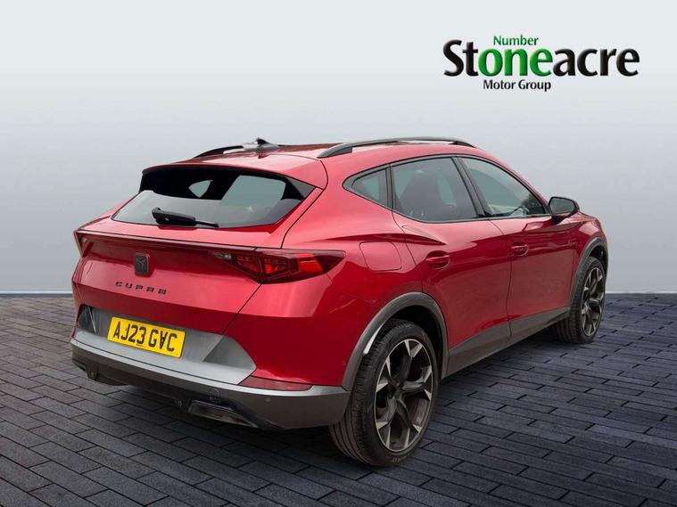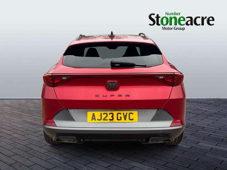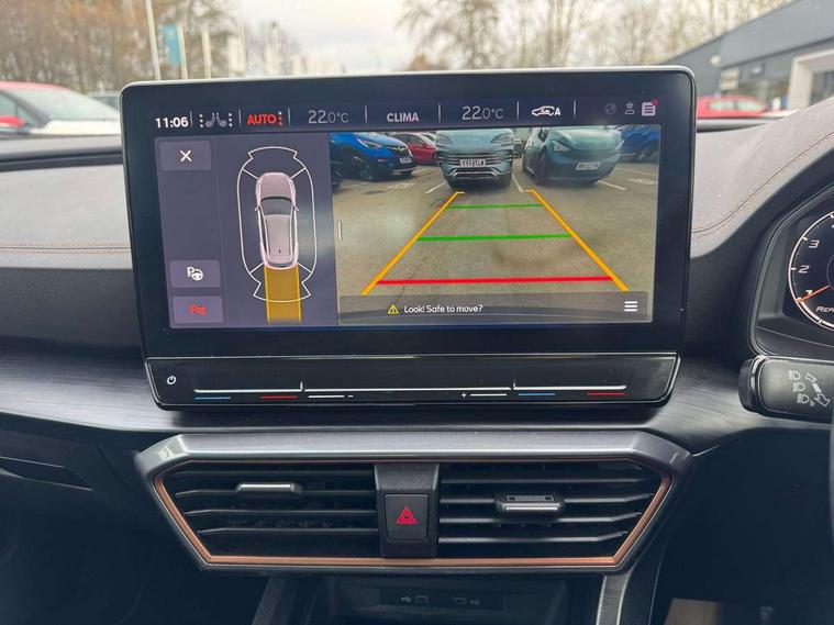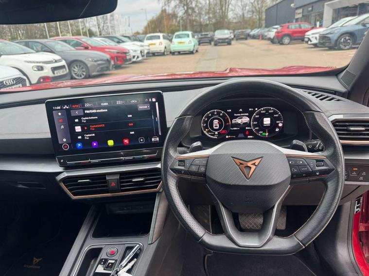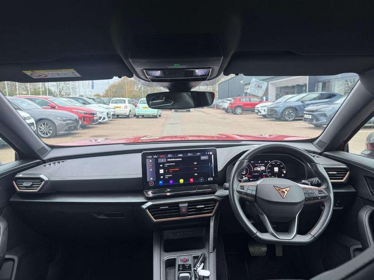 Digital cockpit and configurable dashboard, Driver alert system, Driving profile selection, Forward collision warning with automatic braking, Lane assist, Navigation system with 12'' Touchscreen Display, Park assist (inc front/rear parking sensors), PAS, Predictive adaptive cruise control with speed limiter, Rear view camera, RPM, trip computer, outside temp gauge, instrument light brightness, low fuel warning light, lights on reminder, gearshift indicator, Service interval indicator, Start/stop system with regenerative braking, Voice control system, Wireless apple carplay, Wireless phone charger, Electronic locking differential and dynamic traction support, Standard suspension, 2 front and 2 rear USB type C sockets, Auxiliary input socket, DAB radio, Auto dimming rear view mirror, Body colour door handles, Body coloured bumpers, Dark grey wing mirror, Daytime running light with automatic headlight control and coming home feature, Dynamic headlight range control, Electric front/rear windows, Electrically adjustable heated and folding door mirrors with memory function, Front fog lamps with cornering function, Gloss black roof rails and window surrounds, LED Headlights, LED Taillights with dynamic indicator, Rain sensing wipers, Rear diffuser with black simulated exhaust pipes, Rear side wing doors, Rear wash/wipe, Third brake light, Tinted rear windows, Welcome lights, 12v power supply in centre console, 12V socket, 12v socket in loadspace, 2 front and 2 rear reading lights, 230V socket, 3 seat bench in 2nd row, 60/40 split rear bench seat with armrest and mechanical seat release, Black headlining, Dust/pollen filter, Front and rear head restraints, Front centre armrest, Height/reach adjust steering wheel, Illuminated interior front door sills, Illuminated sunvisor with mirror, Isofix, Leather multi function heated steering wheel with gear shift paddles, Luggage tie-down hooks, Single front passenger seat, Three zone climate control with control panel in rear, Variable luggage/load compartment floor, Wraparound lighting, Genuine Nappa leather Pack - Cupra, 3 point seatbelts on all rear seats, ABS, Brake control system - ESC and brake booster, Child proof door locks, Driver and front passenger airbags with front passenger airbag de-activation, Electronic parking brake, Front and rear disc brakes, Front side curtain airbags, Hill hold control, Public e-call, Seat belt reminder for front and rear seats, Tyre pressure monitoring system, Anti theft alarm system, Keyless entry and start system (KESSY), Locking wheel bolts, Copper and aluminium interior detailing, 19" 'Exclusive' machined sport matte black and silver alloy wheels,