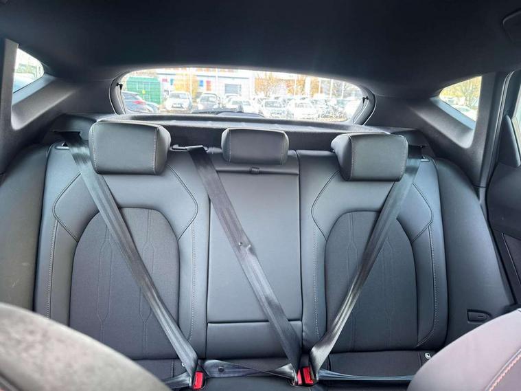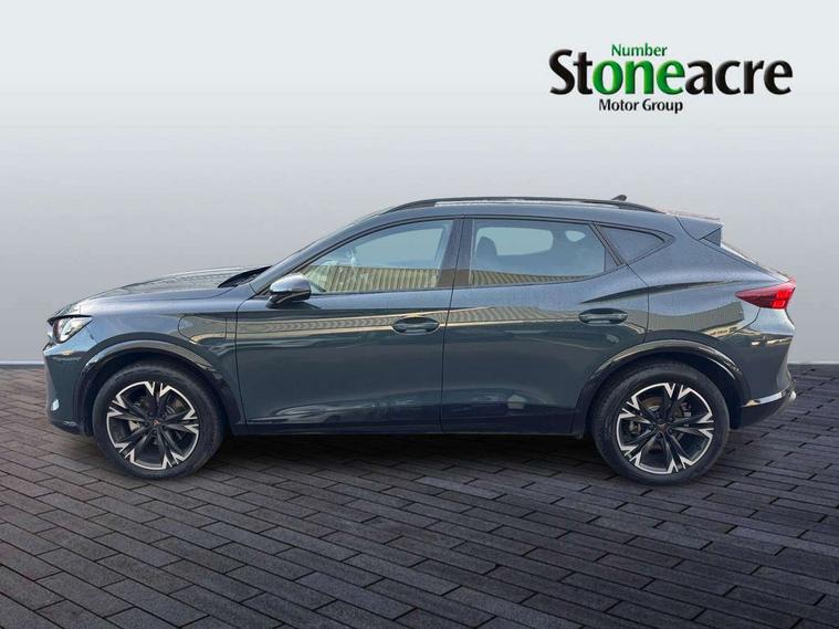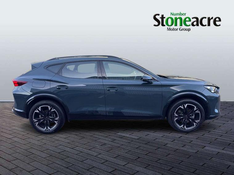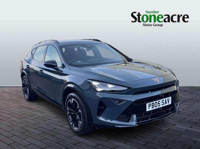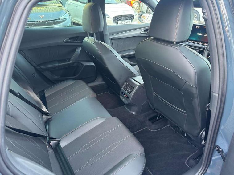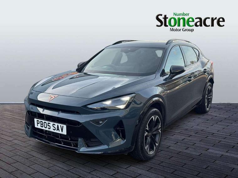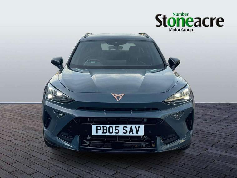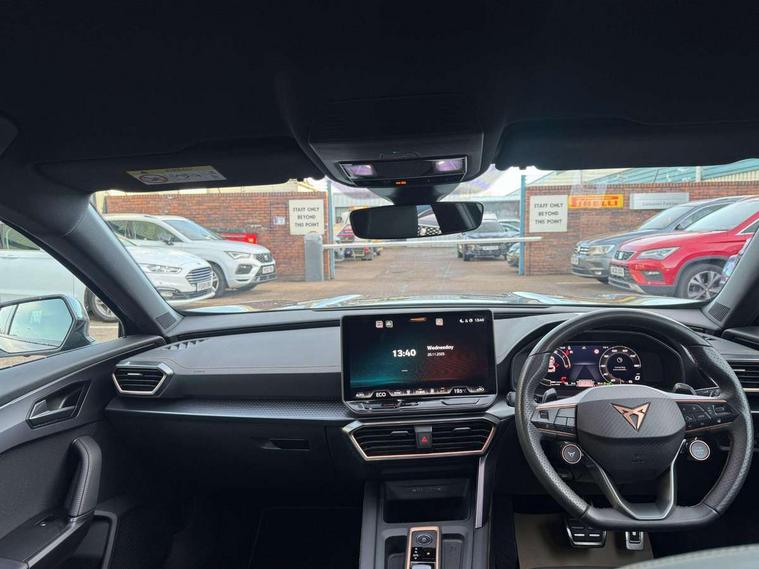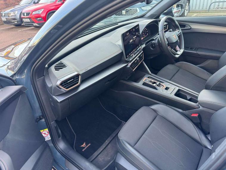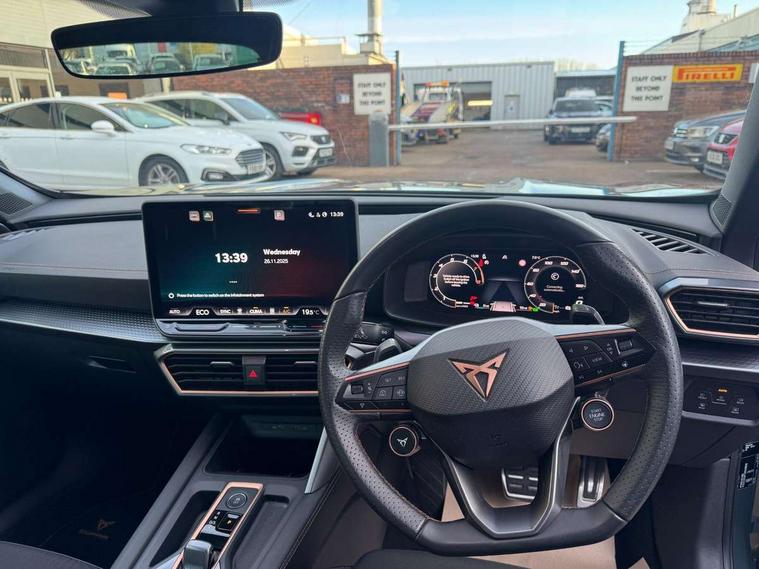 10.25" digital cockpit and configurable dashboard, Adaptive cruise control with follow-to-stop and speed limiter, Advanced driver alert system, Driving profile selection, Dynamic road sign display, Emergency steering support with turn assist, Forward collision warning with automatic braking, Front and rear parking sensors, Full link phone integration, Lane assist, Progressive steering, RPM, trip computer, outside temp gauge, instrument light brightness, low fuel warning light, lights on reminder, gearshift indicator, Service interval indicator, Start/stop system with regenerative braking, Voice control system, Wired Android Auto, Wireless apple carplay, Wireless phone charger, 10 amp mode 2 charging cable, 32 amp mode 3 charging cable, CUPRA sport suspension, Electronic locking differential and dynamic traction support, 2 front and 2 rear USB type C sockets, 7 speakers, Media system with navigation, 12.9" touchscreen display, voice control, DAB, steering wheel mounted controls, Auto dimming rear view mirror, Body colour door handles, Body coloured bumpers, Dark grey wing mirror, Daytime running light with automatic headlight control and coming home feature, Door panel ambient lighting, Dynamic headlight range control, Electric front/rear windows, Electrically adjustable, heated and folding door mirrors, Gloss black roof rails and window surrounds, High beam assist, LED 3rd brake light, LED front fog lamps with cornering function, LED Headlights, LED Taillights with dynamic indicator, Rain sensing wipers, Rear diffuser with copper simulated exhaust pipes, Rear fog lights, Rear side wing doors, Rear wash/wipe, Tinted rear windows, Welcome lights (within exterior mirror housing), 12V socket, 2 front and 2 rear reading lights, 3 seat bench in 2nd row, 60/40 split rear bench seat with armrest and mechanical seat release, Black headlining, Black interior roof lining, Cupra sports pedals, Dust/pollen filter, Front and rear head restraints, Front centre armrest, Heated supersports multifunction leather steering wheel with satellite buttons and gear shift paddles, Height/reach adjust steering wheel, Illuminated aluminium doorsteps, Illuminated interior front door sills, Illuminated sunvisor with mirror, Interior ambient lighting, Isofix, Manually adjustable height and lumbar support for front seats, PVC/Cloth upholstery with copper stitching + Sport seats, Satellite steering wheel, Single front passenger seat, Storage pockets on rear of front seats, Three zone climate control with control panel in rear, 3 point seatbelts on all rear seats, ABS, Brake control system - ESC and brake booster, Child proof door locks, Driver and front passenger airbags with front passenger airbag de-activation, Electronic parking brake, Front and rear disc brakes, Front side curtain airbags, Hill hold control, Public e-call, Seat belt reminder for front and rear seats, Tyre pressure monitoring system, Anti theft alarm system, Central locking system Keyless Go, Locking wheel bolts, Copper and aluminium interior detailing, 18" Sonora machined silver alloy wheels, Breakdown and tool kit,