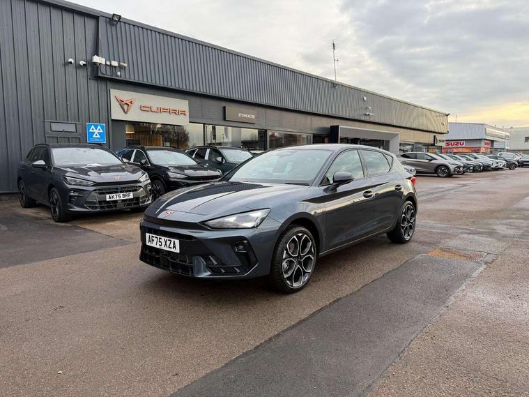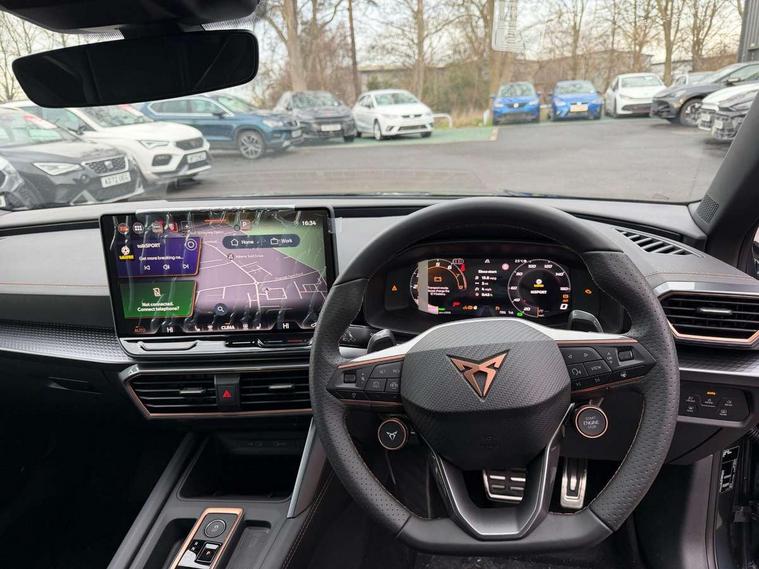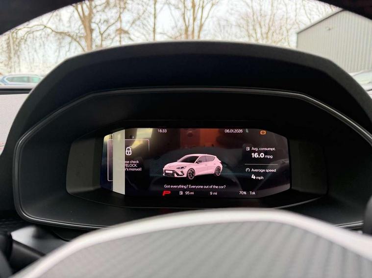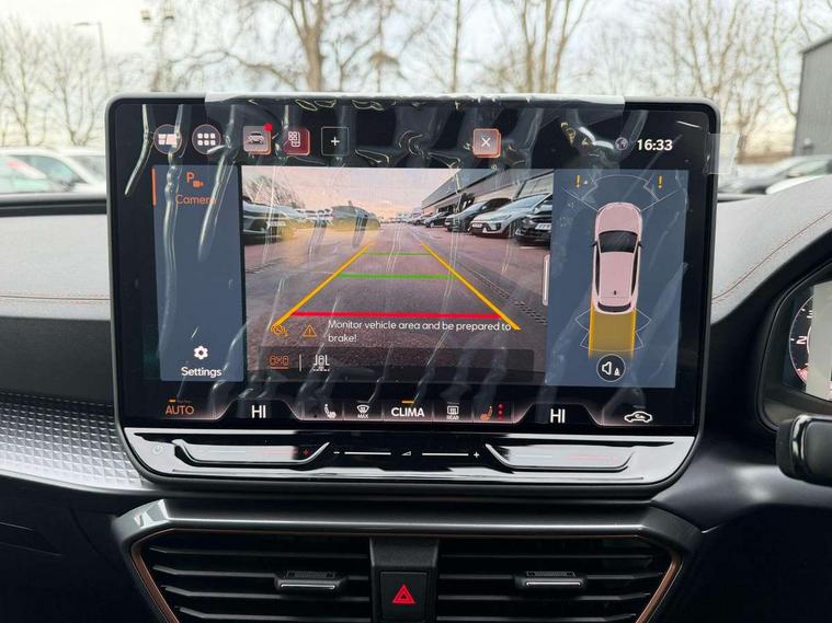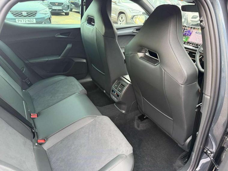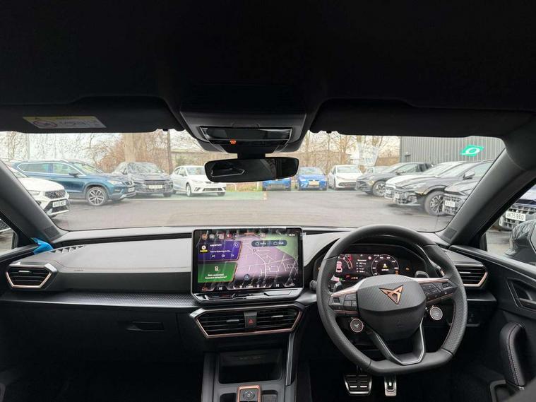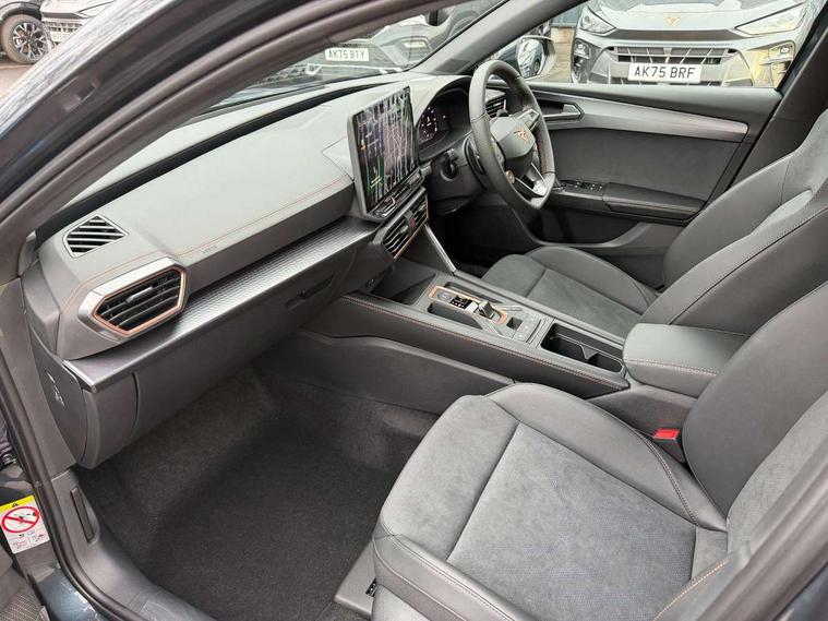 Adaptive cruise control with follow-to-stop and speed limiter, CUPRA drive profile selection with (Comfort/Sport/Individual), throttle response and gearshift mode, Digital cockpit, Dynamic road sign display, E-call, Front and rear parking sensors, Front assist with forward collision warning braking reaction to vehicles, pedestrians and cyclists, Full link smartphone integration with Mirror Link, wireless Apple CarPlay and wired Google Android Auto, Lane assist, Lockable tailgate, Rear view camera, RPM, trip computer, outside temp gauge, instrument light brightness, low fuel warning light, lights on reminder, gearshift indicator, Service interval indicator, Start/stop system with regenerative braking, Wireless phone charger, Auxiliary input socket, Auto dimming rear view mirror, Body colour door handles, Body coloured bumpers, Cupra sports bumpers, Dark tinted rear windows, Electric front/rear windows, Electrically adjustable, heated and folding door mirrors, High beam assist, LED front fog lamps with cornering function, LED headlights with dynamic turn signals, tail lights, rear fog lights with rear coast to coast lighting, LED rear fog lamp, Rain sensing wipers, Rear side wing doors, Rear wash/wipe, Separate daytime running light with automatic headlight control and coming home feature, Third brake light, Welcome light with logo projector in door mirrors, 12v power supply in centre console, 3 seat bench in 2nd row, 5 headrests, 60/40 split rear bench seat with armrest, Ambient lighting (glovebox, footwell, ambient lighting multicoloured), Black headlining, Cupra sports pedals, CUPRA Supersports, heated steering wheel with satellite buttons, Dinamica cloth upholstery, Electrically adjustable driver seat and lumbar support with memory function + manually adjustable passenger seat, Folding boot cover, Four x USB Type C ports (2 in front and 2 in rear), Front and rear reading lights X 4, Front centre armrest, Heated front seats, Height/reach adjust steering wheel, Illuminated interior front door sills, Interior wraparound lighting, ISOFIX points in outer rear seats with top tether anchorage points, Single front passenger seat, Storage pockets on rear of front seats, Sunvisors with illuminated mirror, Three zone climate control, Dynamic and comfort pack - Leon Cupra, Media system plus with 12.9" display + navigation pack - Leon Cupra, 3 point seatbelts on all rear seats, ABS, Brake control system - ESC and brake booster, Child proof door locks, Cupra black brake calipers, Driver and front passenger airbags with front passenger airbag de-activation, front side and curtain airbags, Electronic parking brake, Hill hold control, Rear disc brakes, Seat belt reminder for front and rear seats, Tiredness recognition system, Tyre pressure monitoring system, Anti theft alarm system with interior monitoring in cab, backup horn and towing protection, KESSY Advanced - Keyless start, keyless entry, Locking wheel bolts, Chrome and copper interior detailing, 19" Polar machined sport black and silver alloy wheel with 91Y tyres, Tool kit,