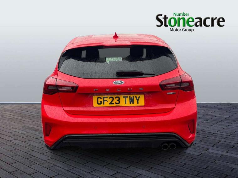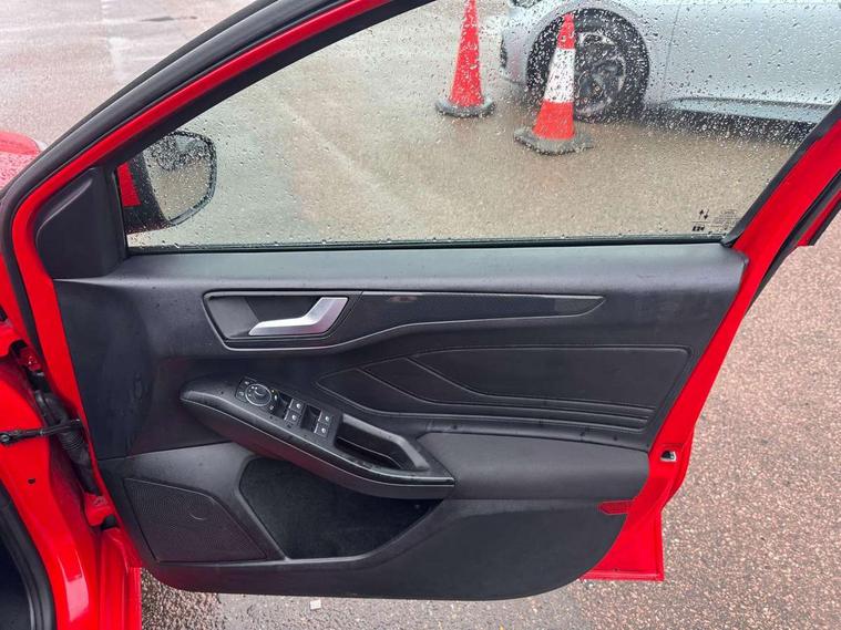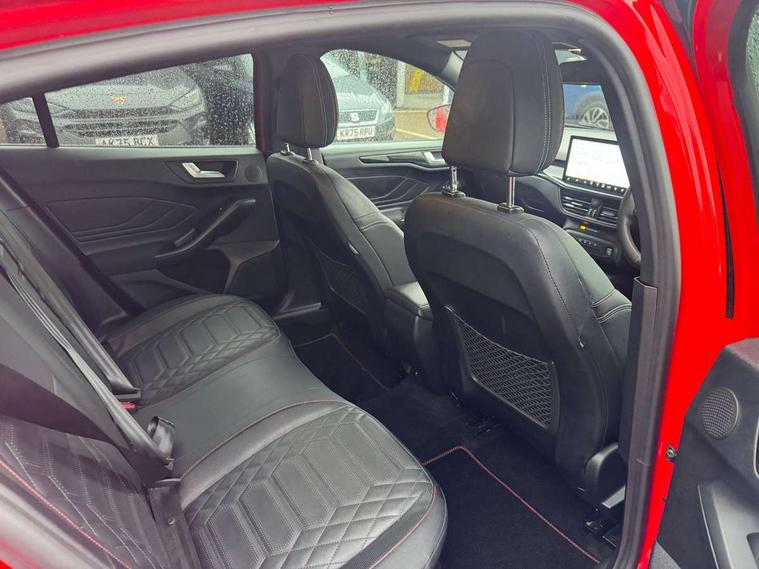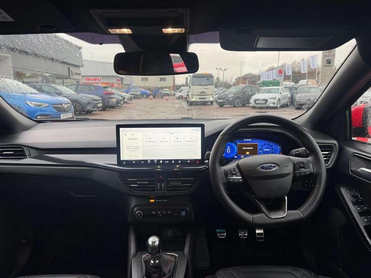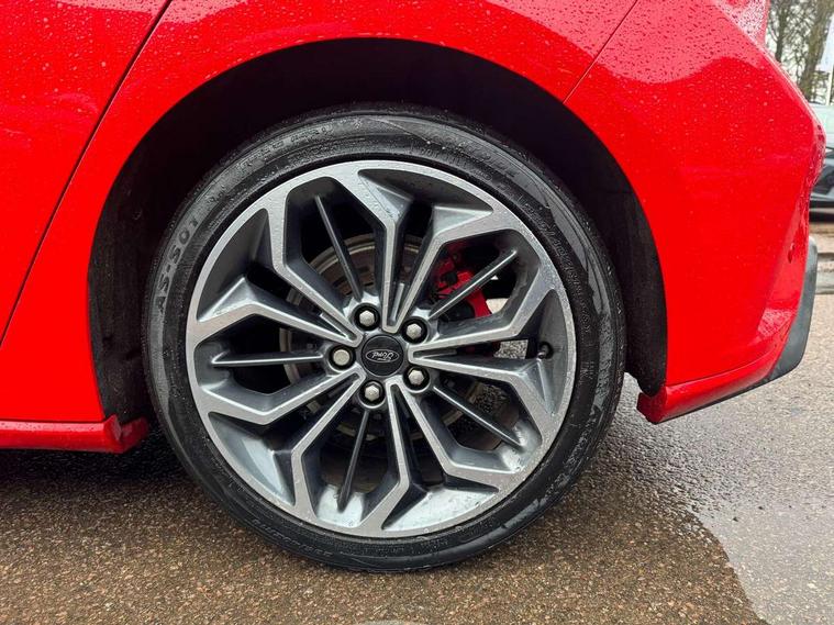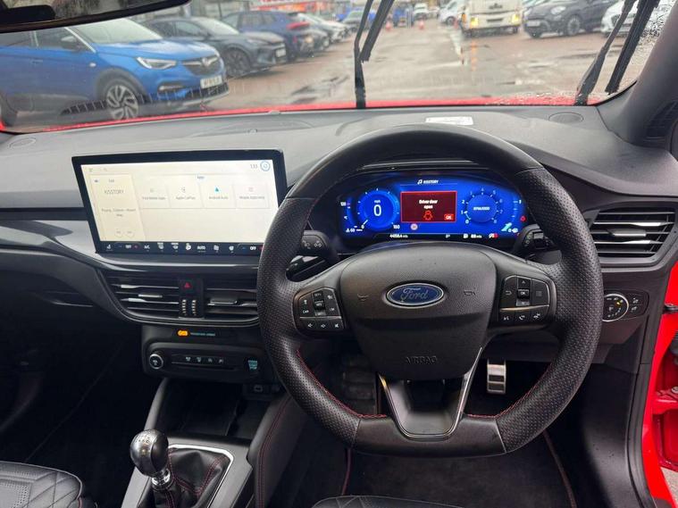 12.3" Digital instrument cluster, Bluetooth system, Digital clock, E-call, Easy fuel capless refuelling system, Eco mode, Ford SYNC 3 navigation with 8" TFT touchscreen, DAB radio and app link Android auto/Apple carplay, Intelligent speed assist, Lane keeping system - lane keeping alert and lane keeping aid, PAS, Selectable drive mode, Trip computer, Sports tuned suspension, 2 USB ports, Aux input, Auto dimming rear view mirror, Auto headlamps (on/off), Automatic rain sensing wipers, Body colour large rear spoiler, Body coloured bumpers, Body coloured door handles, Body coloured electrically operated and heated door mirrors with side indicators, Electrically operated front and rear windows with one touch opening and closing, Front variable intermittent wipers with electric wash, Heated rear window, LED daytime running lamp, Polished twin tailpipe, Power folding door mirrors with puddle lights, Quickclear heated windscreen, Rear privacy glass, Rear side wing doors, ST-Line upper and lower grille with full body styling kit and wing badges, Tailgate wash/wipe, Third brake light, Unique door and instrument panel inserts, 3 seat bench in 2nd row, 3 spoke flat bottomed Sensico steering wheel with red stitching, 6 way power adjustable driver seat, Aluminium gear knob, Dark headliner, Driver's lumbar support, Dual zone electronic air temperature control, Front and rear floor mats with red stitching, Heated driver and front passenger seats, Heating for Sensico steering wheel, Height adjustable front headrests, Isofix child seat preparation, Reach + rake adjustable steering column, Rear centre headrest, Sensico premium upholstery, Single front passenger seat, Soft console knee pads with red stitching, 3x3 point rear seatbelts, ABS+Electronic Brake force Distribution, Auto hold function, Driver airbag, Electronic parking brake, Electronic stability control, Front and rear seatbelt reminder, Front inertia reel height adjustable seatbelts with pre-tensioners, Front passenger airbag, Front side airbags, Hill start assist, Passenger airbag deactivate switch, Post collision braking, Pre collision assist with autonomous emergency braking and pedestrian/cyclist detection, Remote/power child rear door locks, Side curtain airbags, Three rear inertia reel lap/diagonal seatbelts, Tyre pressure monitoring system, Ford keyfree system with Keyless entry and keyless start/sleep mode key fob, MyKey system, Remote central locking & engine immobiliser, Thatcham category 1 alarm, 18" 5x2 spoke gloss black machined finish alloy wheels, Mini steel spare wheel,