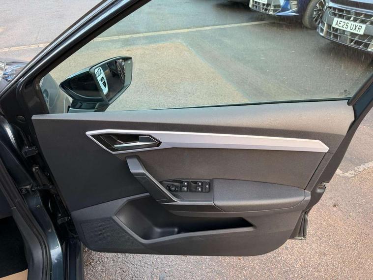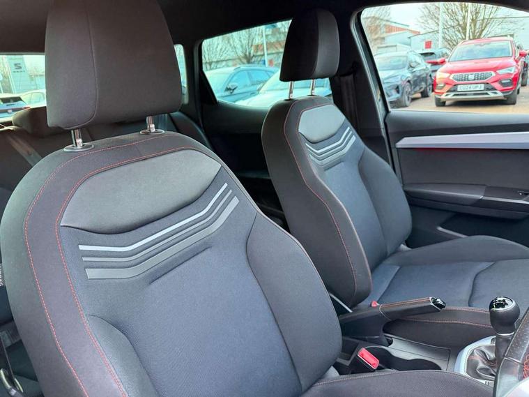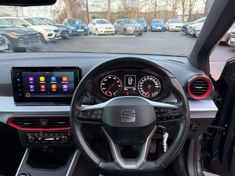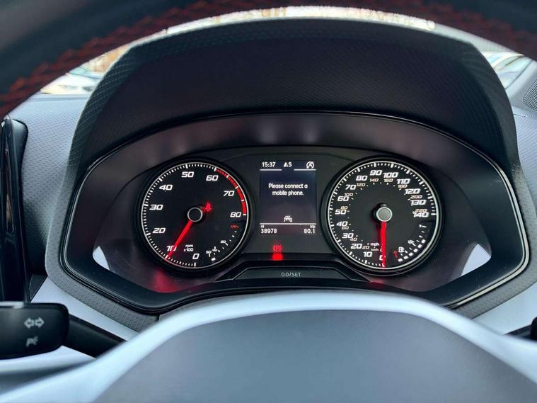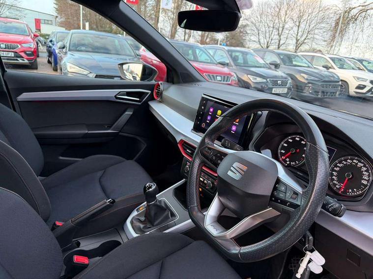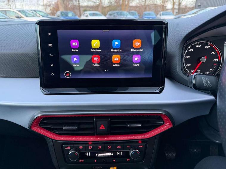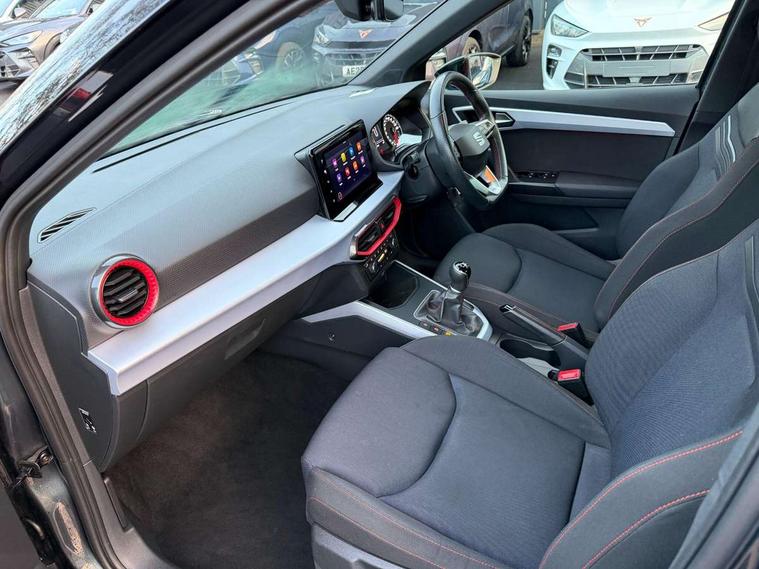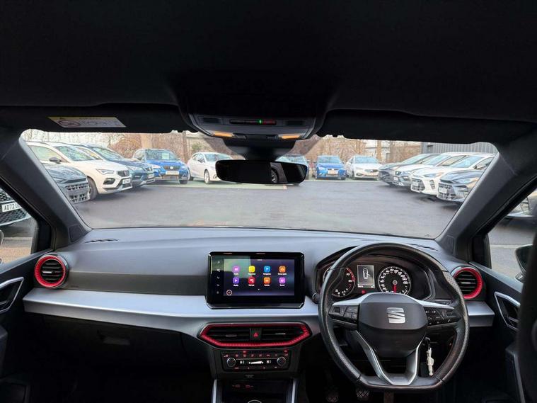 'Lights On' Reminder warning buzzer, 8" Digital cockpit, Digital clock, E-call, Electric speed sensitive power steering, Full Link Smartphone Integration with Mirror Link, Apple Car Play, Google Android Auto with USB Type C cable for Apple and Android compatibility, Lane keeping system, Low fuel warning light, Outside temperature display, Rear parking sensor, RPM counter, Seat connect with safety, service, remote and online, SEAT Drive profile - Four different models normal-sport-eco-individual, steering response, throttle response, Trip computer, Wireless phone charger, 9.2" colour touchscreen with navigation system, voice control and USB port (type c), Bluetooth interface for hands free and audio streaming, DAB digital radio and AM/FM radio, Steering wheel mounted audio controls, Anti theft roof antenna, Auto dimming interior rear view mirror, Automatic activation of hazard warning lights, Body coloured bumpers, Body coloured door handle inserts, Chrome roof rails and window surrounds, Dark tinted rear windows, Electric front/rear windows, Electrically adjustable, heated and folding door mirrors, Front fog lights with cornering function and rear fog light, FULL LED automatic headlights with dynamic headlight range control, coming and leaving home, LED daytime running lights, LED rear tail lights and licence plate lights, Protective side mouldings, Rain sensing wipers, Rear side wing doors, Rear spoiler, Rear window wash/wipe, Roof colour door mirrors, Third brake light, Twin exhaust pipe styling hidden exhaust pipe, Visible VIN plate, Windshield wiper with intermittent control and potentiometer, 2 cupholders, 3 seat bench in 2nd row, 60/40 split folding rear seat, Aircare filter, Black interior roof, Cloth upholstery, Double boot floor, Driver sunvisor with covered mirror + card holder, Dual zone climate control, Front courtesy light with front and rear reading lights, Front sport seats, Gear shift indicator, Height adjustable front seats, Height/reach adjustable steering column, Illuminated boot, Instrument lighting with brightness control, Interior ambient lighting, Interior light in footwell, central console and door panel, ISOFIX points in outer rear seats with top tether anchorage points, Passenger sunvisor with vanity mirror, Perforated flat bottomed leather steering wheel/gear knob/handbrake with red stitching and FR logo, Single front passenger seat, Two front and three rear height adjustable headrests, Interior chrome pack - Arona, 3 point seatbelts on all rear seats, ABS, Active front headrests, Child locks on rear doors, Driver and front passenger airbags with front passenger airbag de activation, front side and curtain airbags, Electronic stability control, Emergency Brake Assist (EBA) and front assist, Front and rear seatbelt reminder, Hill hold control, Multi-Collision braking, Tiredness recognition system, Traction control, Tyre pressure monitoring system, Alarm with back-up horn, Electronic engine immobiliser, Locking wheel bolts, Remote central locking + deadlocks, Tow away protection, Titan black dashboard, 17" Dynamic alloy wheels,